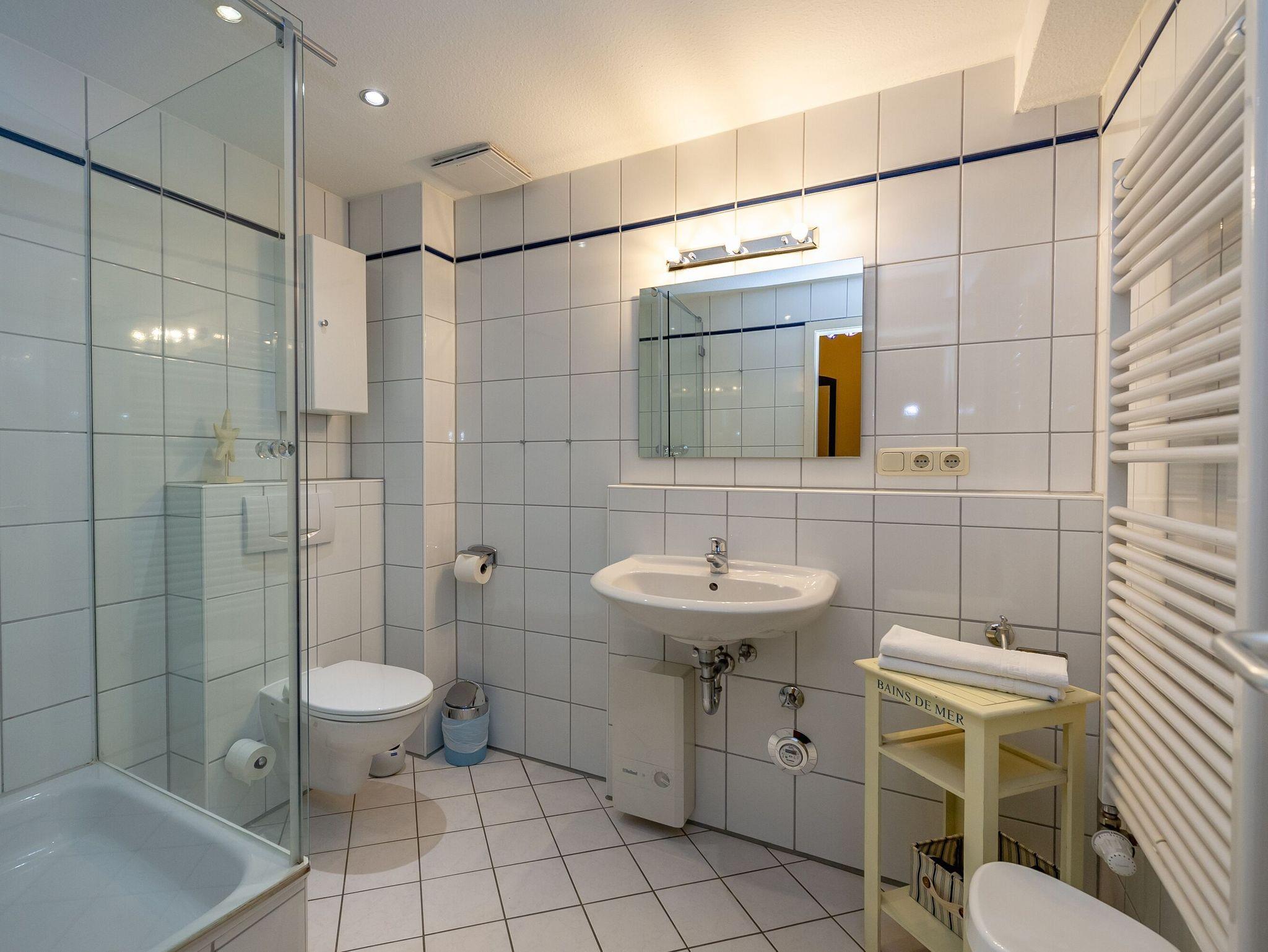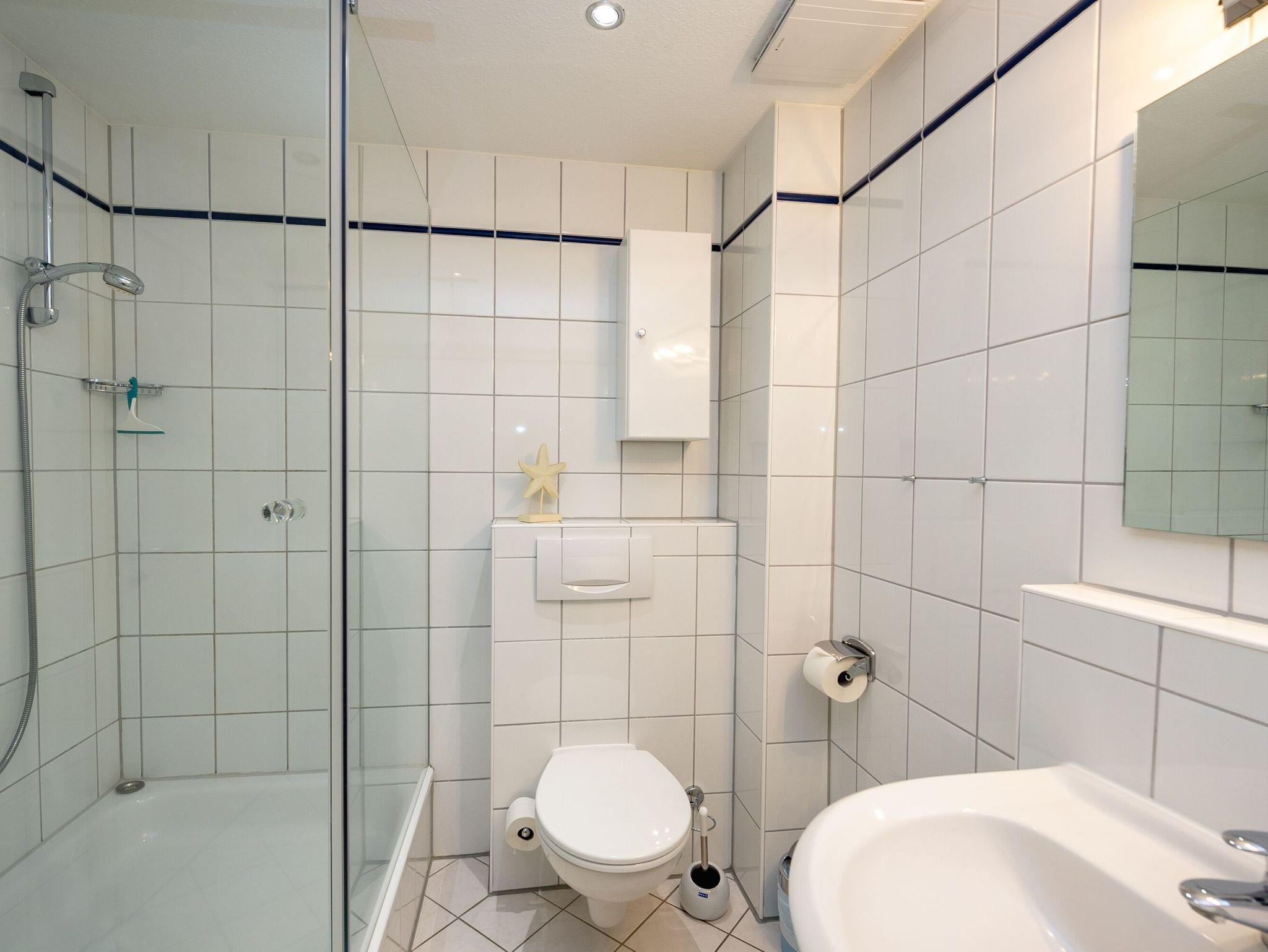 Das Appartement verfügt über ein großzügiges innenliegendes Badezimmer mit Dusche/WC, Waschbecken, Spiegel, Fön und einem Handtuchtrockner.