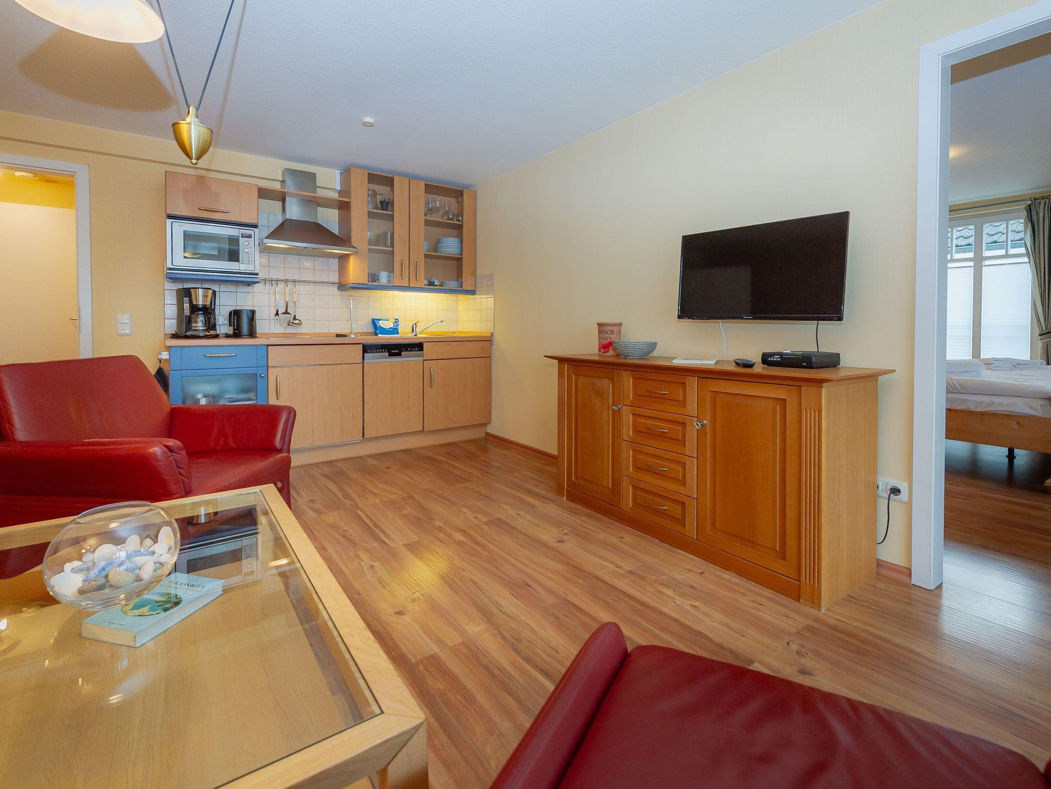 Dieses Nichtraucherappartement ist für zwei Personen ideal geeignet, kann durch die Aufbettungsmöglichkeit im Wohnbereich aber auch mit bis zu 4 Personen gebucht werden. Ihr gut erzogener Vierbeiner ist nach Absprache und gegen Gebühr ebenfalls herzlich willkommen.