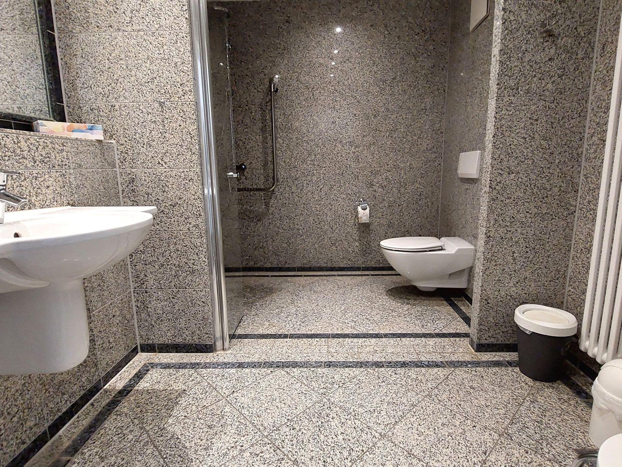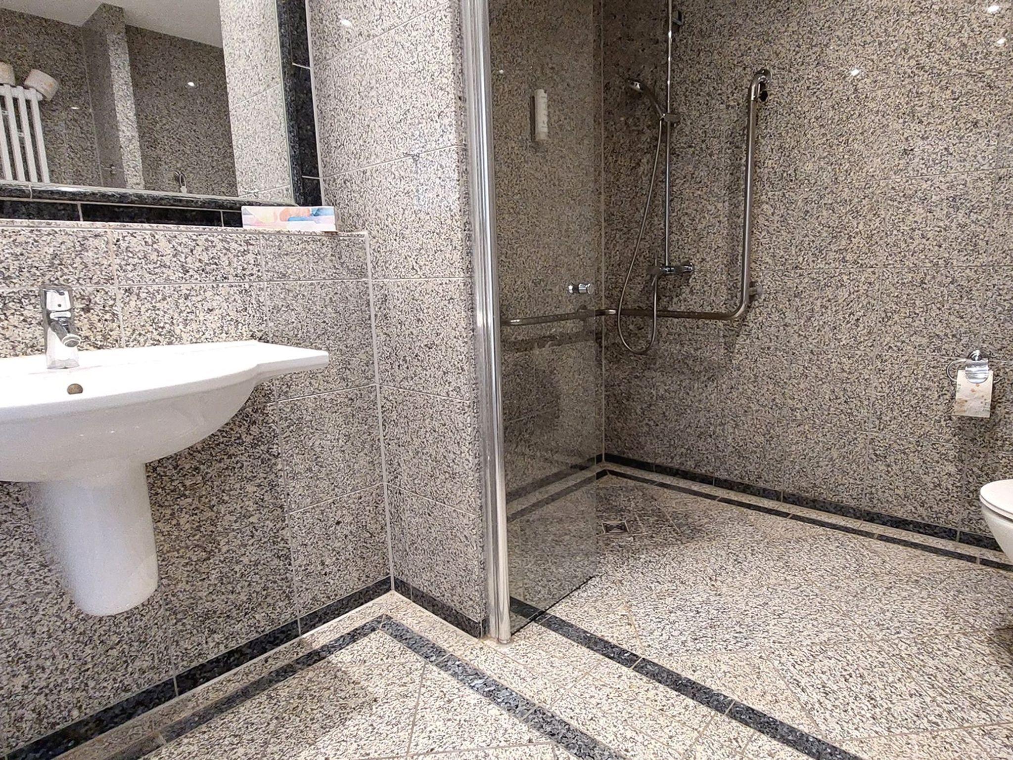 Das Badezimmer ist in Marmoroptik gehalten und verfügt über eine Toilette, einen Waschtisch, eine ebenerdige Dusche, einen Kosmetikspiegel und einen Fön.