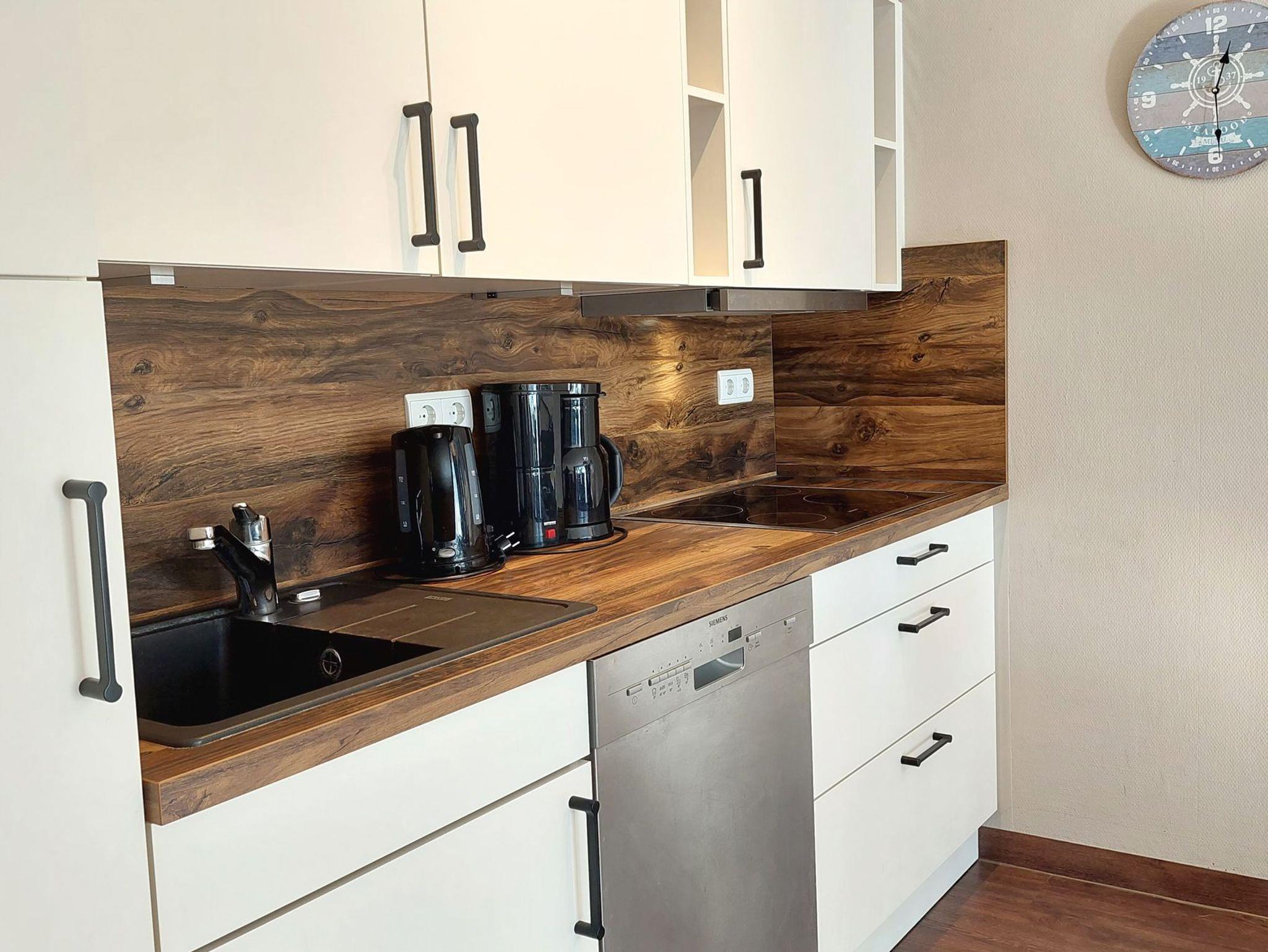 Der Wohn- und Essbereich beherbergt eine moderne Küchenzeile mit Ceran-Kochfeldern, einem Geschirrspüler, einem Kühlschrank mit Gefrierfach, einer Mikrowelle und verschiedenen Küchenutensilien. Der Essbereich bietet Platz für 4 Personen und eine gemütliche Sitzlandschaft lädt zum Verweilen ein. Zur technischen Ausstattung gehören kostenfreies WLAN, ein Smart-TV samt Blu-ray-Player und eine kleine Musikanlage.