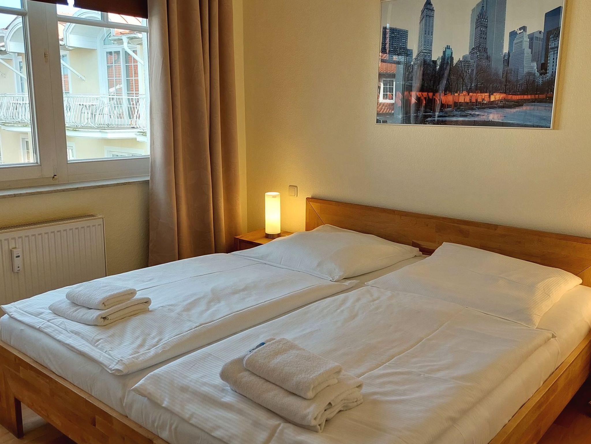 Im 2. Obergeschoss befindet sich das Hauptschlafzimmer, die Küche mit Essplatz und Zugang zum Balkon in Richtung Ostsee sowie das Badezimmer mit Waschtisch, Dusche, WC und Fön. Im separaten Schlafraum finden Sie ein Doppelbett und einen Kleiderschrank. Die Küchenzeile ist mit Cerankochfeld, Backofen, Geschirrspüler, Mikrowelle und diversen Kleingeräten komplett ausgestattet. Die Verbindung zwischen dem 2. und dem 3. Obergeschoss schafft eine geräumige Wendeltreppe. Das gemütliche Wohnzimmer sowie das weitere Schlafzimmer befinden sich im 3. Obergeschoss und erstrecken sich über die gesamte Breite des Hauses. Hier befindet sich eine gemütliche Sitzgruppe mit Schlaffunktion, ein Flachbildfernseher, DVD-Player (samt Filmauswahl) und ein kostenfreier WLAN-Zugang sowie eine Wohngalerie mit einem schönen Blick auf die Promenade und die Ostsee. Der zweite Schlafbereich ist mit zwei Einzelbetten ausgestattet. Hier haben Sie den Zugang zur sonnigen Dachterrasse in Richtung Süden.