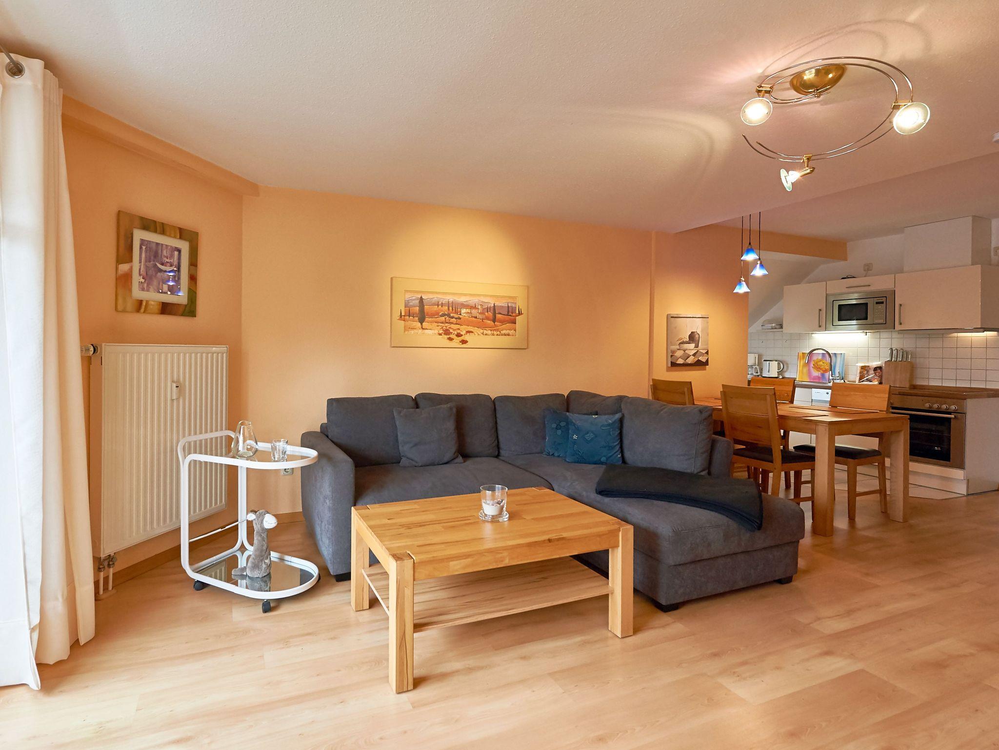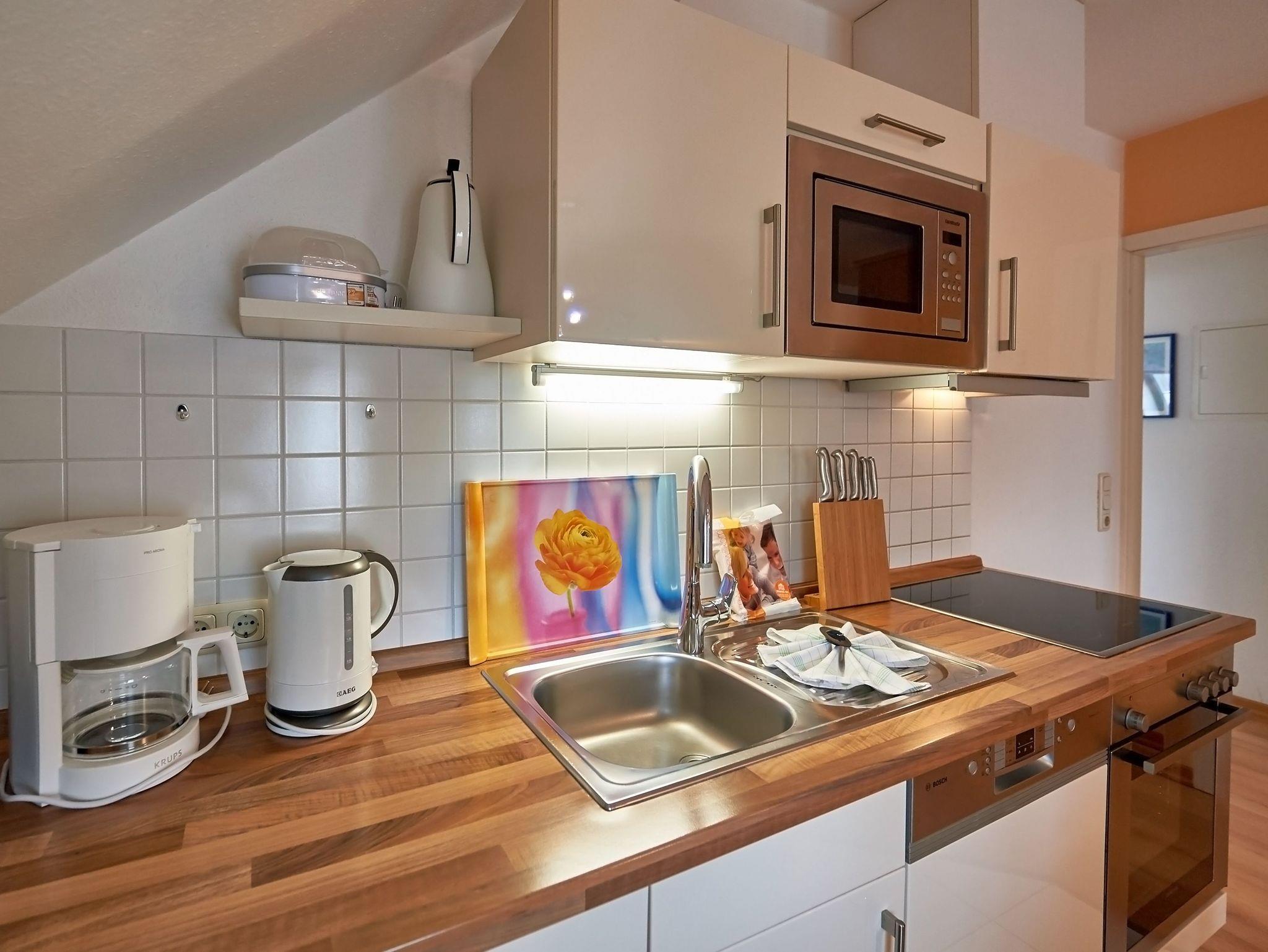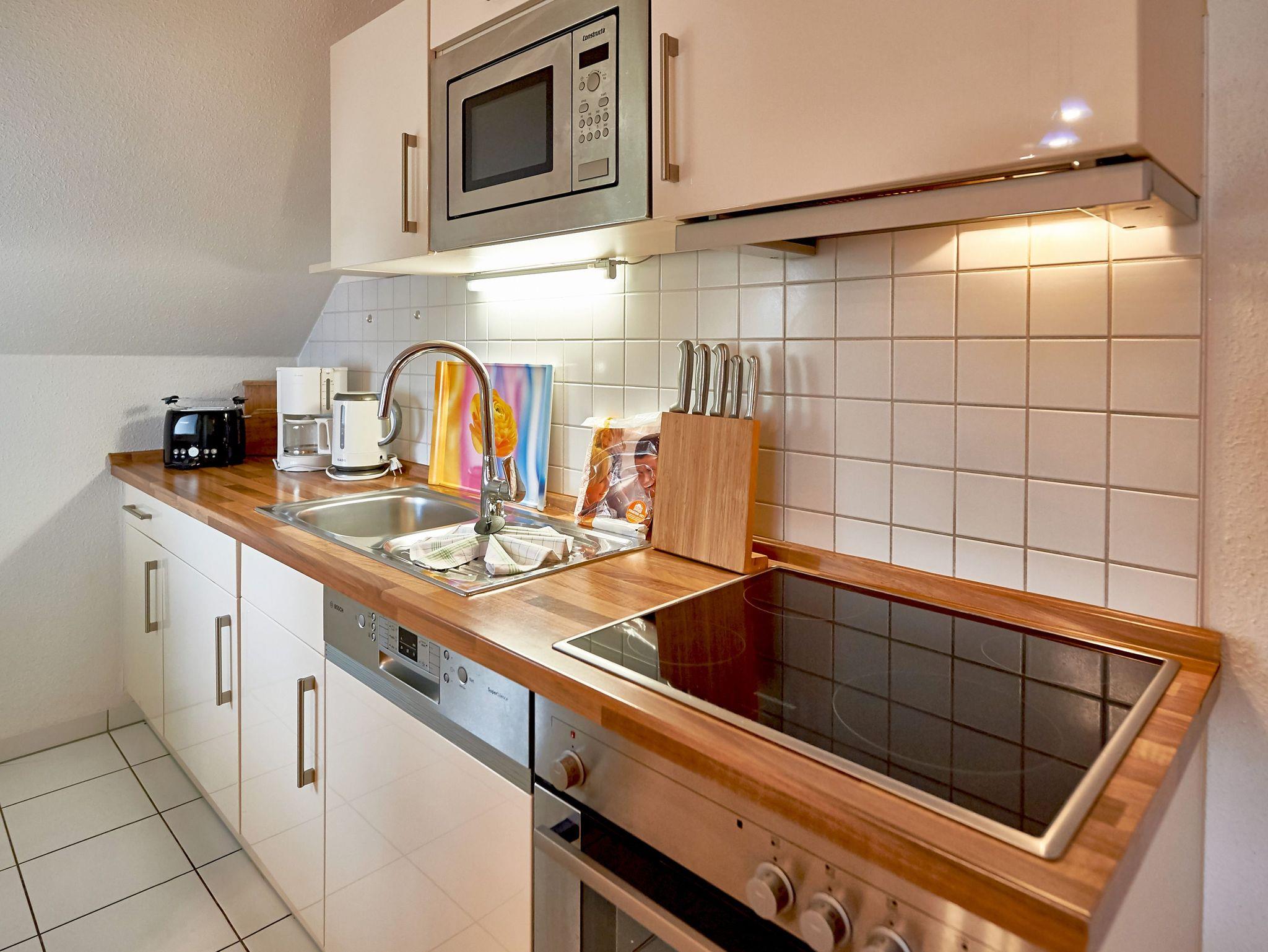 Die harmonisch in den Raum integrierte Einbauküche ist mit einem Cerankochfeld, einem Backofen, einer Mikrowelle, Dunstabzugshaube, Spülmaschine, Kaffeemaschine, Kühlschrank mit Tiefkühlfach, Toaster, Wasserkocher und diversem Kleininventar ausgestattet. Speisen können Sie ganz nach Lust und Laune entweder am Esstisch drinnen oder draußen auf dem Balkon an der frischen Ostseeluft.
