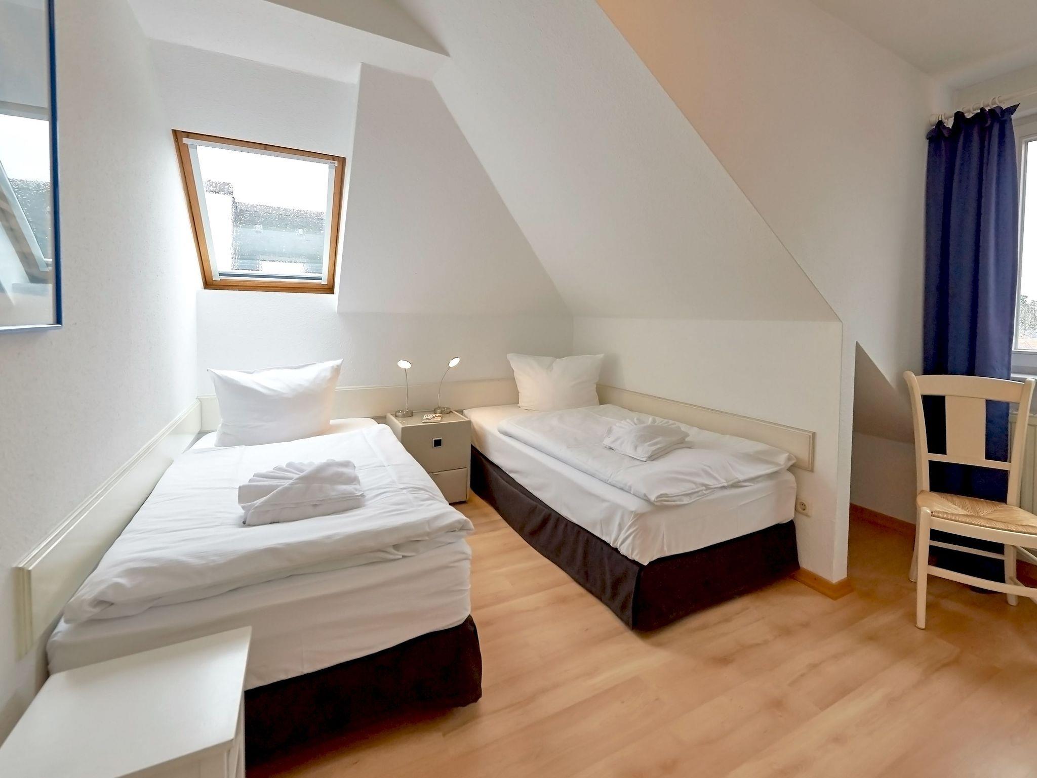 Das unter leichten Dachschrägen gelegene Schlafzimmer verfügt über zwei bequeme Einzelbetten (90 x 200 cm), die wahlweise einzeln oder als Doppelbett gestellt werden können. Beste Voraussetzungen also für süße Träume und erholsamen Schlaf nach einem erlebnisreichen Urlaubstag. Ein geräumiger Kleiderschrank bietet Platz für Ihre Urlaubsgarderobe.
