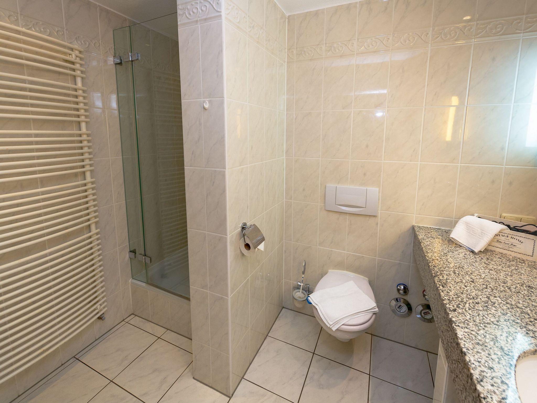 Dusche/WC, ein beleuchteter Waschtisch mit genügend Ablageflächen und Haartrockner sowie ein beheizbarer Handtuchtrockner gehören zur Ausstattung des innenliegenden Badezimmers.