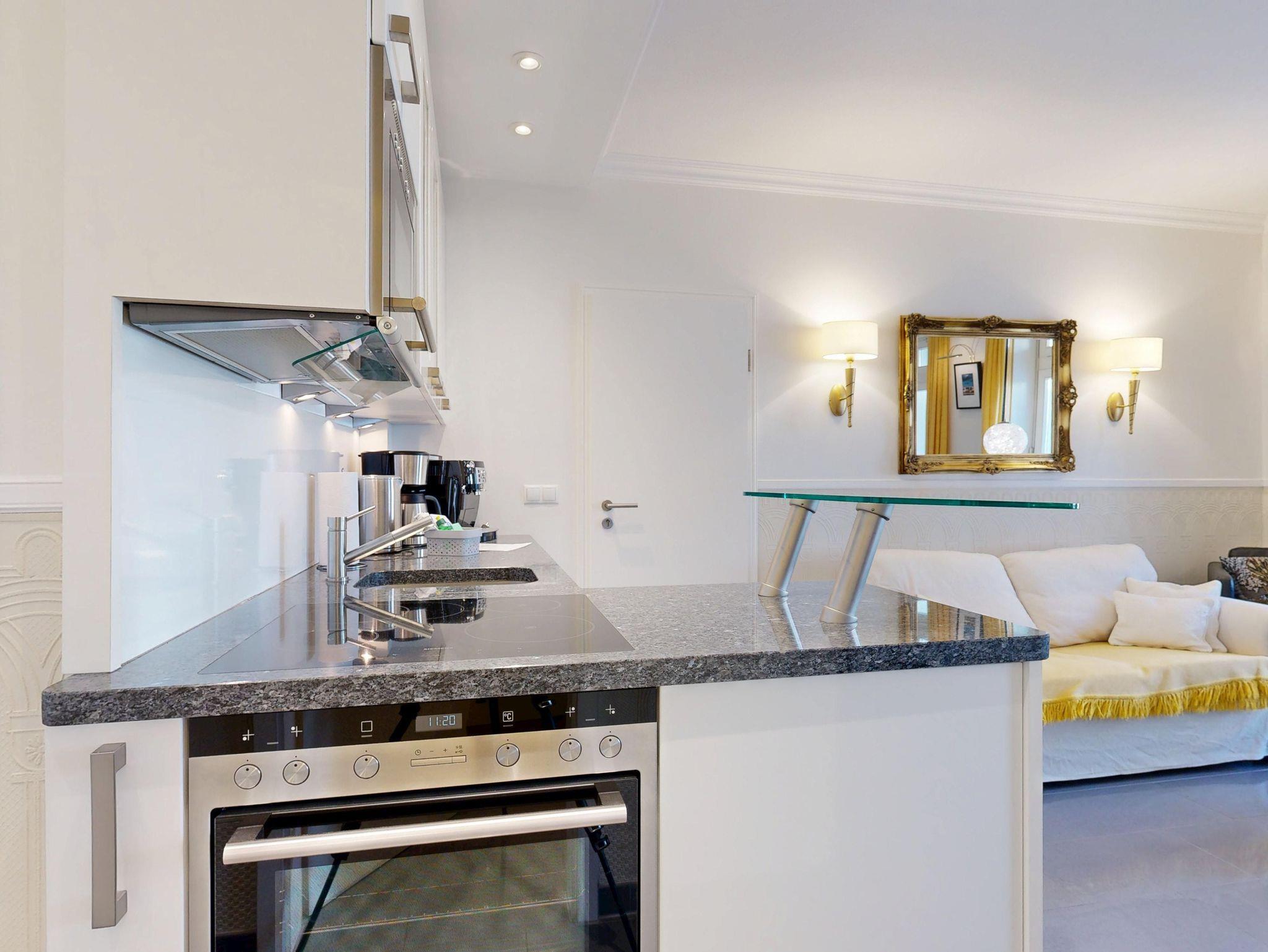 Küche mit E-Herd, Backofen, Spülmaschine, Mikrowelle, Kaffeemaschine, Wasserkocher