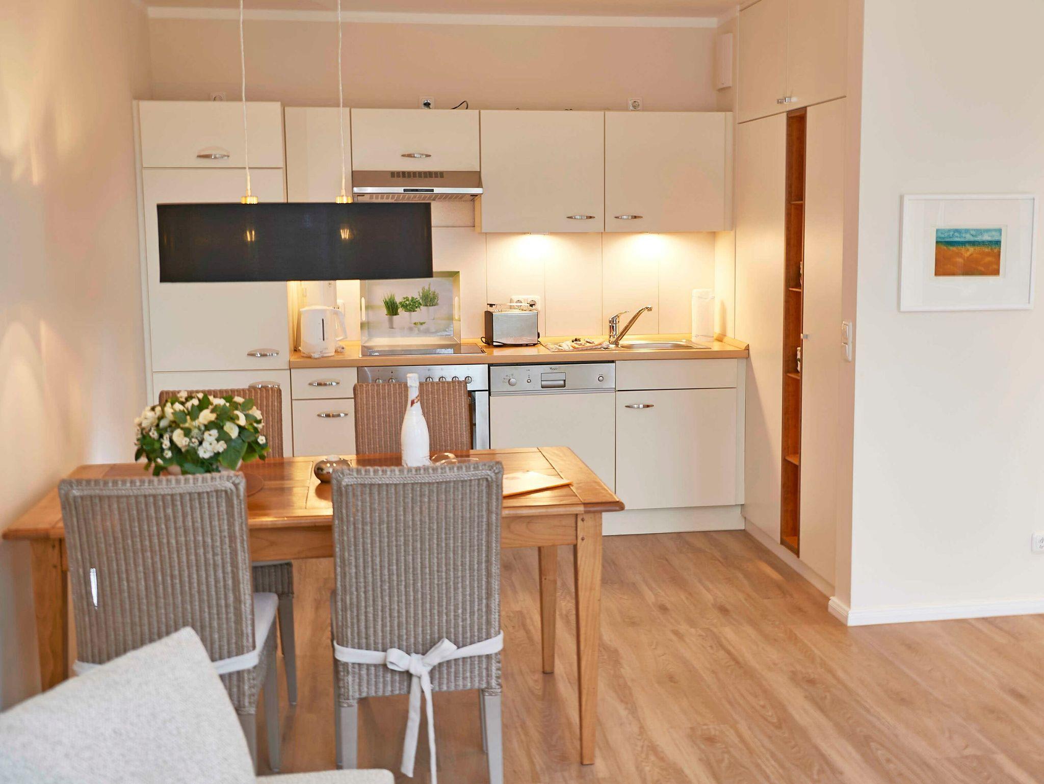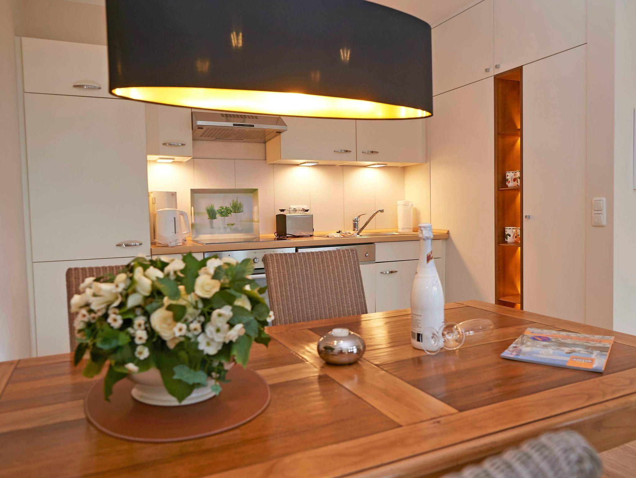 In der Küche finden Sie u.a. ein 4-Zonen-Cerankochfeld, Backofen, Kühlschrank mit Gefrierfach, Spülmaschine, Kaffeemaschine, Toaster, Wasserkocher und diverses Kleininventar, das die Küchenausstattung komplettiert.
