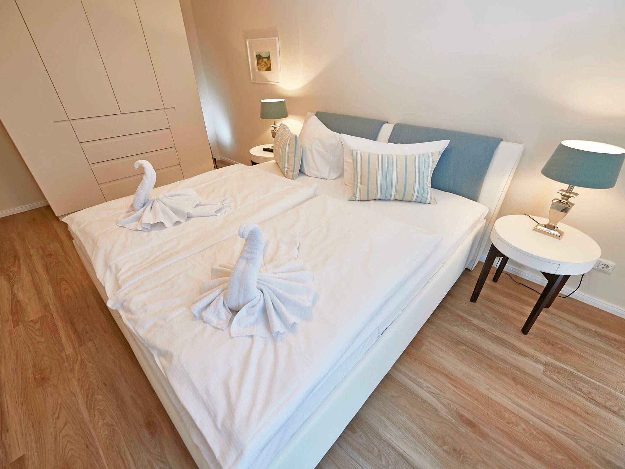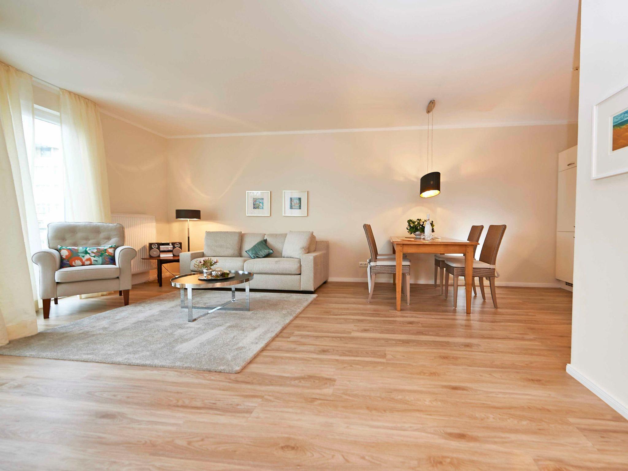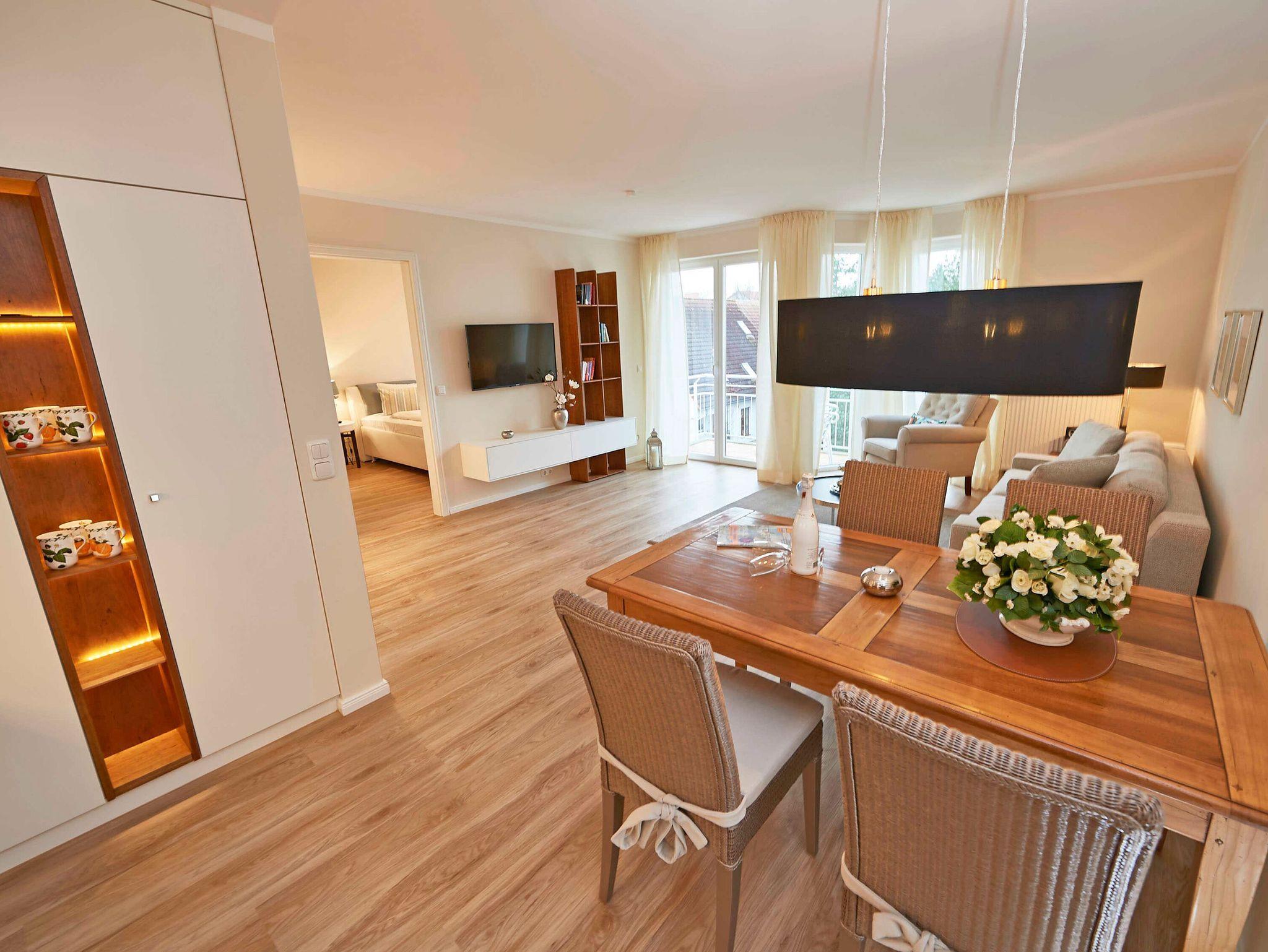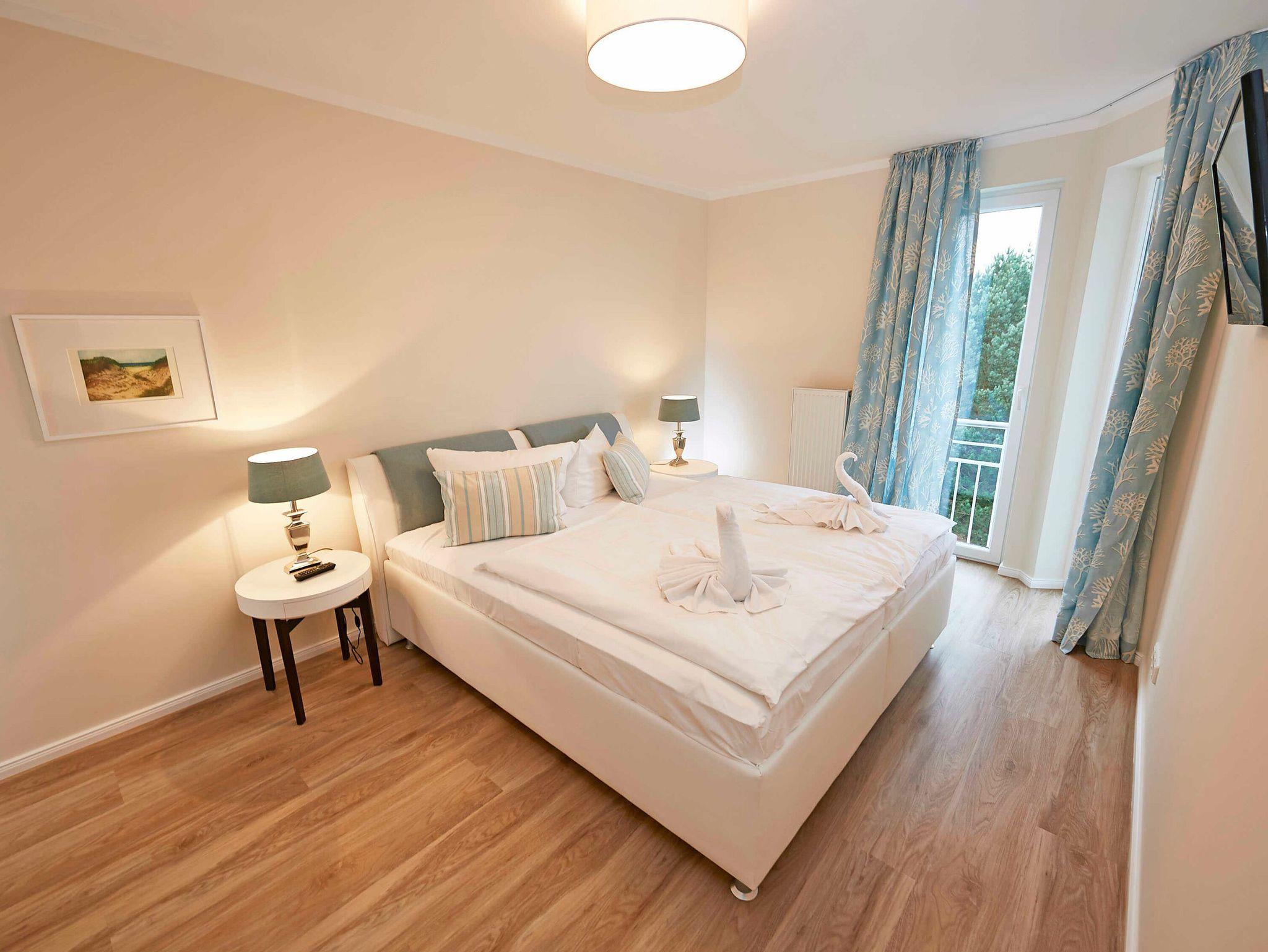 Herzlich willkommen in der Wohnung 21! Diese rund 55 m² große, komfortabel eingerichtete 2-Zimmer-Appartement befindet sich im zweiten Obergeschoss und verfügt über einen Westbalkon, von dem aus man einen seitlichen Meerblick genießt.
