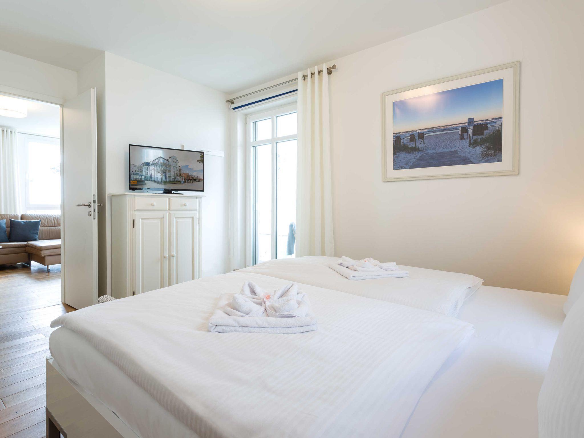 Im Schlafzimmer befindet sich ein 2. TV-Gerät und Sie können auch von hier den Meerblick-Balkon (seitlich) begehen.
