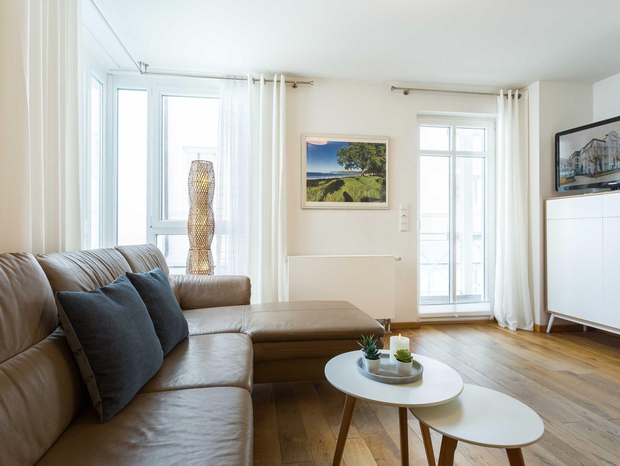Das Wohnzimmer hat ein großes bodentiefes Fenster zum Strand und einen weiteren Zugang zum Balkon mit Meerblick.