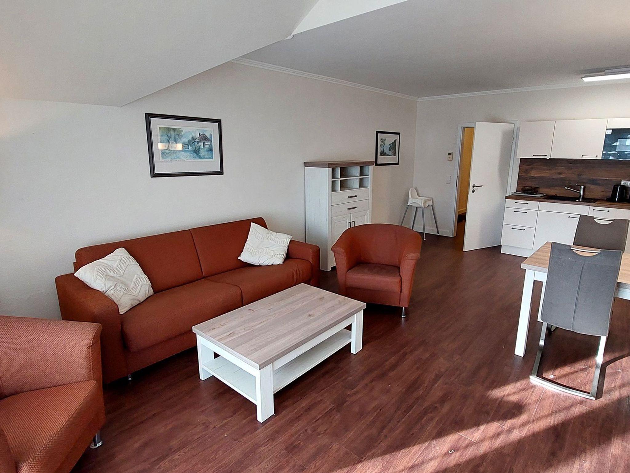 Der Wohn- und Essbereich beherbergt eine moderne Küchenzeile mit Ceran-Kochfeldern, einem Geschirrspüler, einem Kühlschrank mit Gefrierfach, einer Mikrowelle und verschiedenen Küchenutensilien. Der Essbereich bietet sogar Platz für 4 Personen und eine gemütliche Sitzlandschaft lädt zum Verweilen ein. Zur technischen Ausstattung gehören kostenfreies WLAN, ein Smart-TV samt Blu-ray-Player und eine kleine Musikanlage.