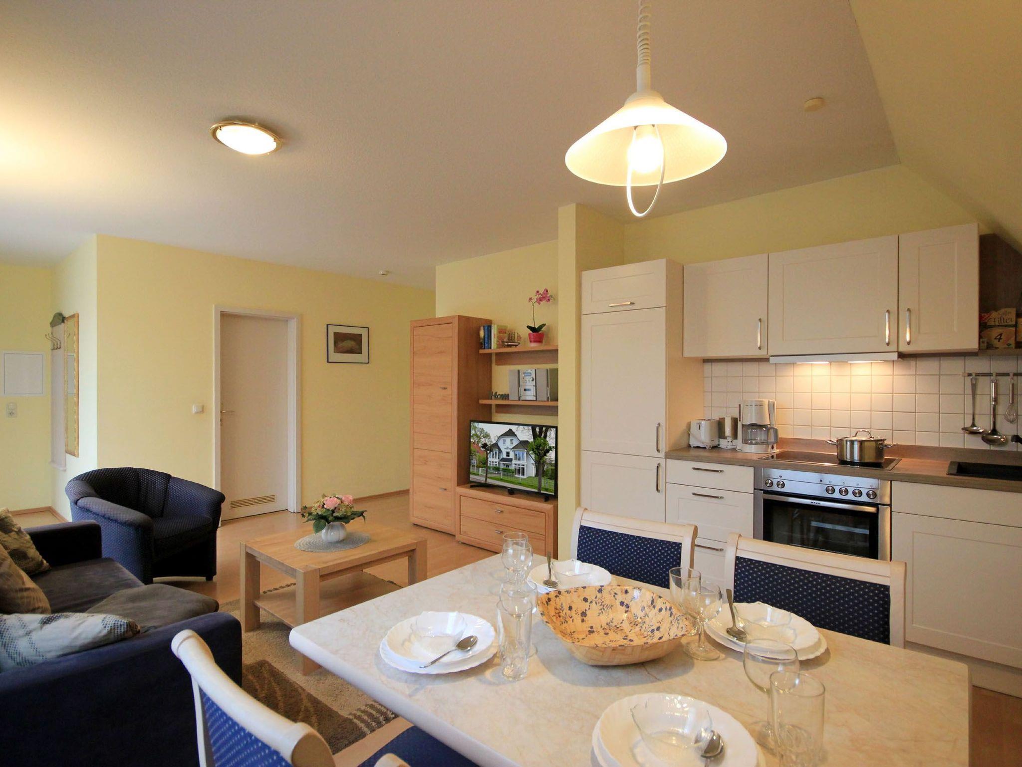 Dieses schöne Appartement teilt sich auf in einen großzügigen Wohnraum mit Wohnküche sowie Essbereich, ein Duschbad, ein gemütlicher Schlafraum sowie Flur. Im Wohnraum finden Sie neben der Sitzgruppe mit Schlaffunktion für 2 weitere Personen eine komplett eingerichtete Küchenzeile. Die technische Ausstattung umfasst einen Flachbildfernseher, WLAN sowie eine Stereoanlage. Die Wohnküche beinhaltet neben ausreichend Geschirr, Besteck und Gläsern einen Geschirrspüler, Backofen, Kühlschrank mit kleinem Gefrierfach, Kaffeemaschine, Wasserkocher, Toaster sowie weiteren Kochutensilien. Im Schlafzimmer erwartet Sie ein Doppelbett mit Nachttischen und ein geräumiger Kleiderschrank. Das Badezimmer verfügt über eine Ganzglasdusche, Waschtisch, Fön und WC.