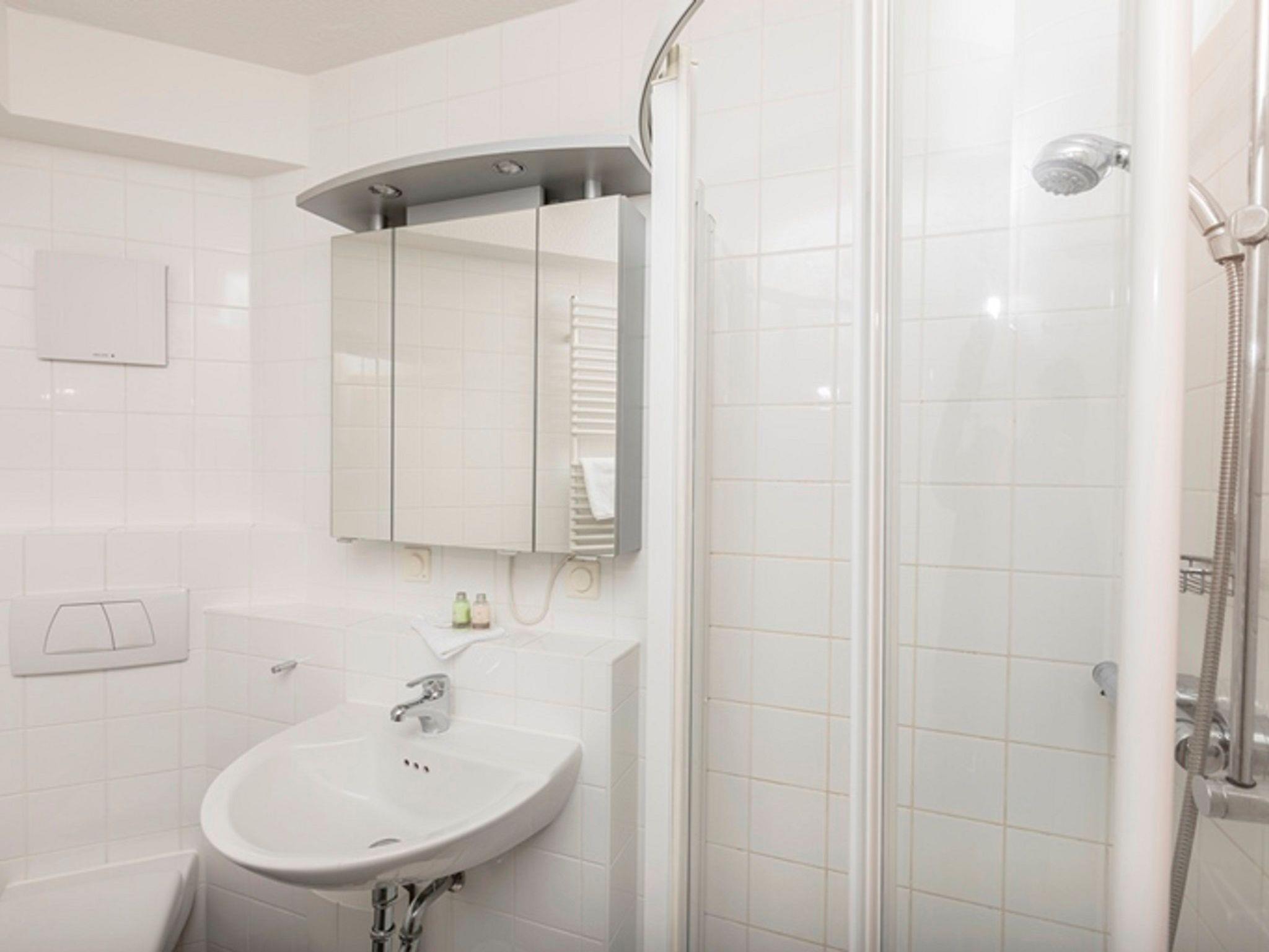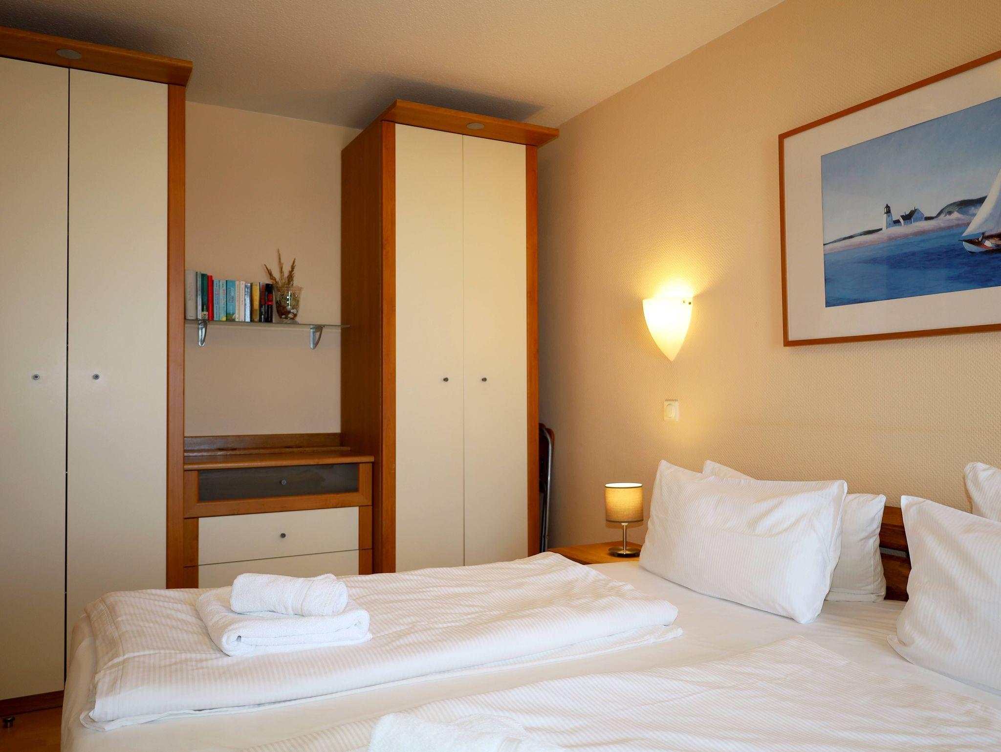 Das Schlafzimmer bietet ein komfortables Doppelbett und einen geräumigen Kleiderschrank. Das Badezimmer ist mit Eckdusche, WC und Fön ausgestattet.