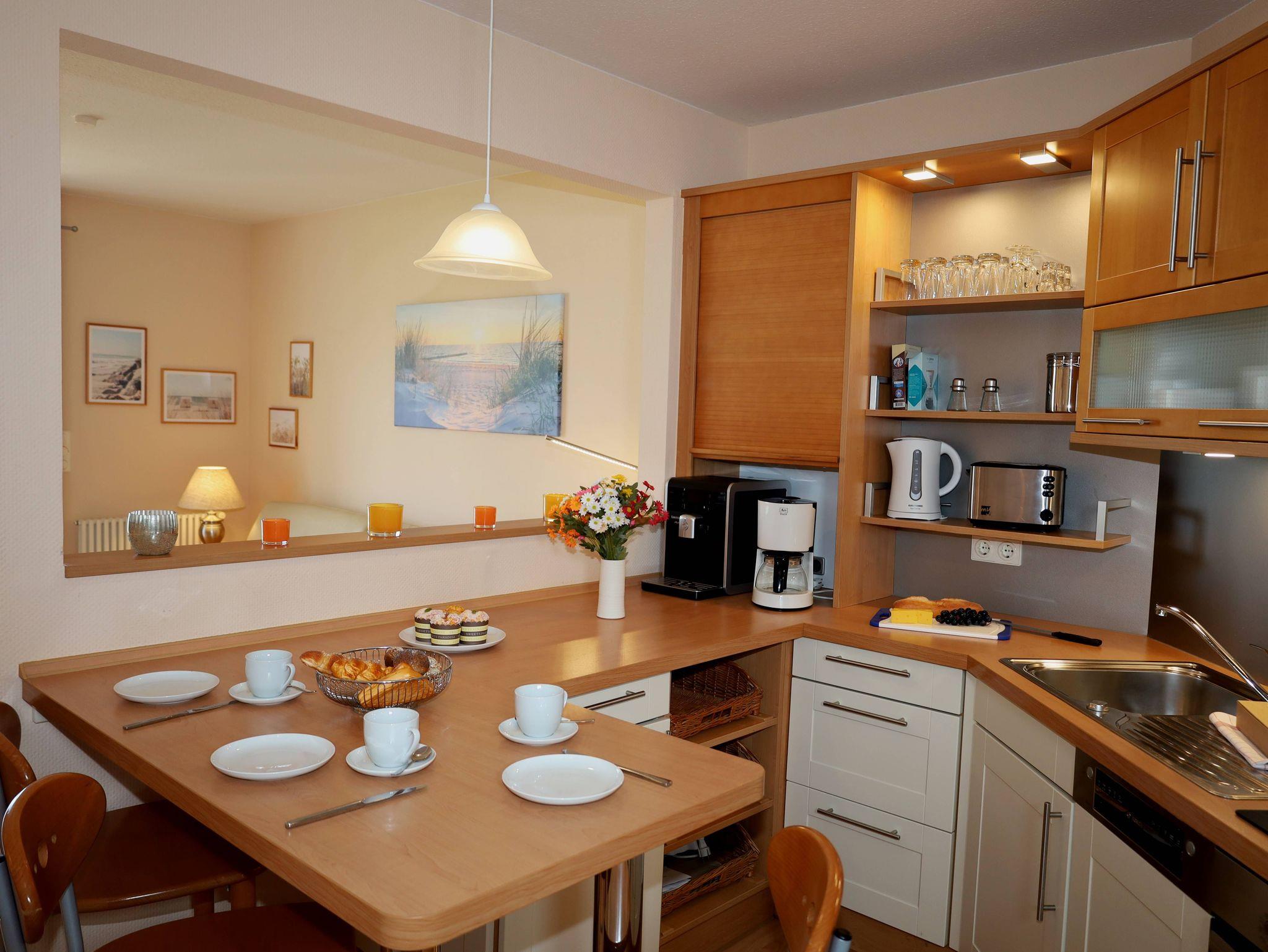 Im Wohnzimmer erwarten Sie ein Flachbild-TV, eine Stereoanlage mit CD-Player, kostenfreies WLAN sowie eine bequeme Sitzlandschaft mit Schlaffunktion. Die großzügige Küchenzeile mit Tresen und Barhockern ist vollständig ausgestattet mit Geschirrspüler, Cerankochfeld, Backofen und praktischen Geräten wie Kaffeemaschine, Toaster und Wasserkocher.