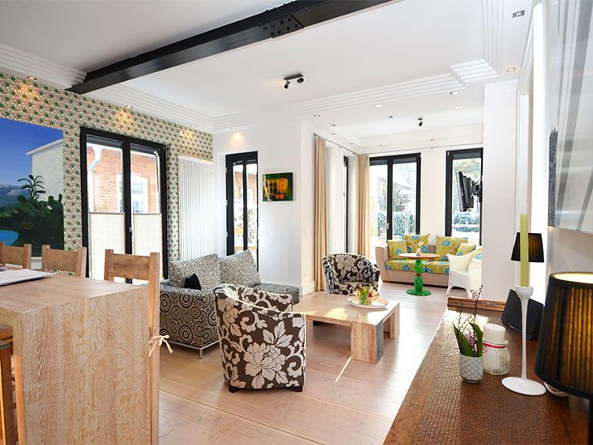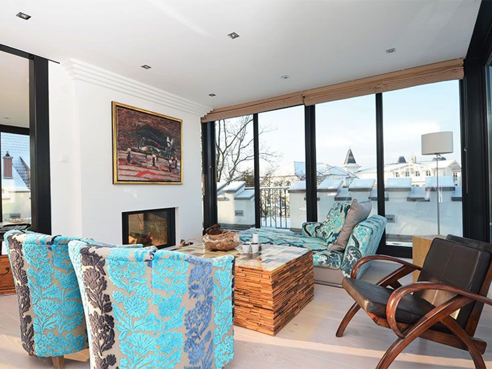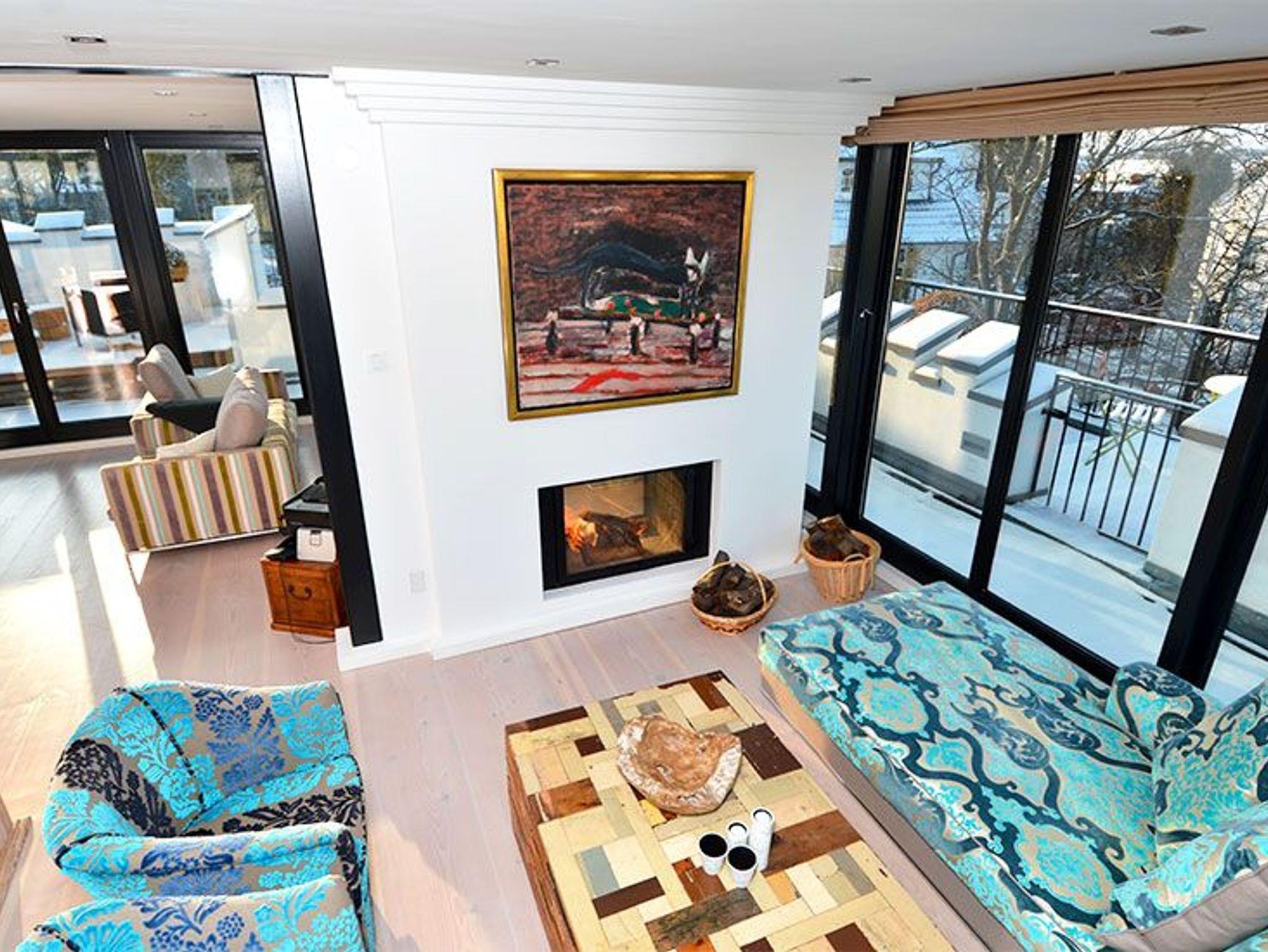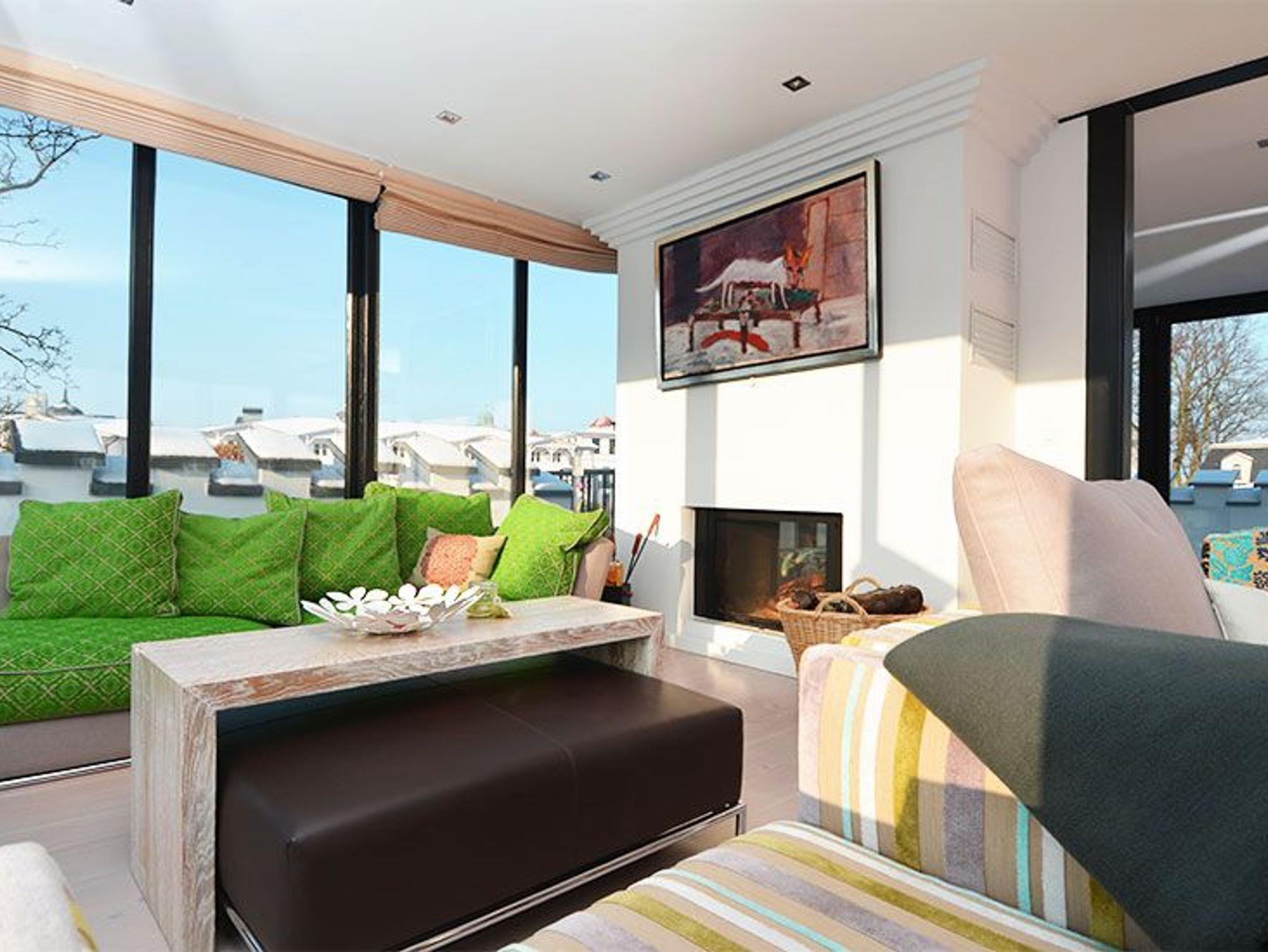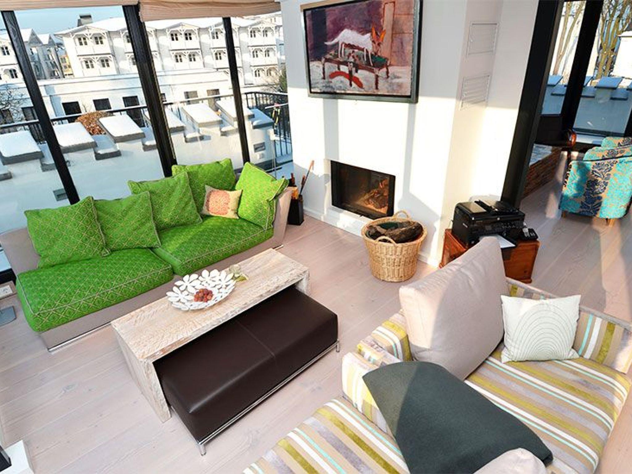Das gesamte Penthouse ist eine offene Relaxlounge mit gemütlichen Sitzmöbeln und Chaiselonguen. Der optische Raummittelpunkt ist jedoch der zweseitig verglaste Kamin. Ein Flachbild-TV und ein Soundsystem sorgen für Unterhaltung.