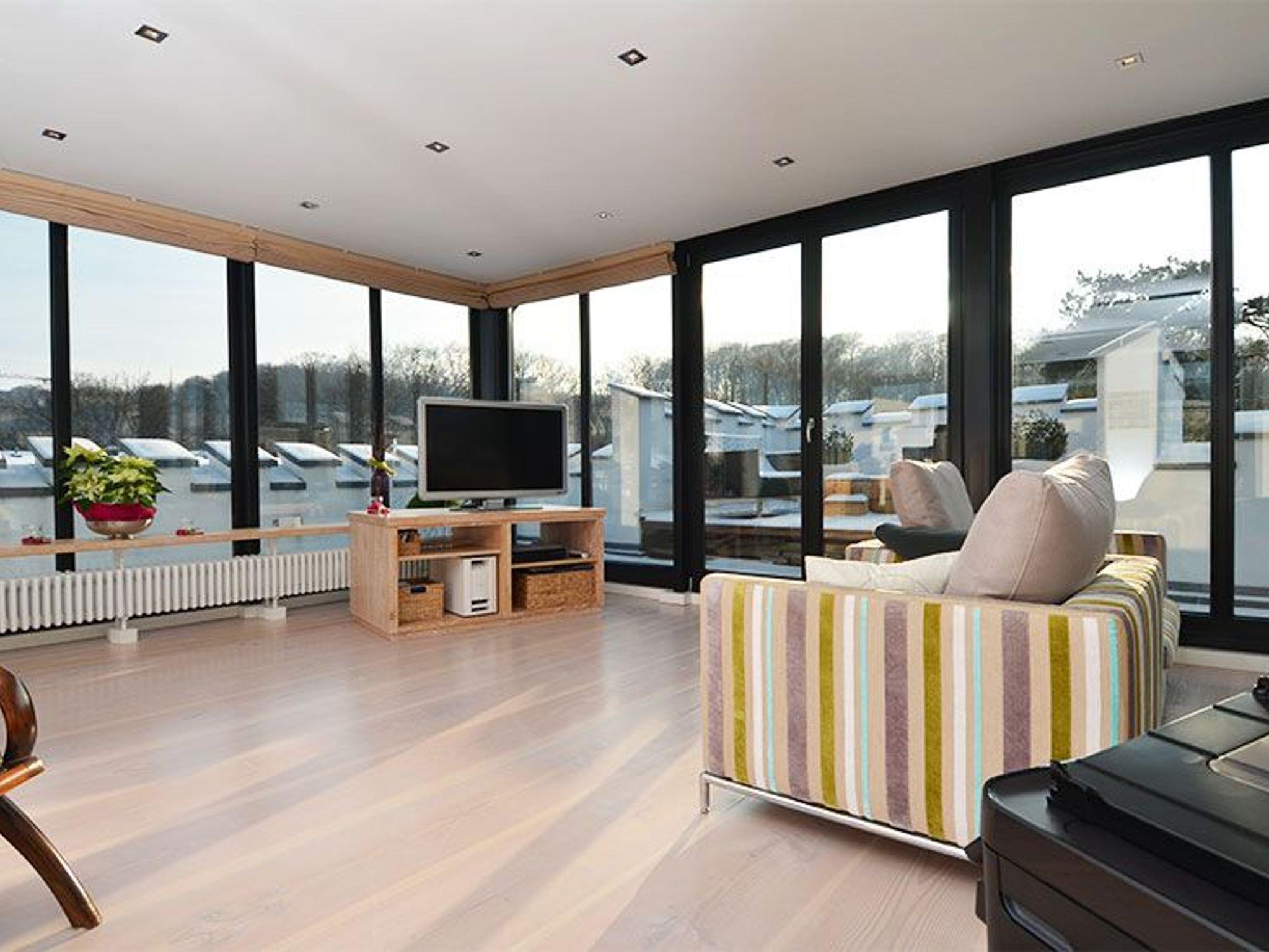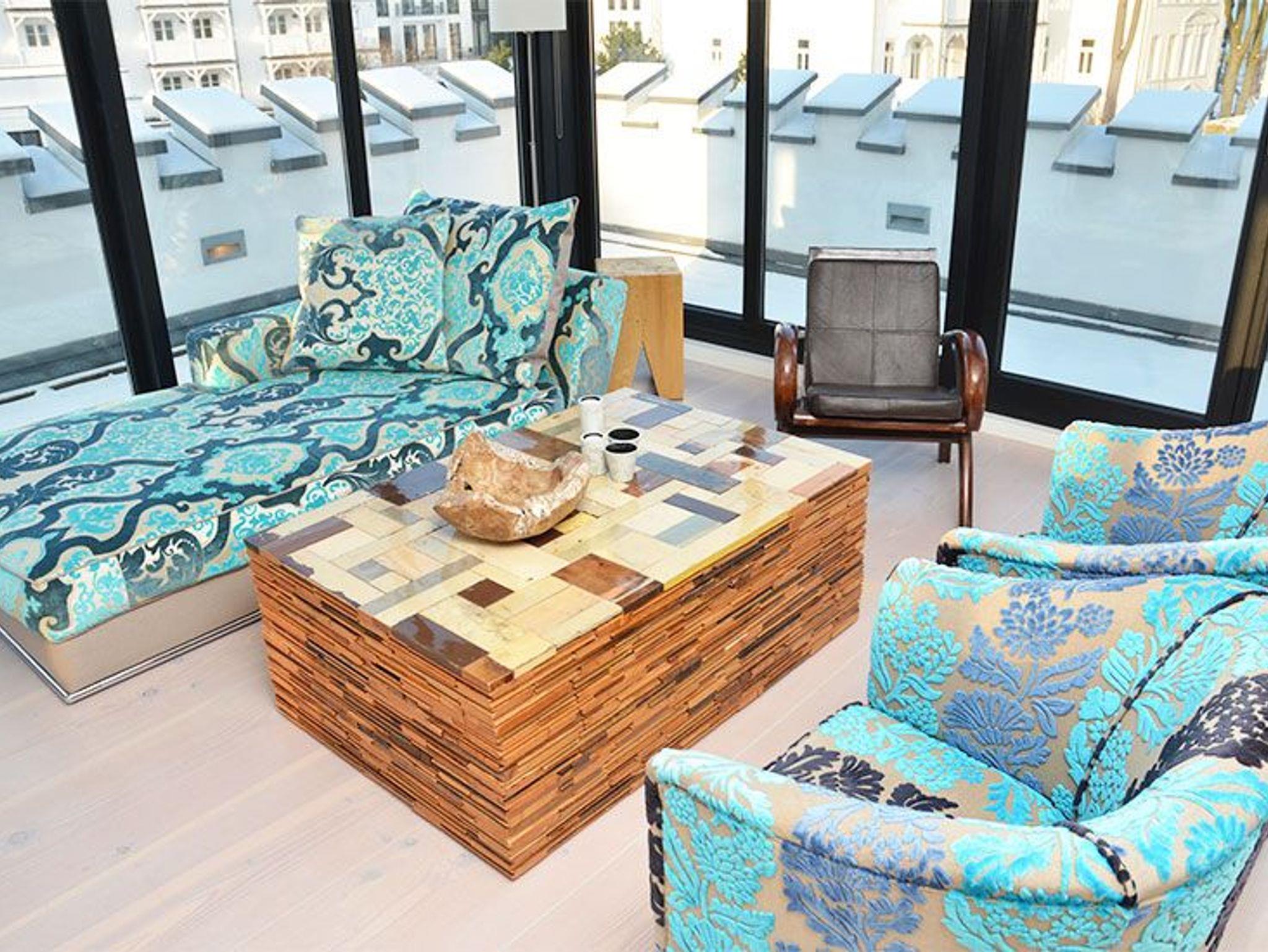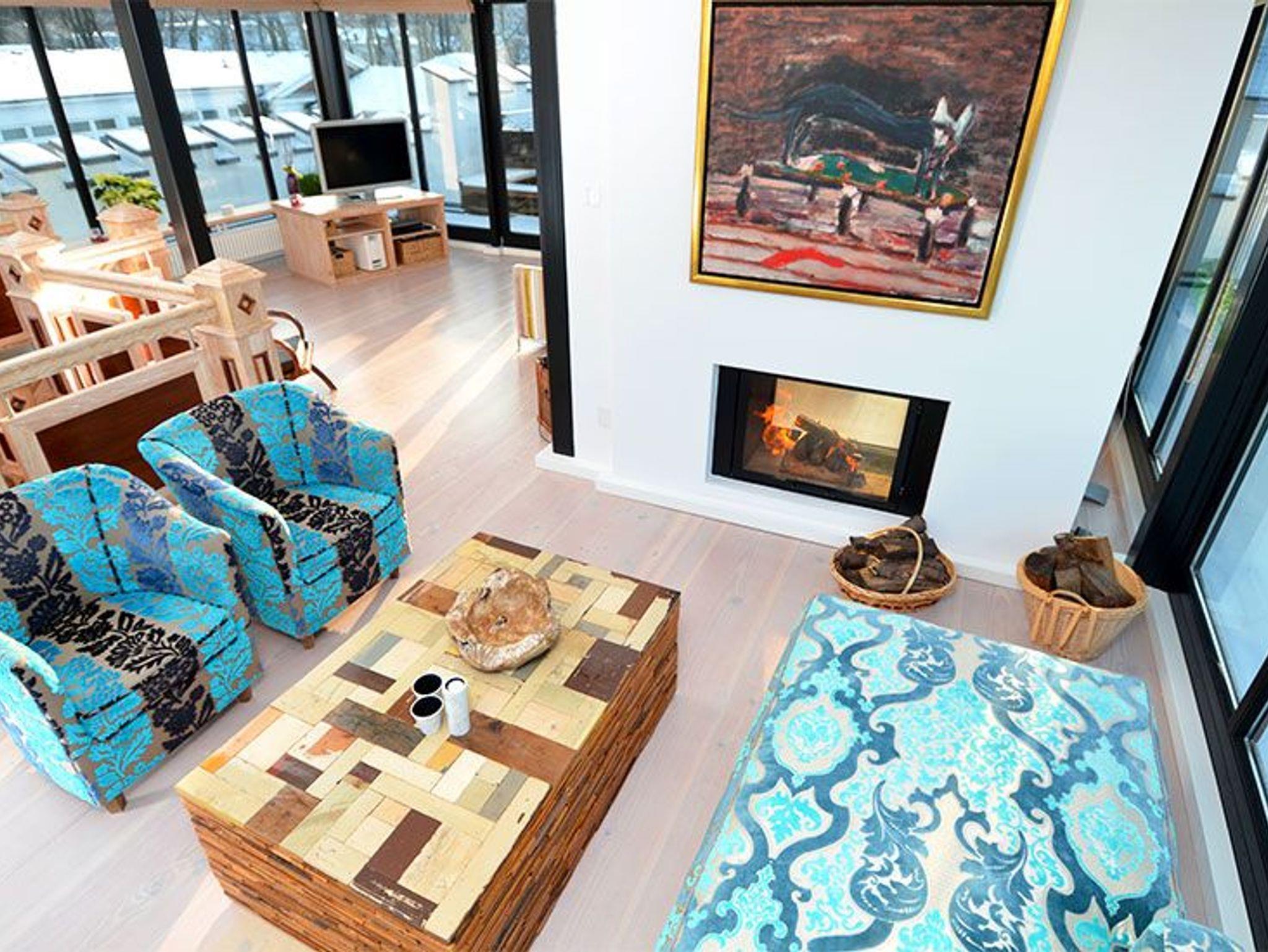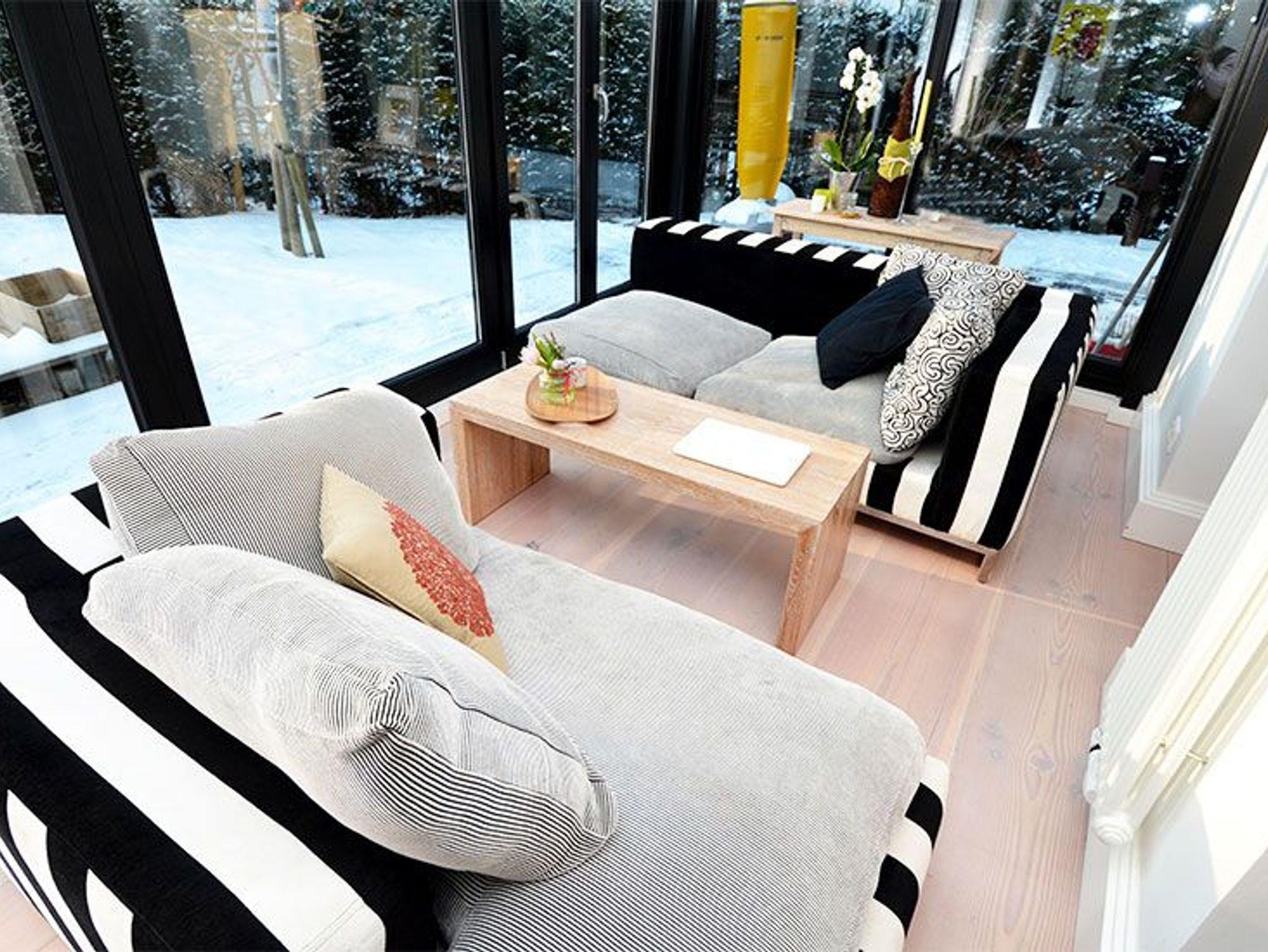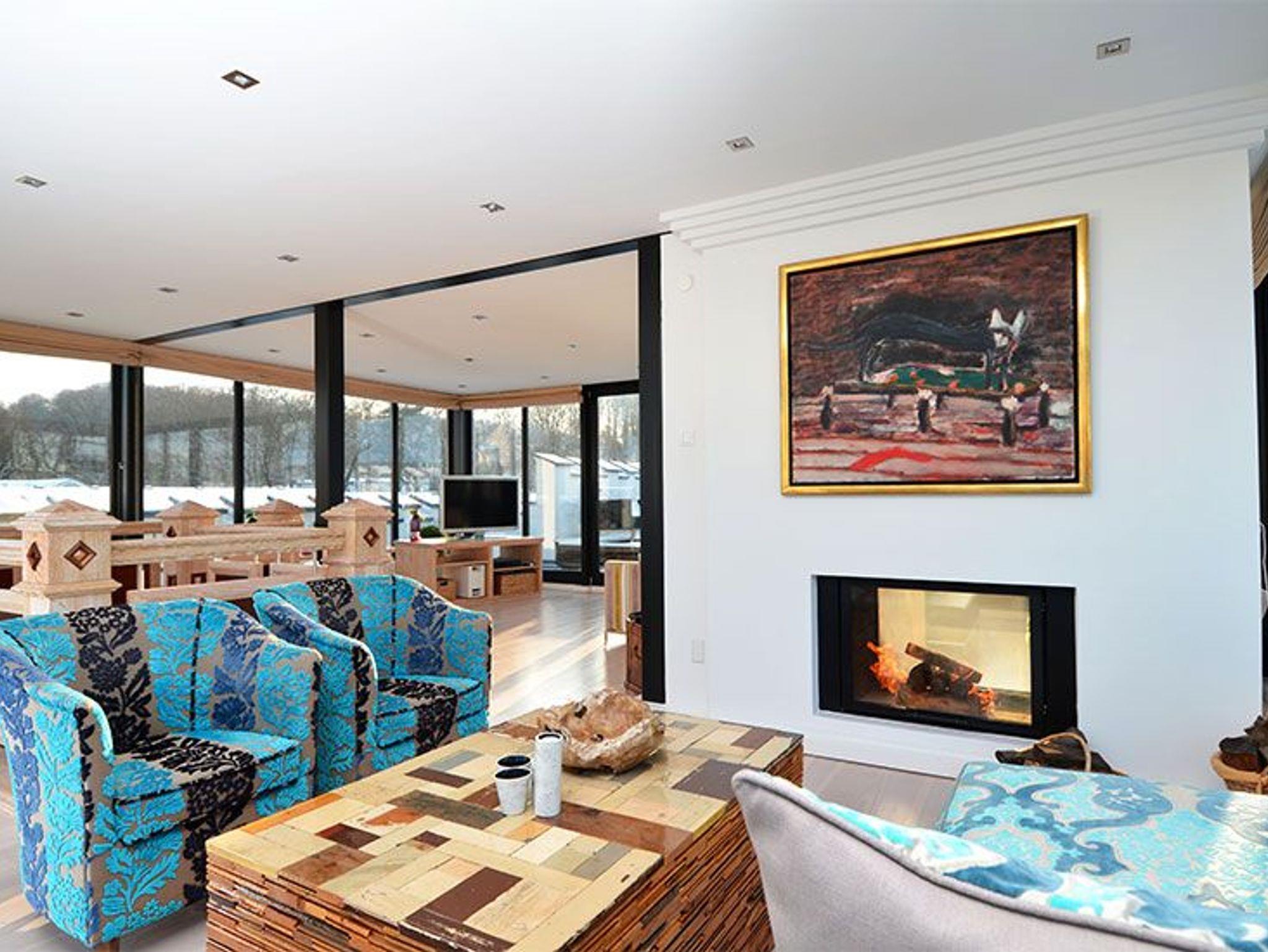 Das gesamte Penthouse ist eine offene Relaxlounge mit gemütlichen Sitzmöbeln und Chaiselonguen. Der optische Raummittelpunkt ist jedoch der zweseitig verglaste Kamin. Ein Flachbild-TV und ein Soundsystem sorgen für Unterhaltung.