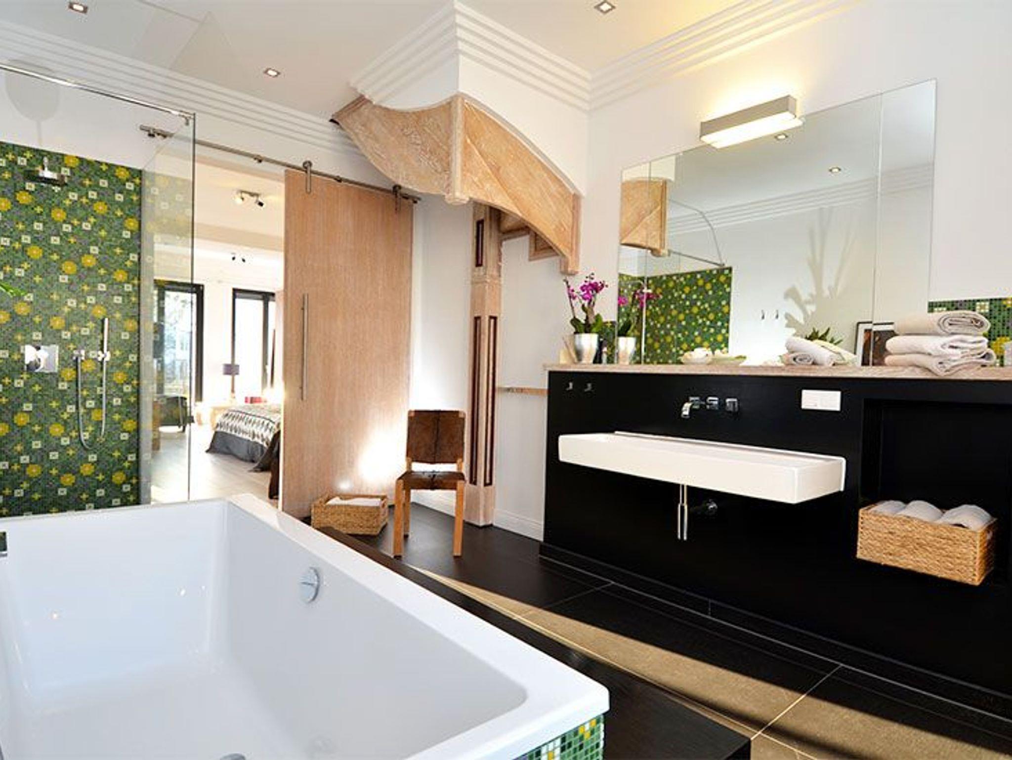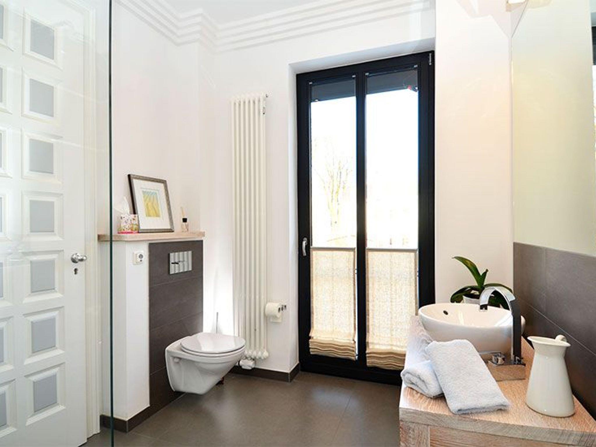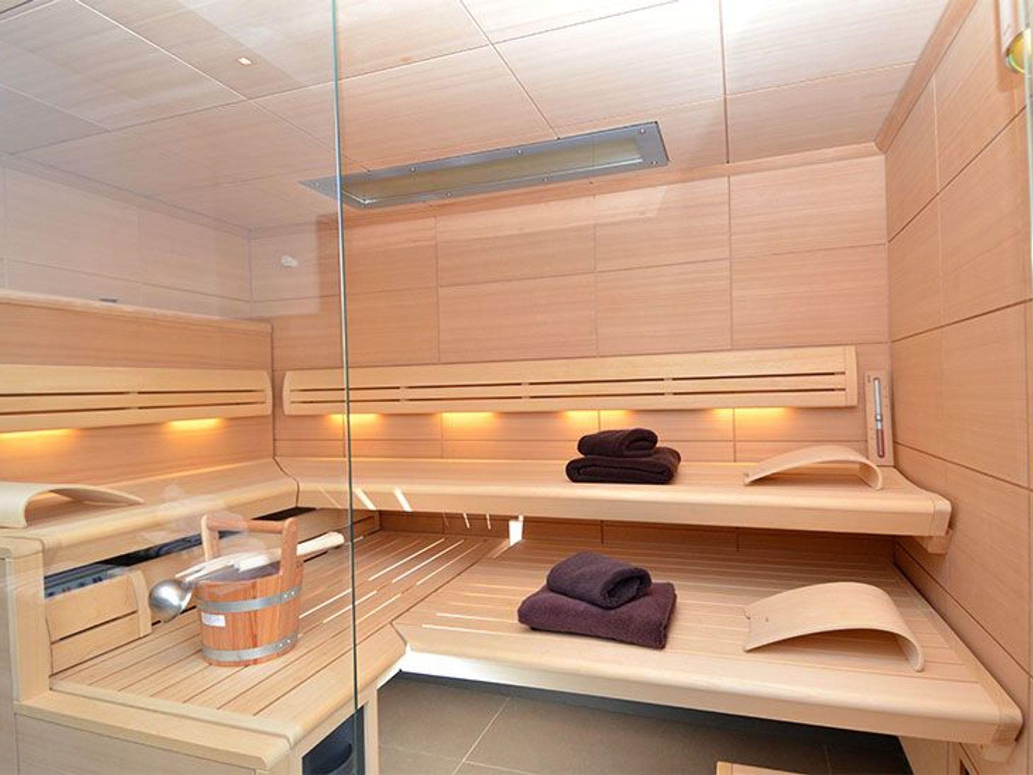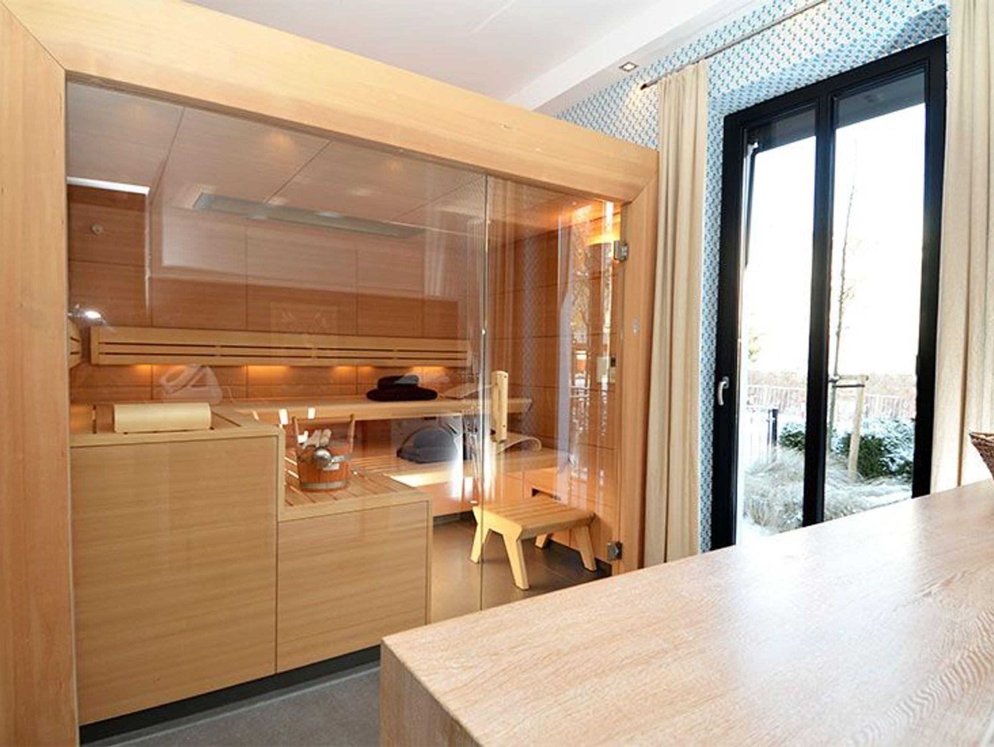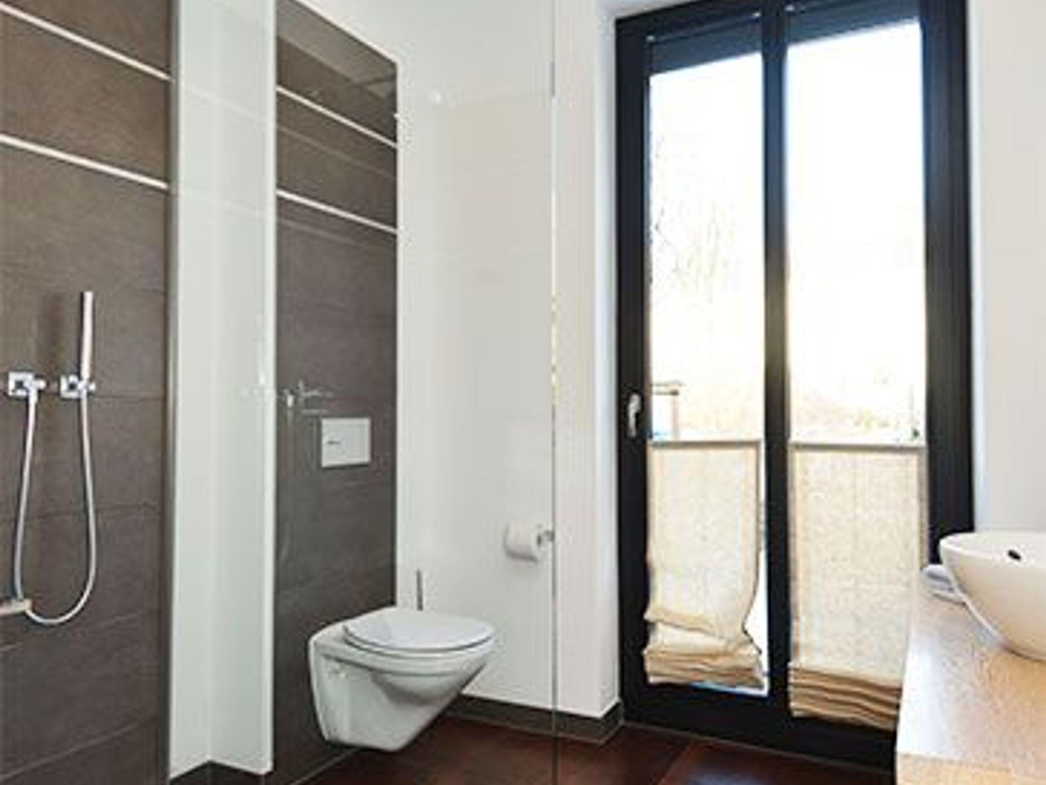 Das Erdgeschoss verfügt auch über ein Bad mit einer Echtglasdusche, einem Waschplatz mit hochwertiger Keramik und einem WC. Ein schmaler Durchgang führt in den kombinierten Wasch- und Saunaraum. Die sehr große Bio-Kombisauna der Firma Klafs ist speziell angefertigt und verführt mit den ausgezeichnet verarbeiteten Hölzern und der großen Glasfront zu ausgedehnten Saunagängen.