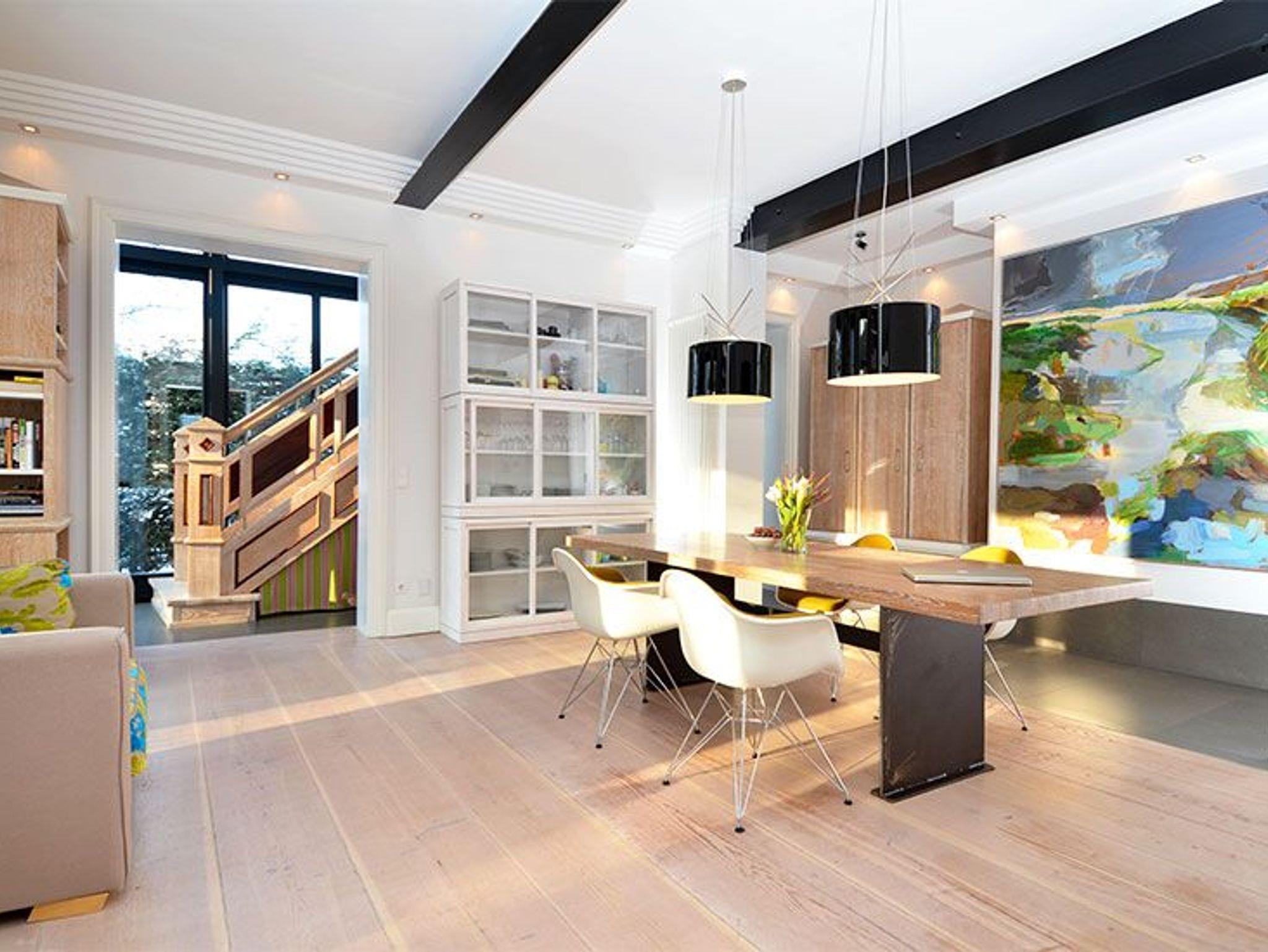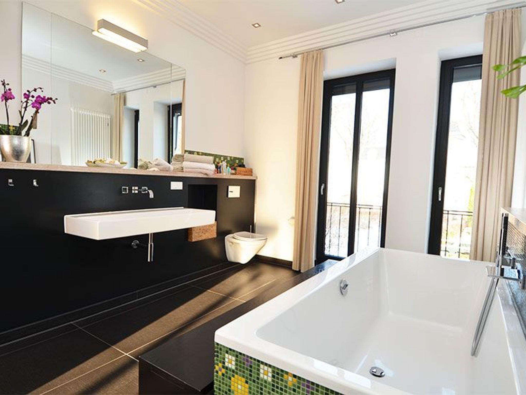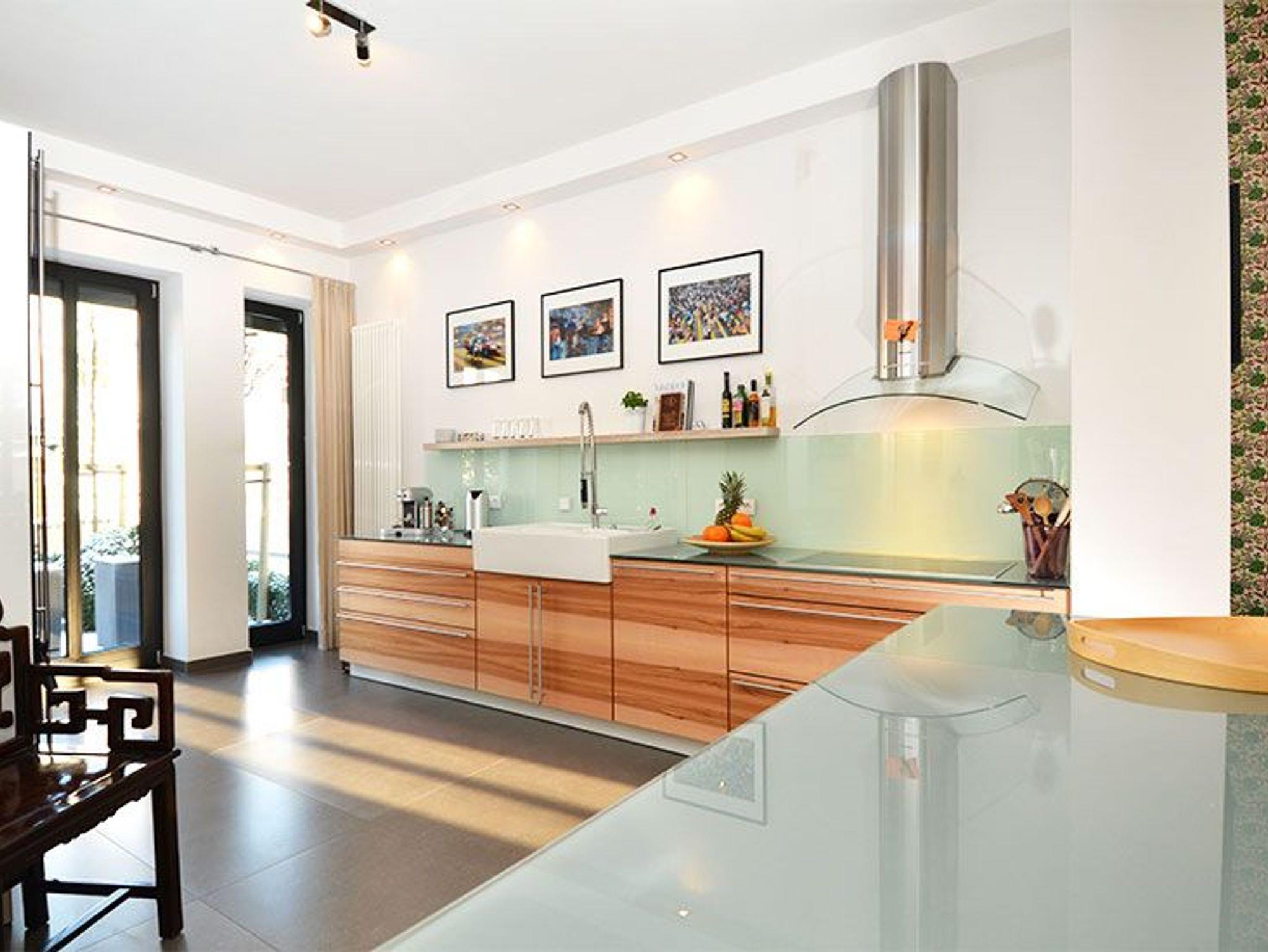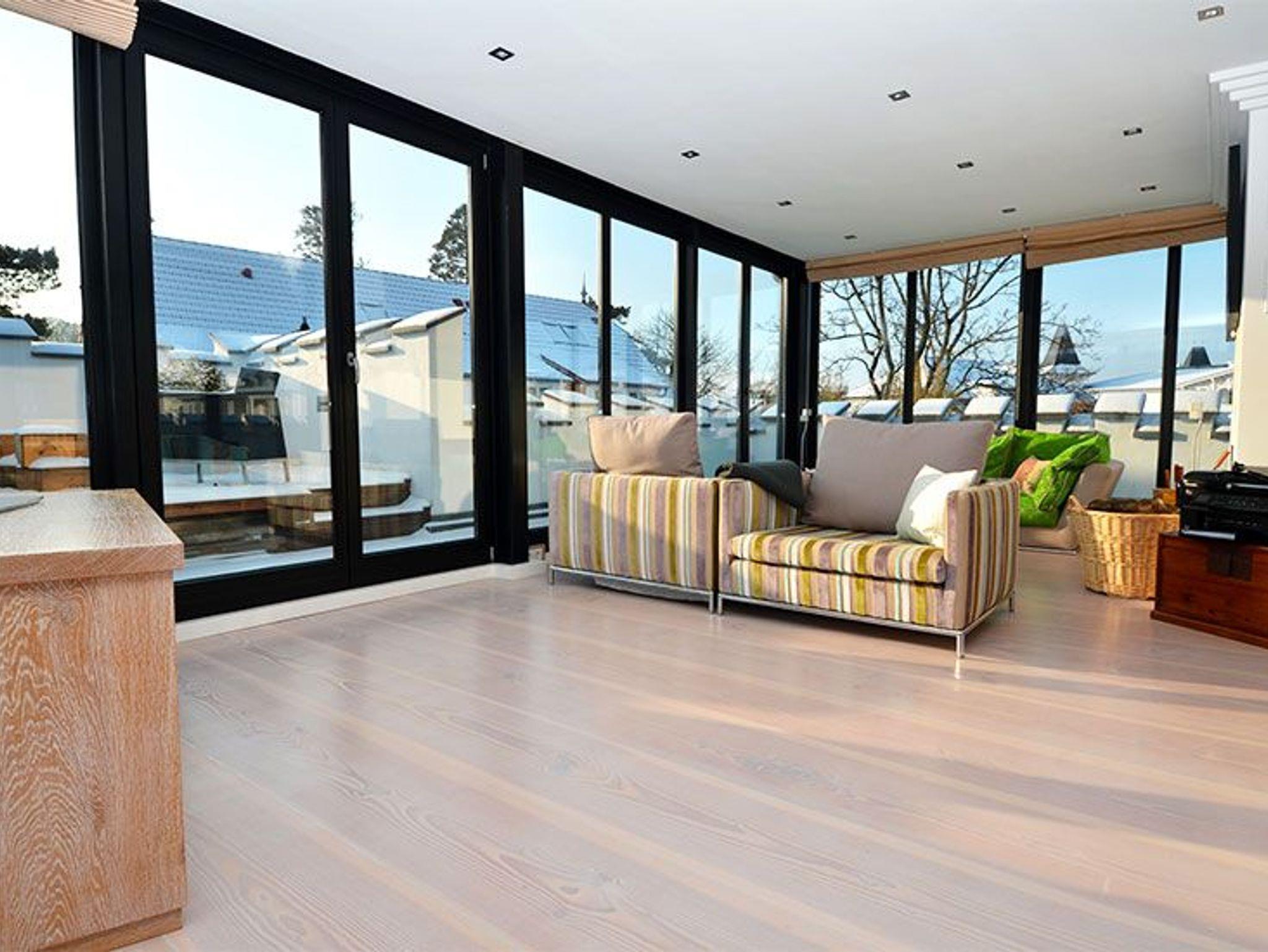 Alle Fenster des Hauses sind bodentief und sorgen für lichtdurchflutete Räume. Fenstermarkisen schützen vor zu viel Sonneneinstrahlung. Im ganzen Haus wurden die Böden der Wohnräume mit raumlangen, sehr breiten Douglasie-Holzdielen belegt. Die 3 Bäder wurden raumhoch gefliest und mit Designarmaturen von Dornbracht ausgestattet. Die großzügigen Echtglasduschen vermitteln ein besonderes Wellnessfeeling. Viele der Möbel sind maßangefertigte gekälkte Eiche-Vollholzmöbel.
