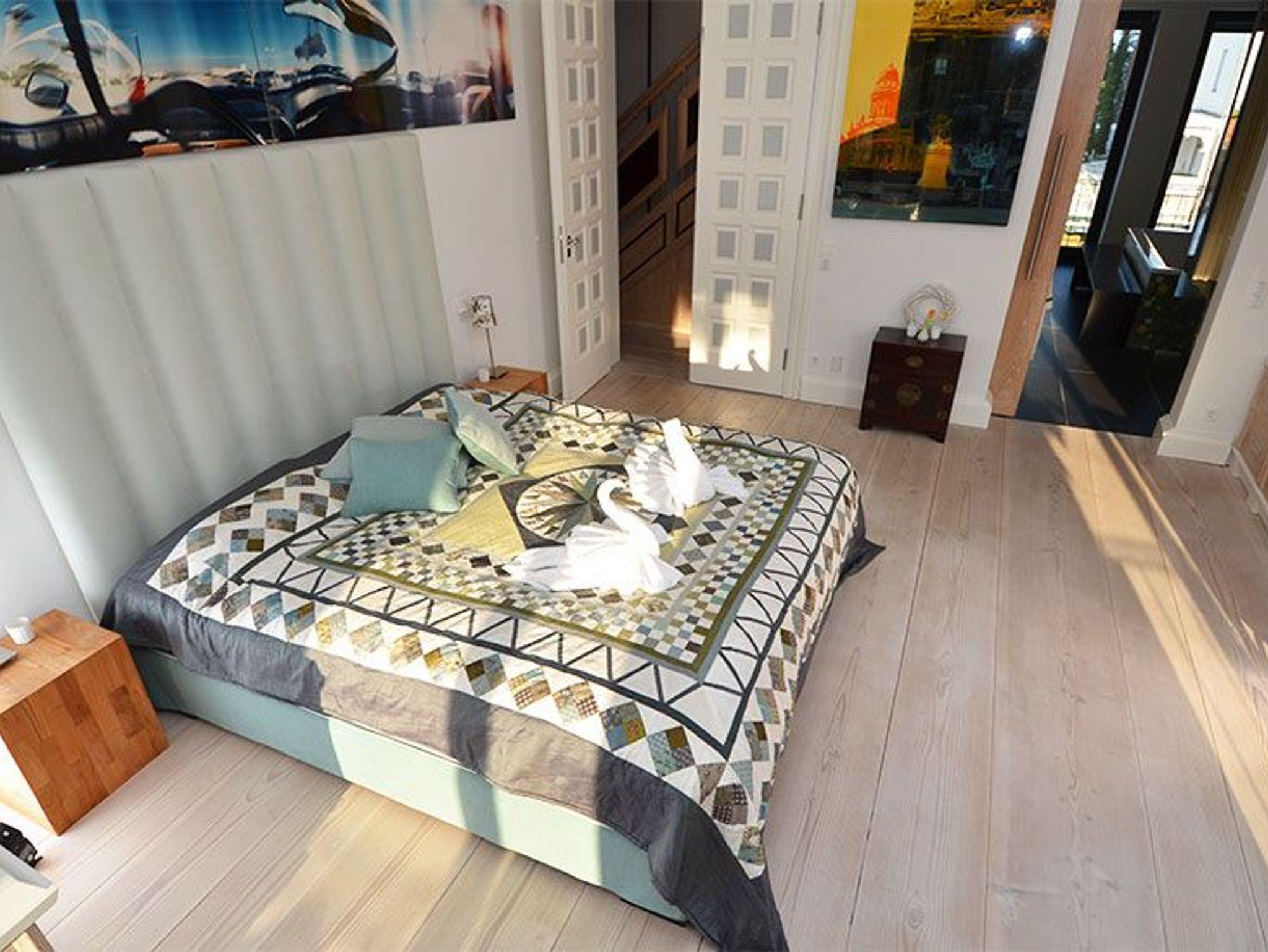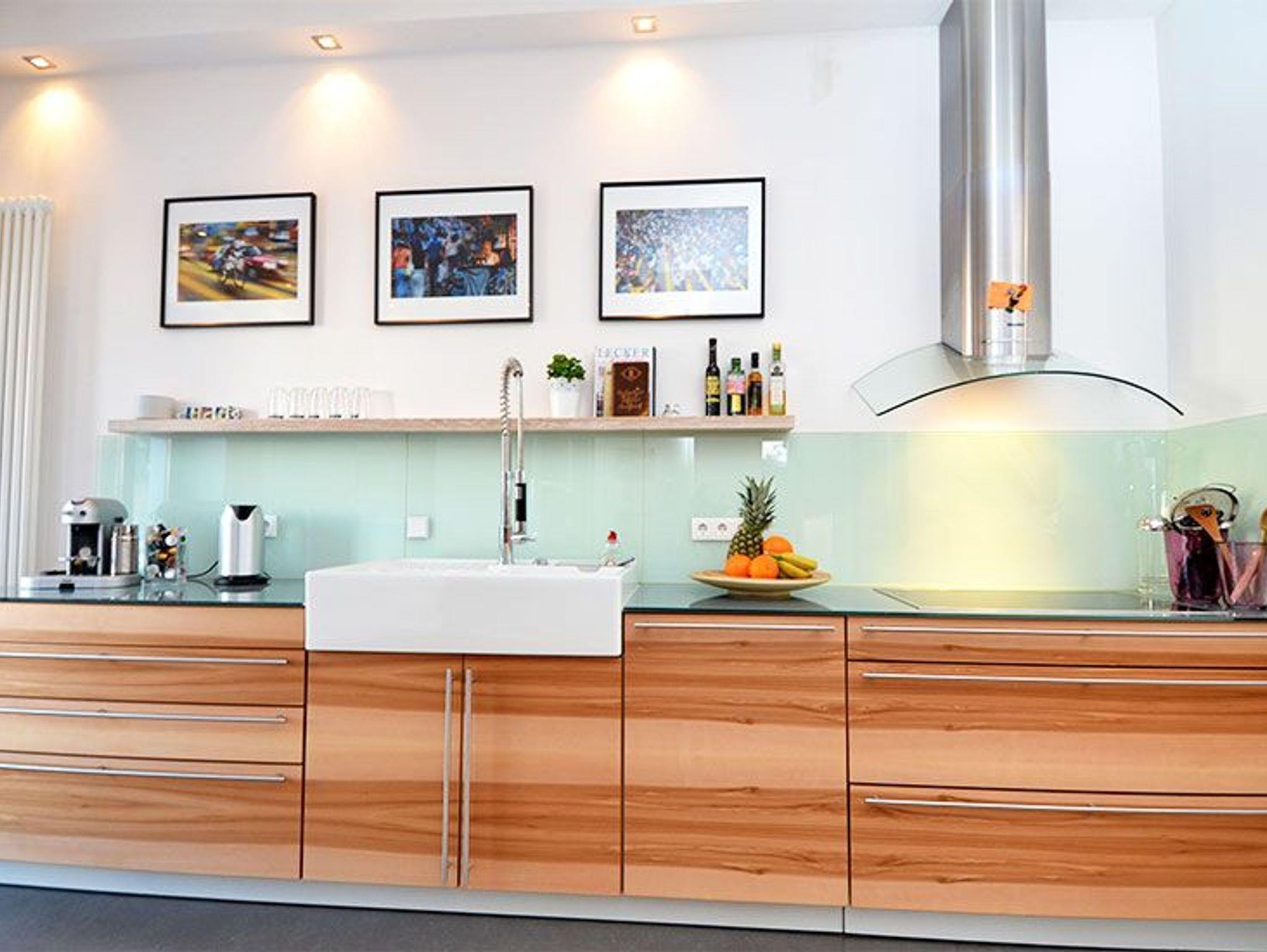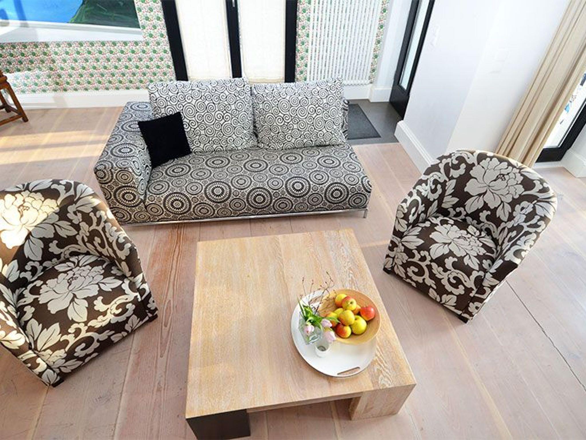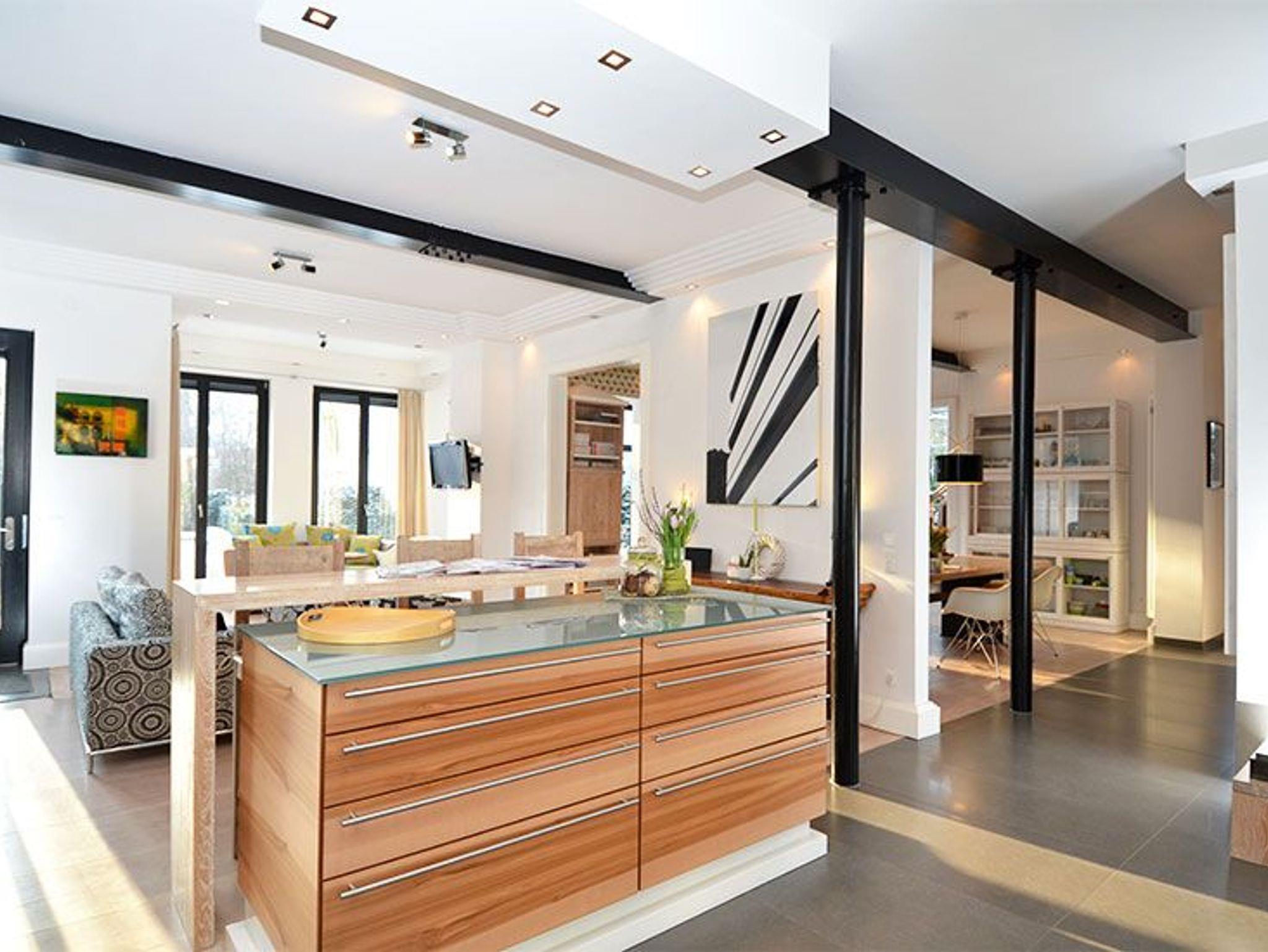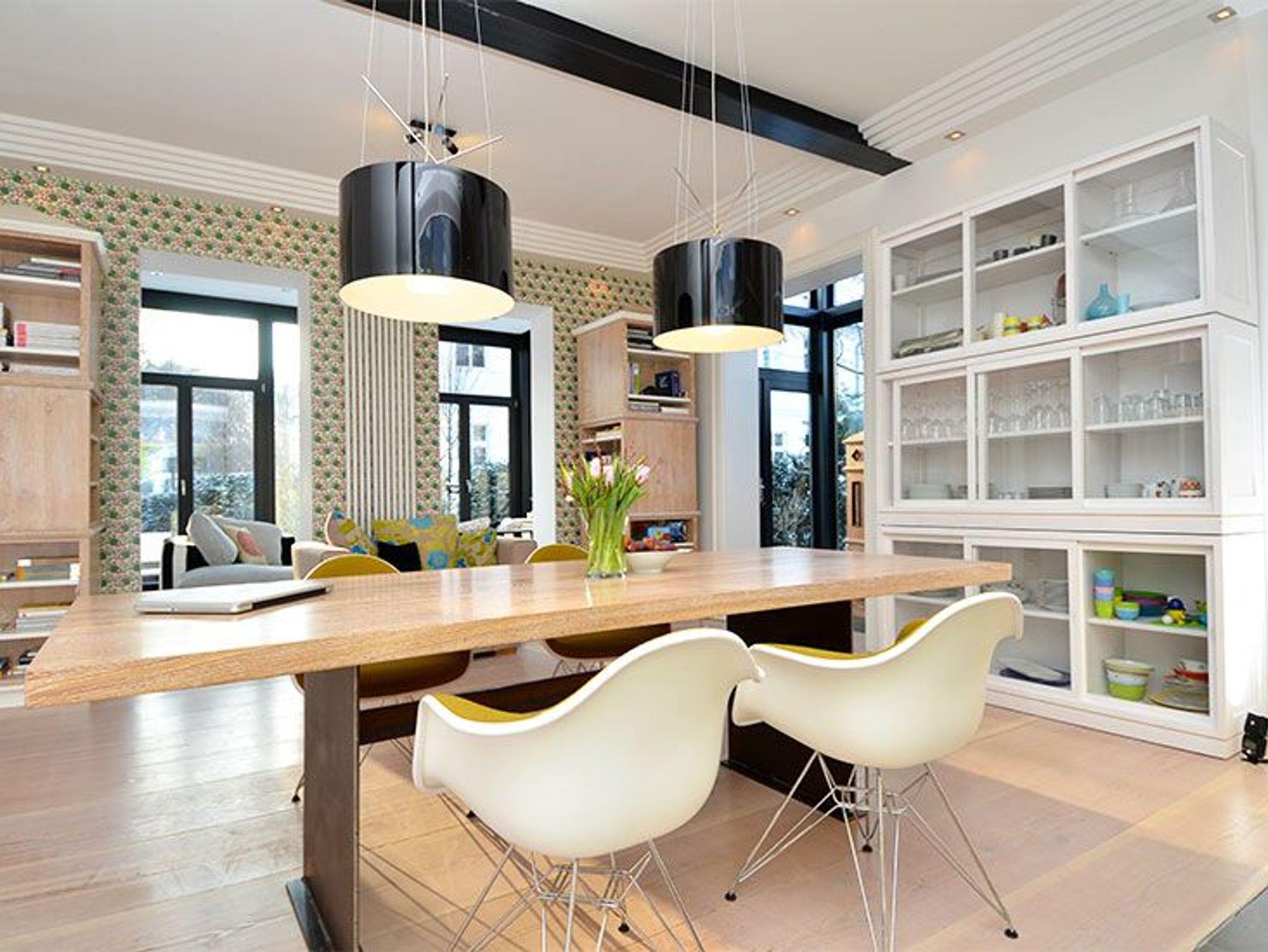 Alle Fenster des Hauses sind bodentief und sorgen für lichtdurchflutete Räume. Fenstermarkisen schützen vor zu viel Sonneneinstrahlung. Im ganzen Haus wurden die Böden der Wohnräume mit raumlangen, sehr breiten Douglasie-Holzdielen belegt. Die 3 Bäder wurden raumhoch gefliest und mit Designarmaturen von Dornbracht ausgestattet. Die großzügigen Echtglasduschen vermitteln ein besonderes Wellnessfeeling. Viele der Möbel sind maßangefertigte gekälkte Eiche-Vollholzmöbel.