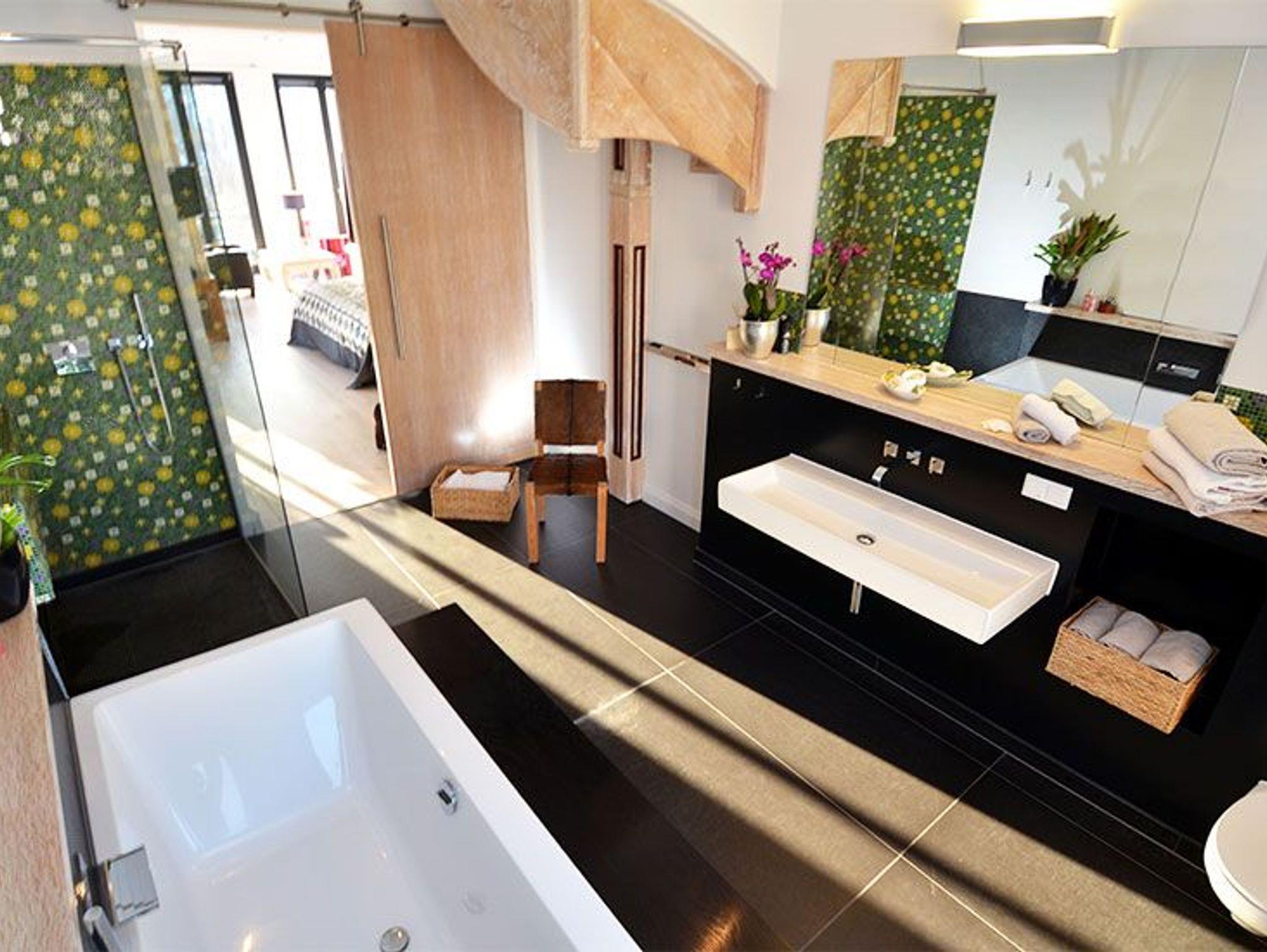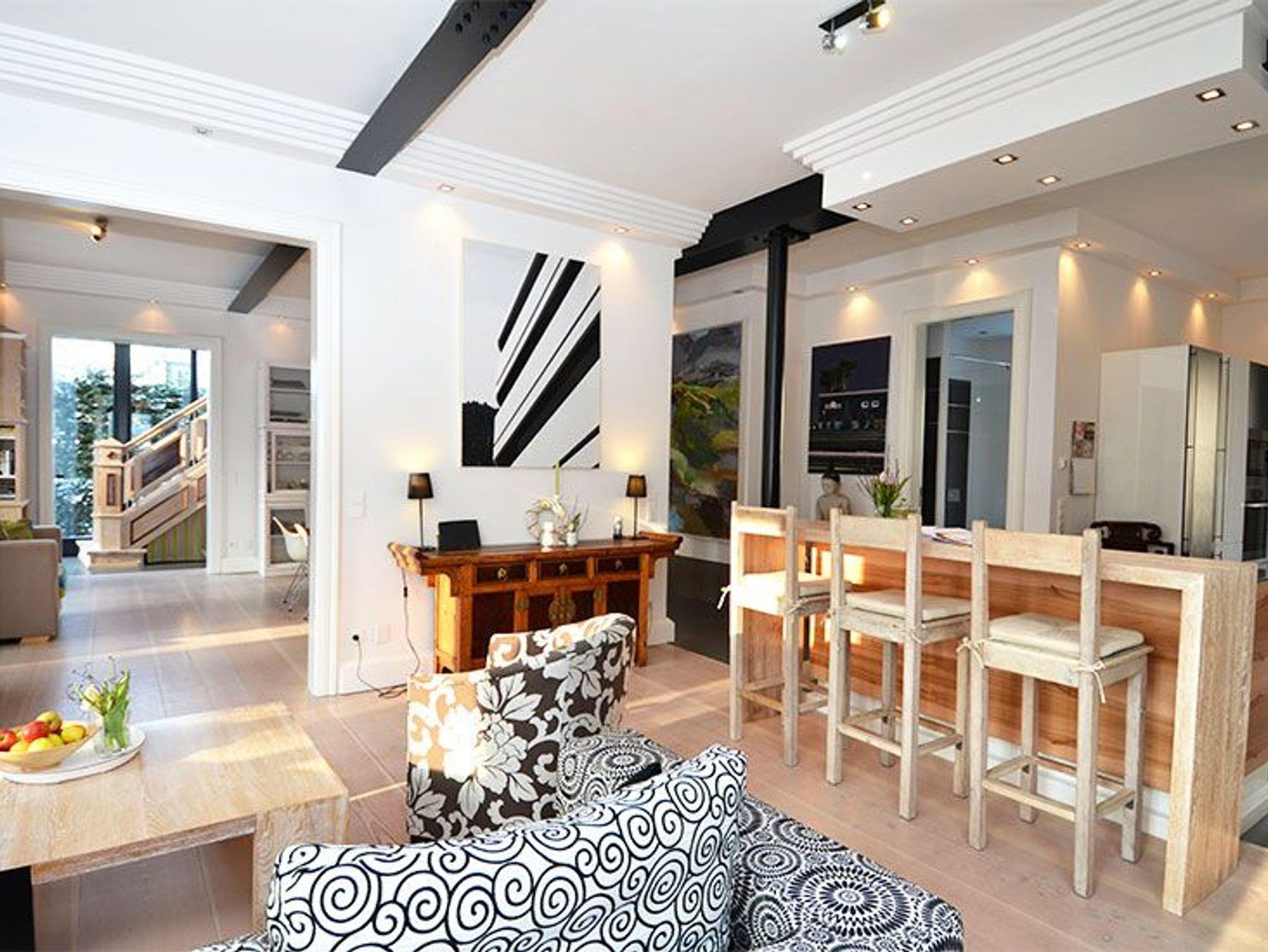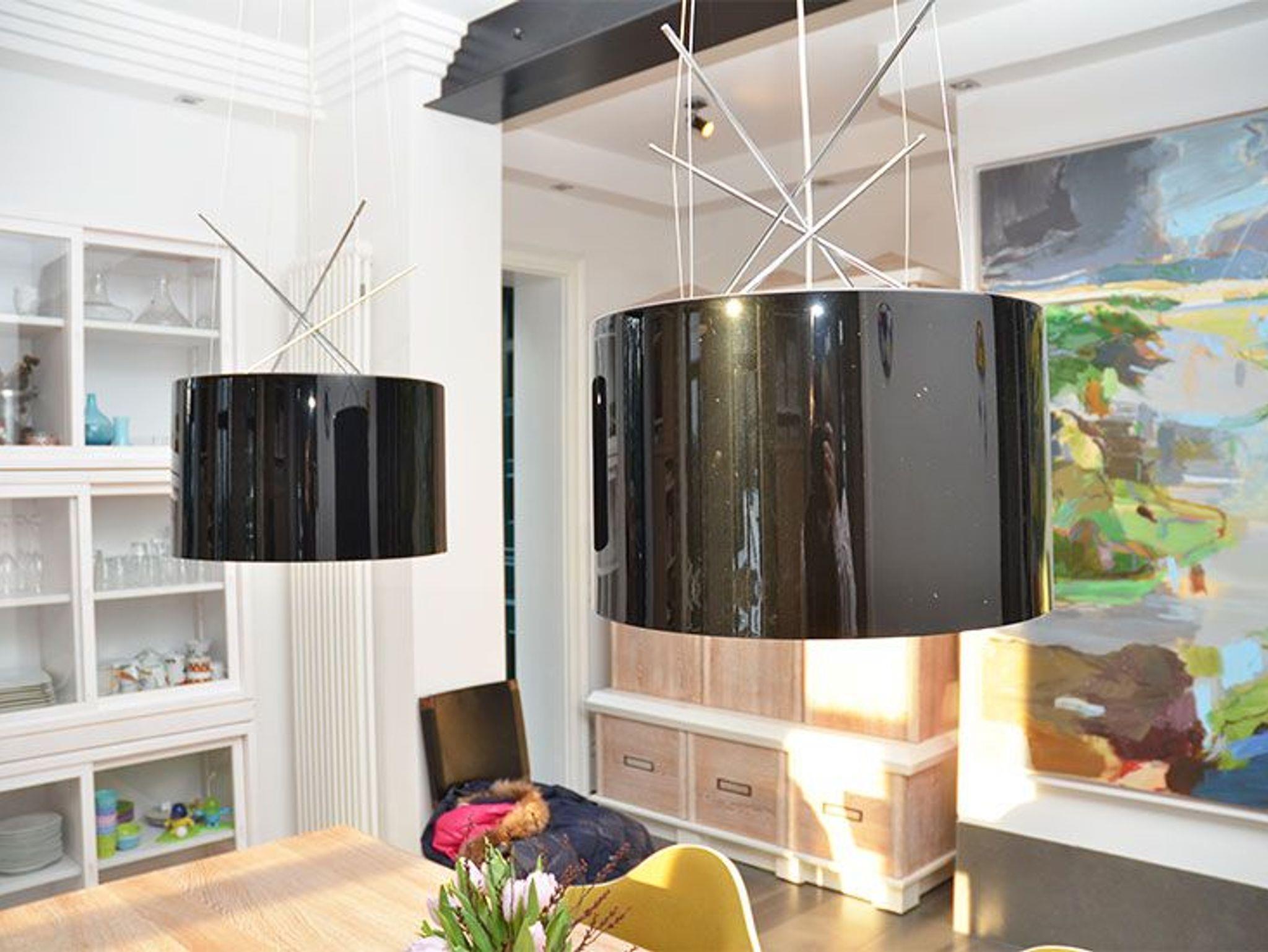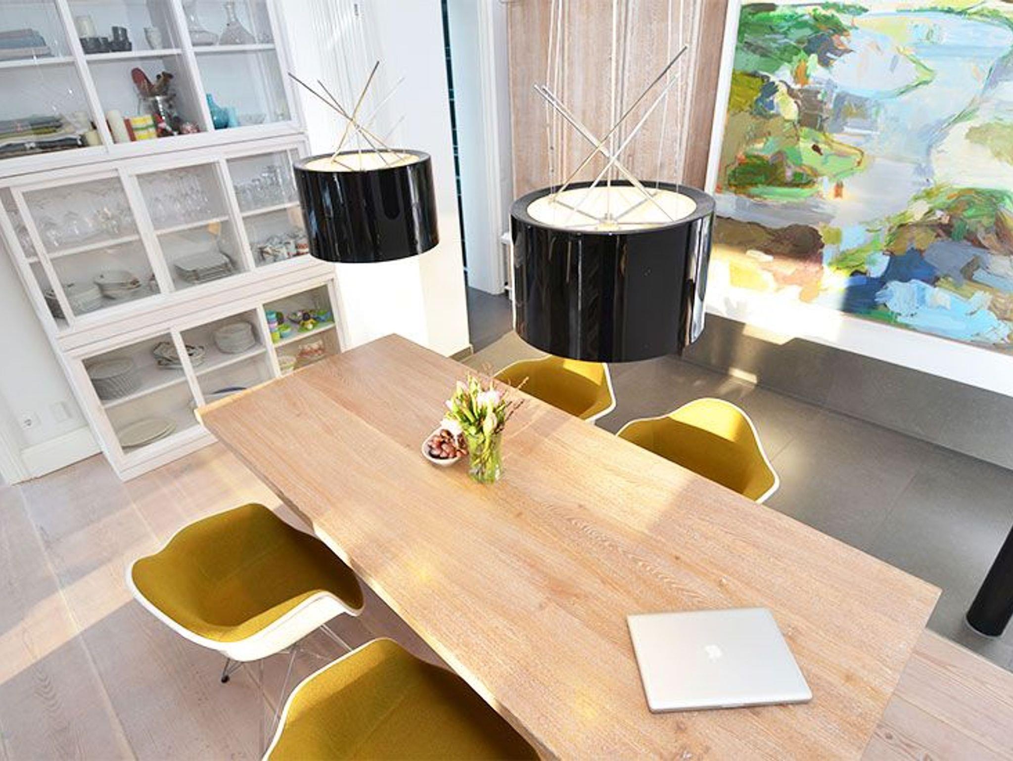 Alle Fenster des Hauses sind bodentief und sorgen für lichtdurchflutete Räume. Fenstermarkisen schützen vor zu viel Sonneneinstrahlung. Im ganzen Haus wurden die Böden der Wohnräume mit raumlangen, sehr breiten Douglasie-Holzdielen belegt. Die 3 Bäder wurden raumhoch gefliest und mit Designarmaturen von Dornbracht ausgestattet. Die großzügigen Echtglasduschen vermitteln ein besonderes Wellnessfeeling. Viele der Möbel sind maßangefertigte gekälkte Eiche-Vollholzmöbel.