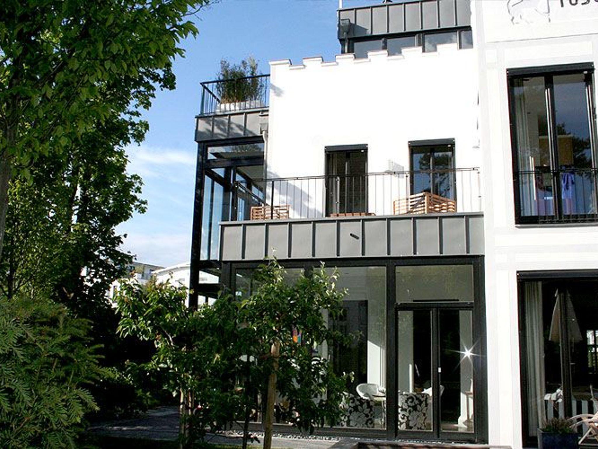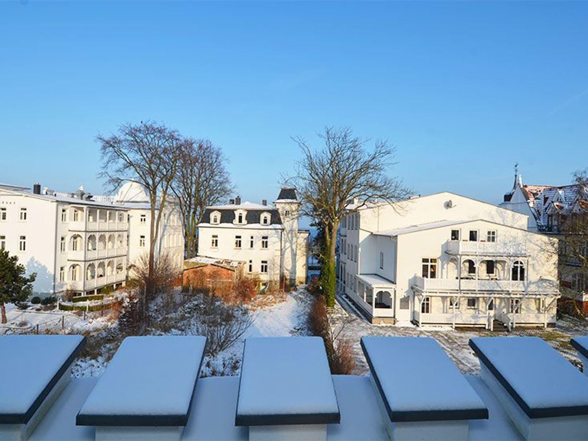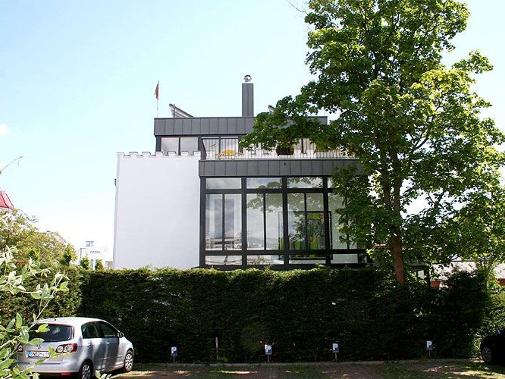 Eine Etage höher finden Sie das Penthouse auf dem Dach. Das Penthouse eröffnet durch bodentiefe Komplettverglasung einen wunderbaren Rundumblick über die Dächer von Binz und einen teilweisen Meerblick. Faltrollos schützen auch hier vor zu viel Sonne. Die Brüstung der schmalen, umlaufenden Dachterrasse hat Schlossturmcharakter und erinnert mit ihren kleinen Zinnen an das Altertum/Mittelalter. In dieser Zeit gab es eine römische Stadt namens Tusculum, die namensgebend war für die Villa Tusculum.
