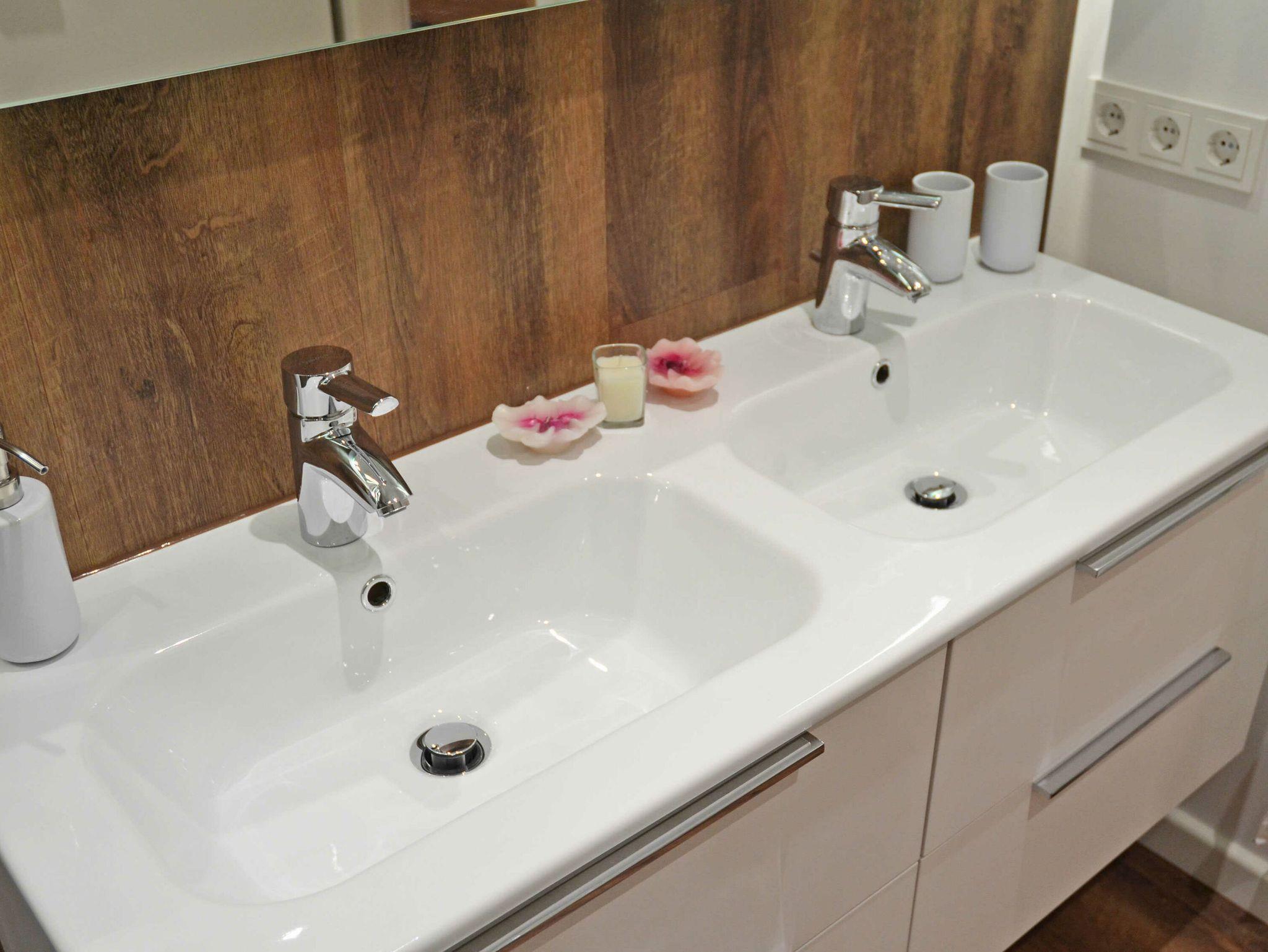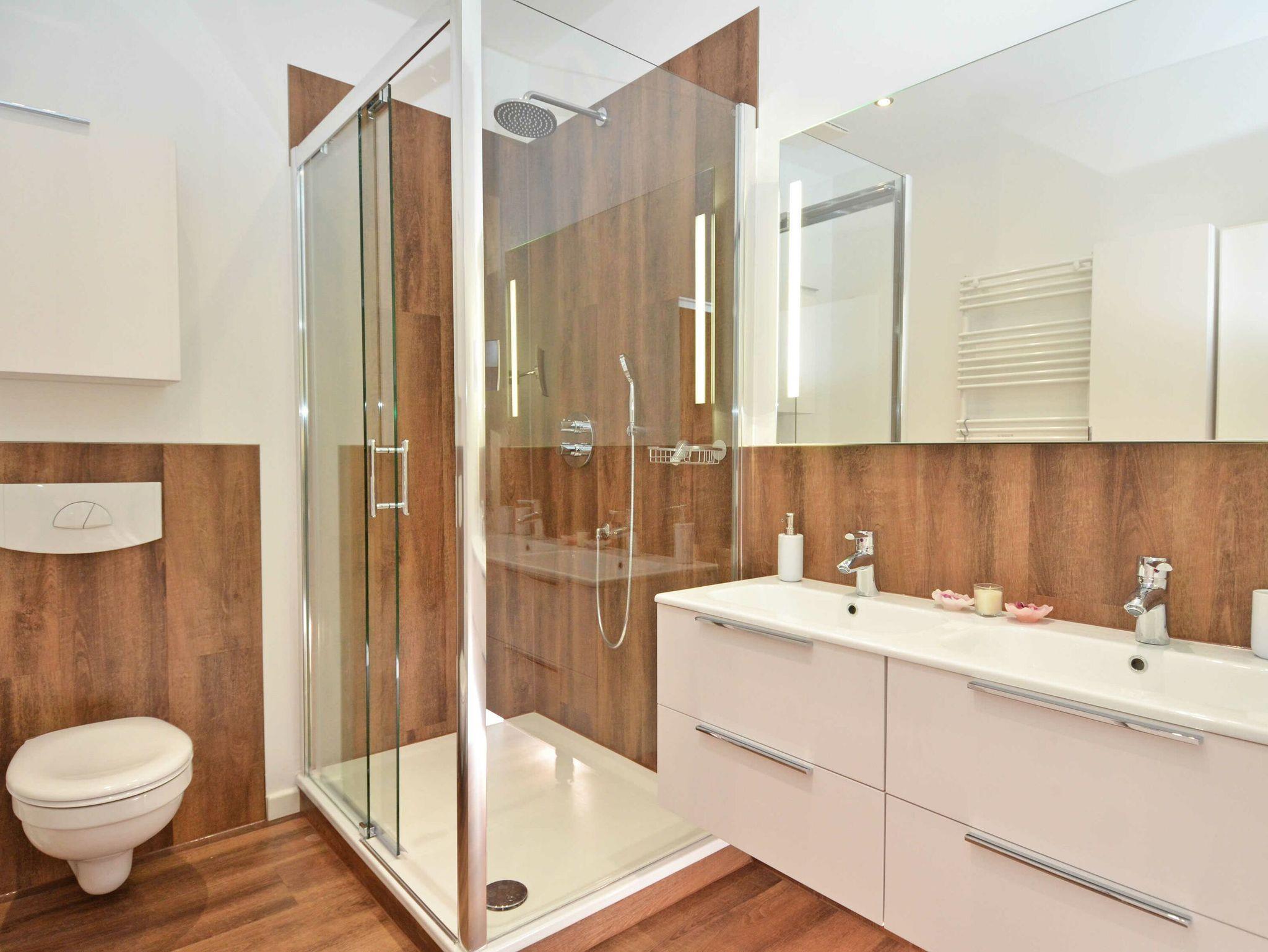 Im separaten geräumigen Badezimmer befinden sich eine Dusche/WC, ein Doppelwaschtisch, ein großer beleuchteter Spiegel mit separatem Kosmetikspiegel, ein Haartrockner und ein Handtuch-Heizkörper.