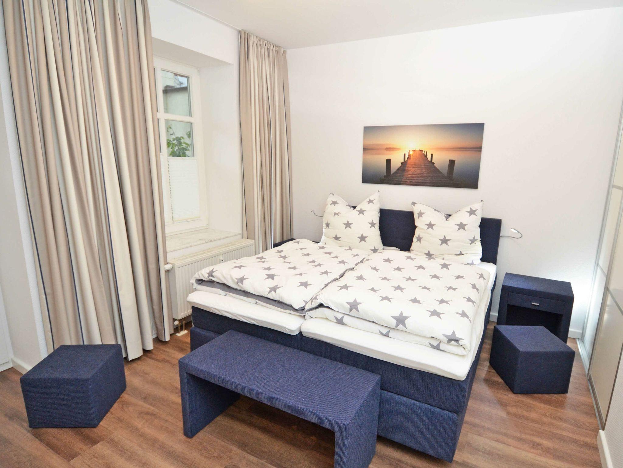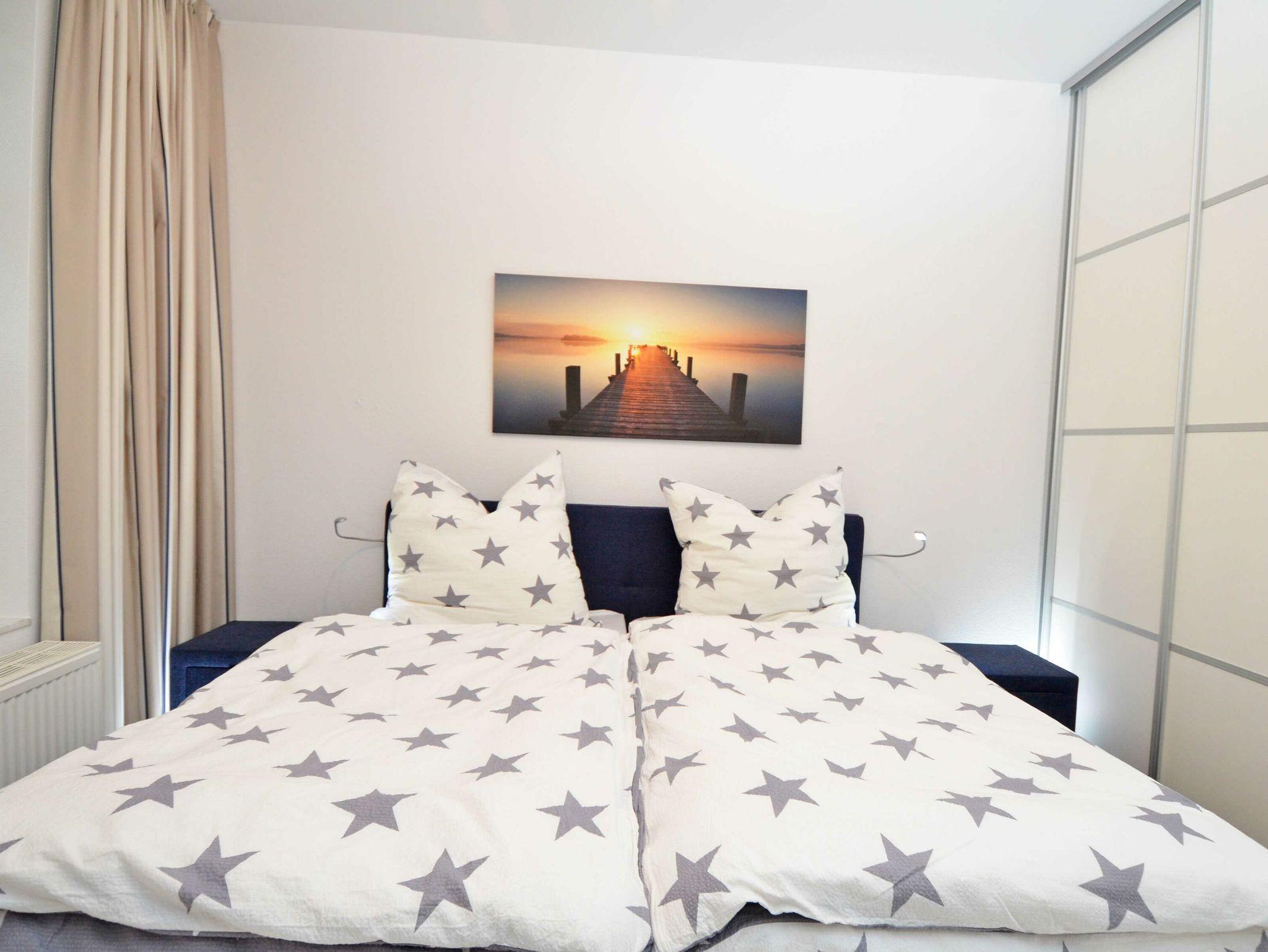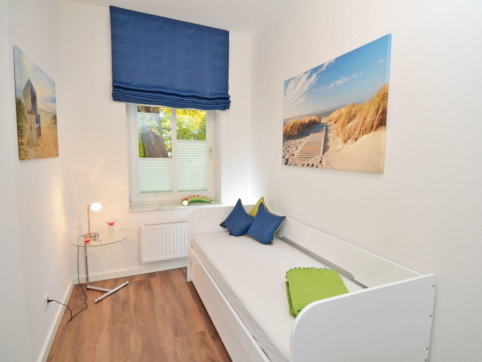 Das kleinere Schlafzimmer verfügt über ein Doppelbett der Größe 1,60 x 2,00 m, welches zu zwei einzeln stehenden, vollwertigen Betten umgebaut werden kann. Ein Einbauschrank und Verdunkelungsrollos sind ebenfalls vorhanden.