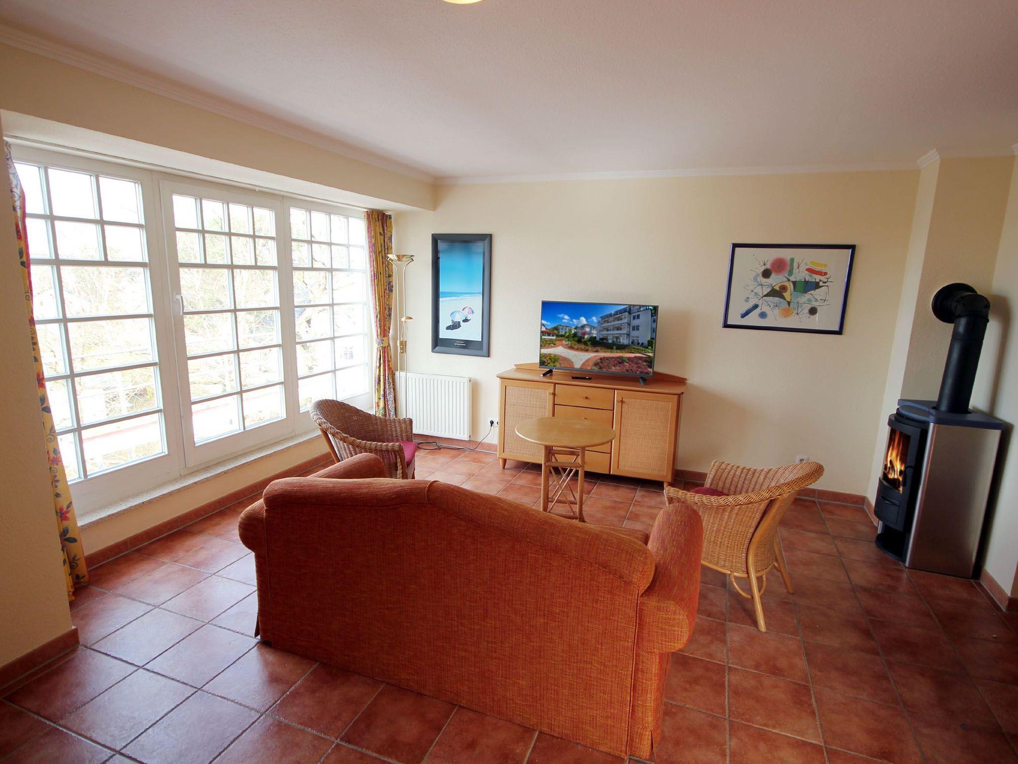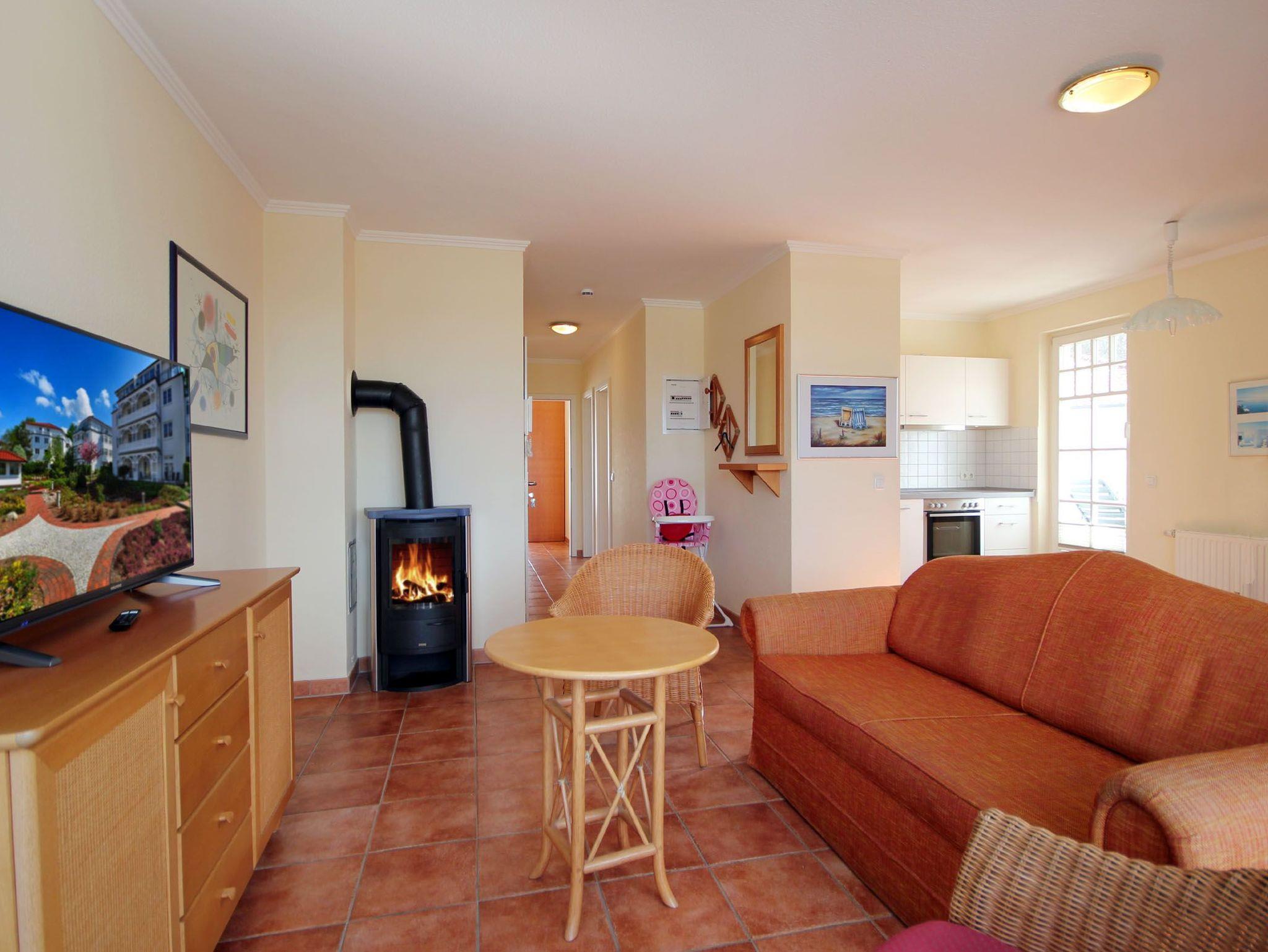 Penthousewohnung mit Kaminofen, Dachterrasse und Meerblick in Binz, ideal für entspannte Tage zu jeder Jahreszeit.