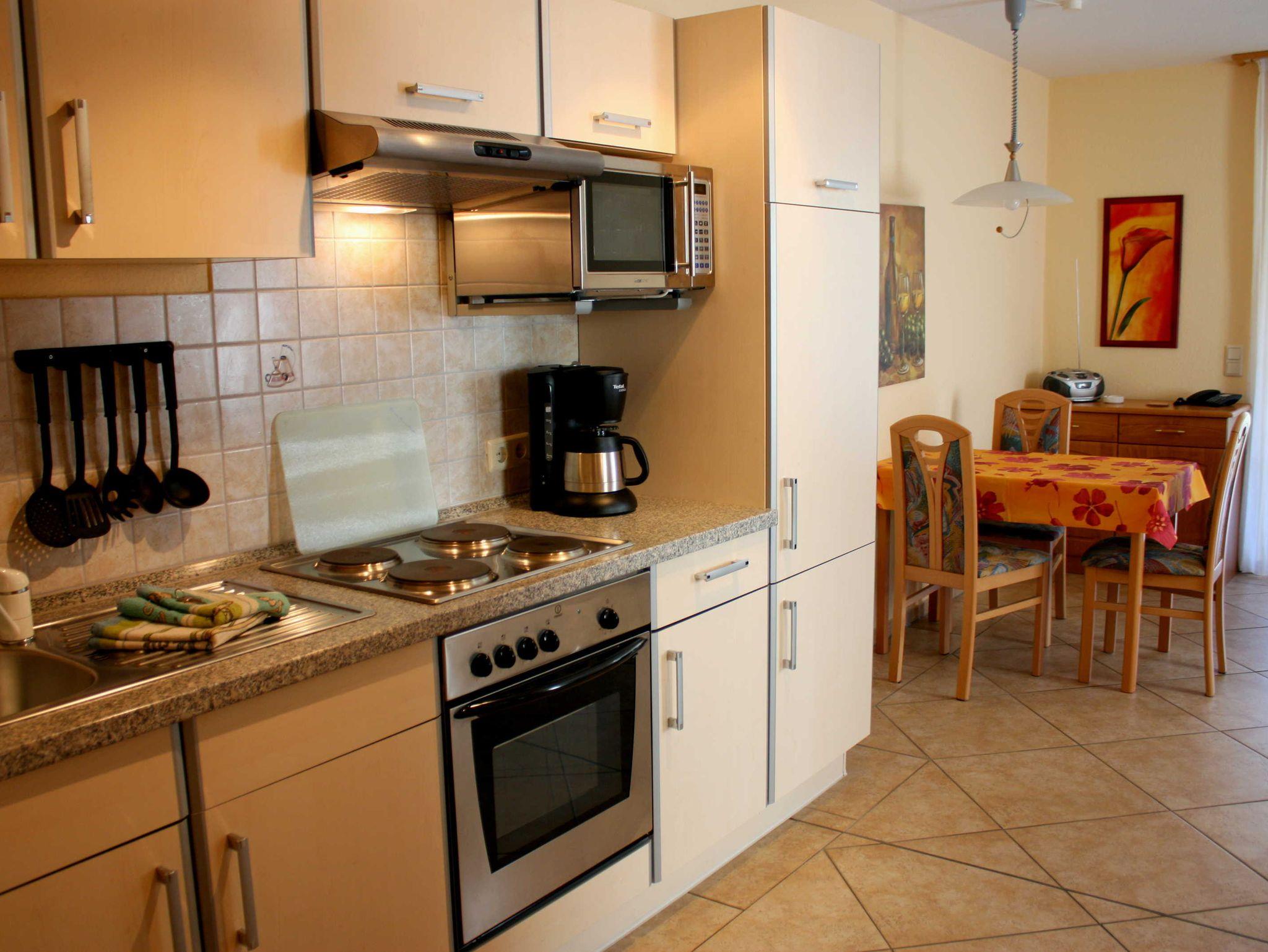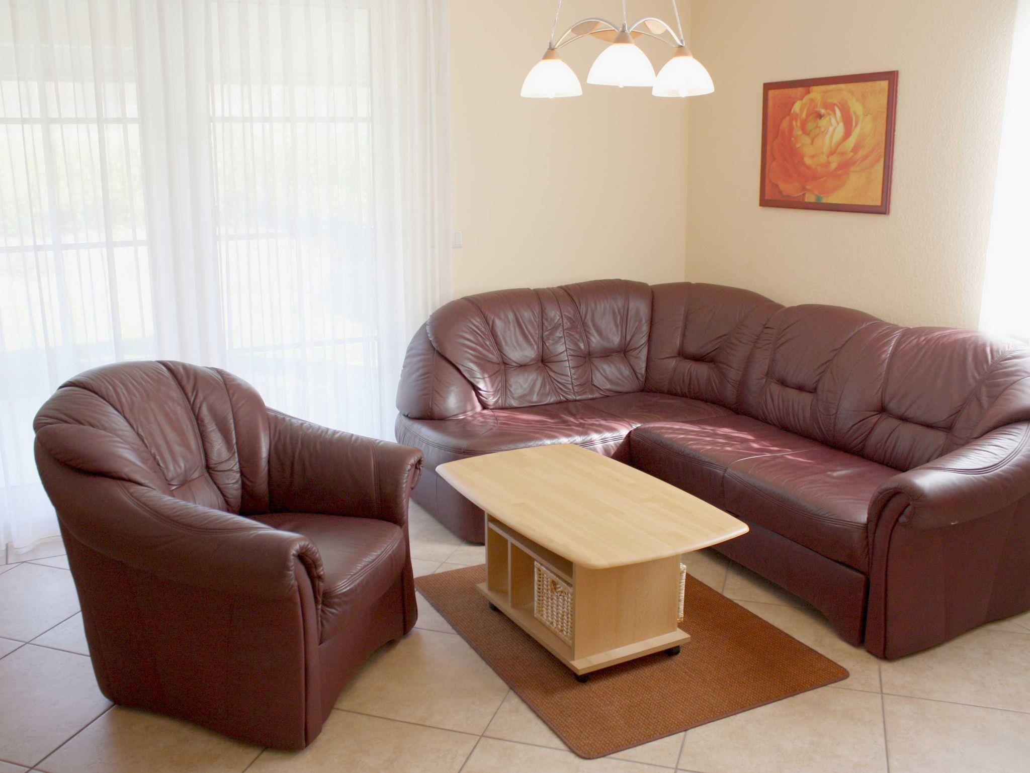 Die schöne und modern eingerichtete 3-Zimmerwohnung Nr. 12 befindet sich im Erdgeschoss des Hauses und verfügt über eine große überdachte Terrasse, die Sie zum Frühstücken nutzen können um so Energie für einen tollen Strand- oder erlebnisreichen Ausflugstag zu tanken. Die Nichtraucherwohnung verfügt über eine Größe von ca. 50 qm und ist mit bis zu 3 Personen belegbar. Die helle Wohnung verfügt über einen vorgelagerten Flur mit einer Garderobe, einem gemütlichen Wohnbereich mit Wohnküche sowie einen Essplatz, zwei Schlafzimmer und ein Tageslichtbad. Im Wohnbereich erwartet Sie eine bequeme Sitzecke. Zudem gelangen Sie vom Wohnzimmer aus auf die möblierte Terrasse. Die technische Einrichtung umfasst einen Flachbildfernseher, ein Radio mit CD-Player sowie einen gebührenfreien WLAN-Zugang. In der ausgestatteten Küchenzeile erwartet Sie unter anderem ein Backofen, Mikrowelle, 4 Plattenkochfeld, Kühlschrank, Kaffeemaschine, Toaster, Wasserkocher sowie umfangreiches Kücheninventar. Das Schlafzimmer verfügt über ein großes Doppelbett mit Nachttischen, einen Kleiderschrank mit Spiegel sowie Verdunklungsvorhänge für eine erholsame Nachtruhe. Das zweite Schlafzimmer erwartet Sie mit einem Einzelbett. Im Bad steht Ihnen eine Dusche, Waschtisch, Kosmetikspiegel und WC zur Verfügung. Für unsere kleinen Gäste stellen wir gern auf Anfrage ein Kinderreisebett sowie einen Hochstuhl bereit.