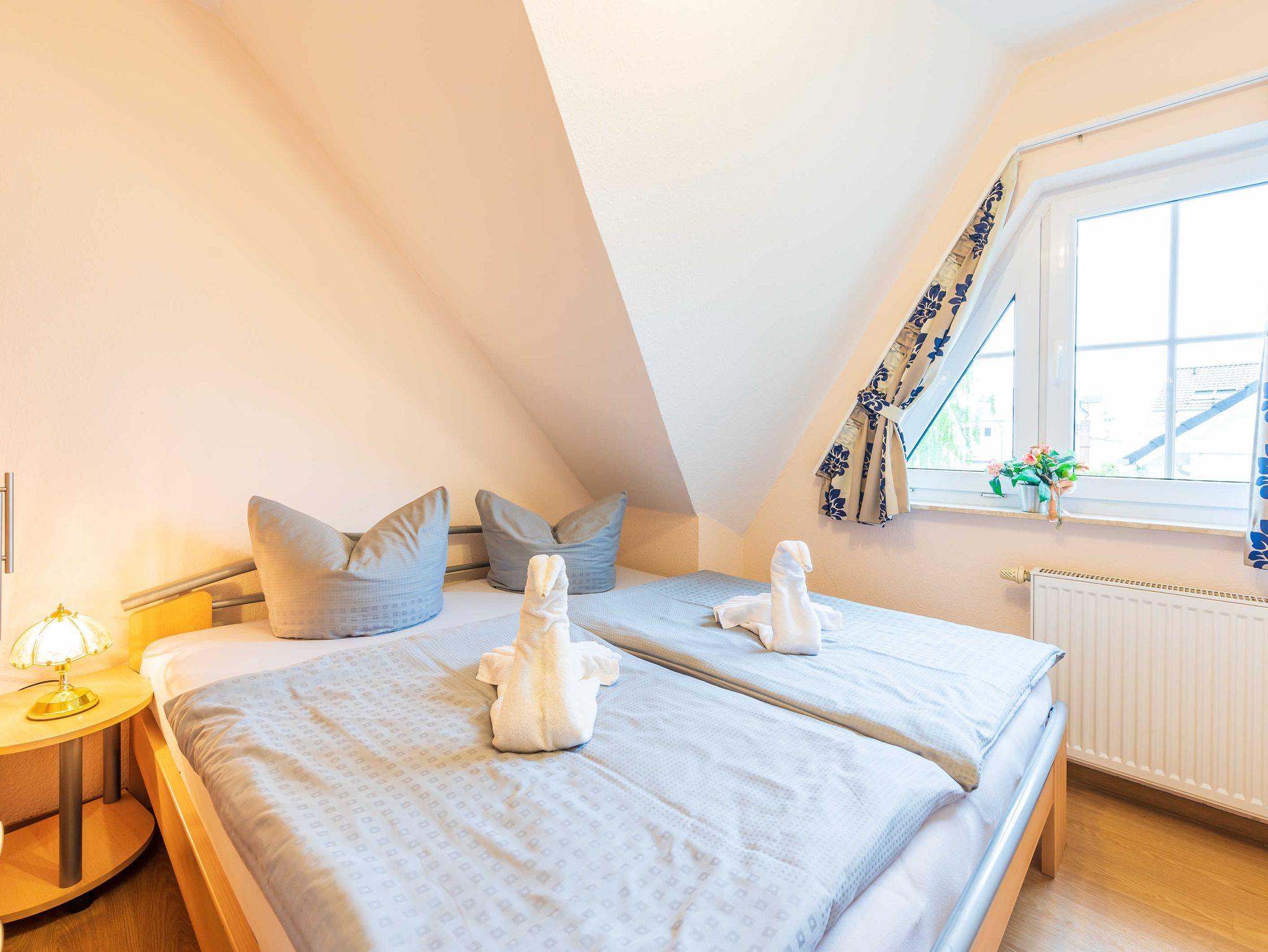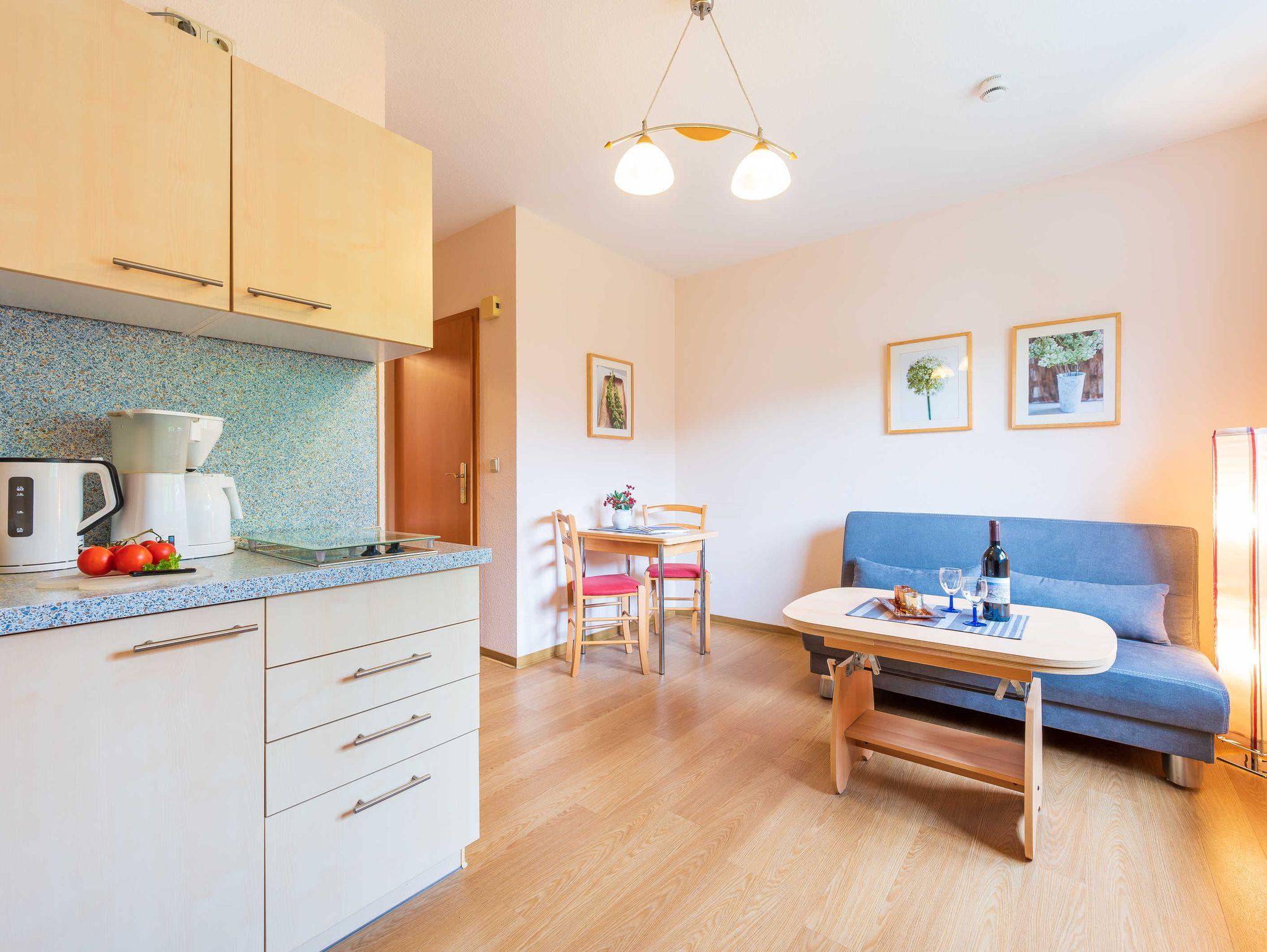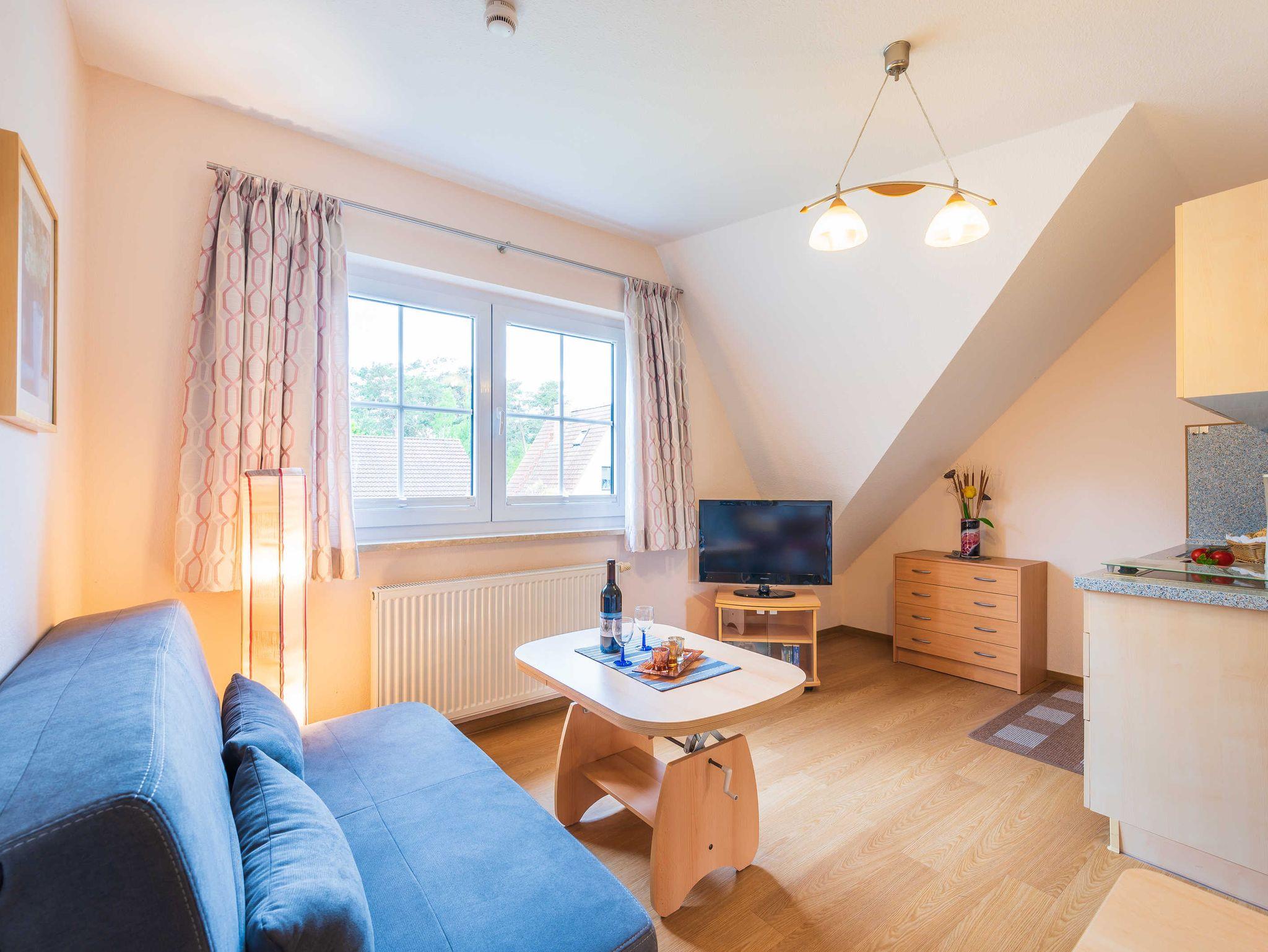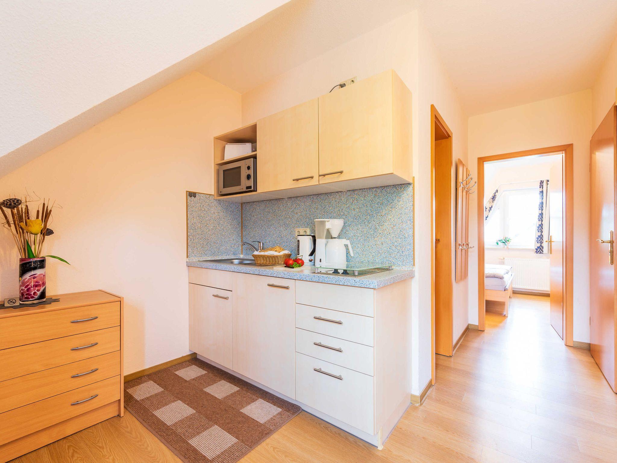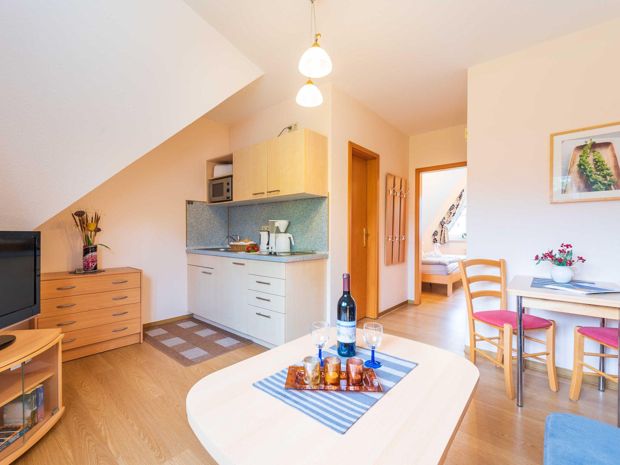 Das Appartement 2 im 1.OG/DG, ist individuell sehr wohnlich und gemütlich eingerichtet. Die ca 25 m² große Wohnung ist für max. 2 Personen ausgerichtet und verfügt über einen Wohnraum und Schlafraum sowie DU/WC. Im Wohnbereich befindet sich eine bequeme Sitzcouch,TV, Eßbereich sowie eine kleine Küchenzeile ausgestattet mit 2-Platten Cerankochfeld,Kühlschrank,Microwelle und diversen Kleingeräten.Schlafraum mit Boxspringbett (1,60m x 2.00m) und Kleiderschrank.. Terrasse zur gemeinsamen Nutzung. 1 PKW-Stellplatz steht auf dem Grundstück kostenfrei zur Verfügung. Fahrräder können in der abschließbaren Garage untergebracht werden.