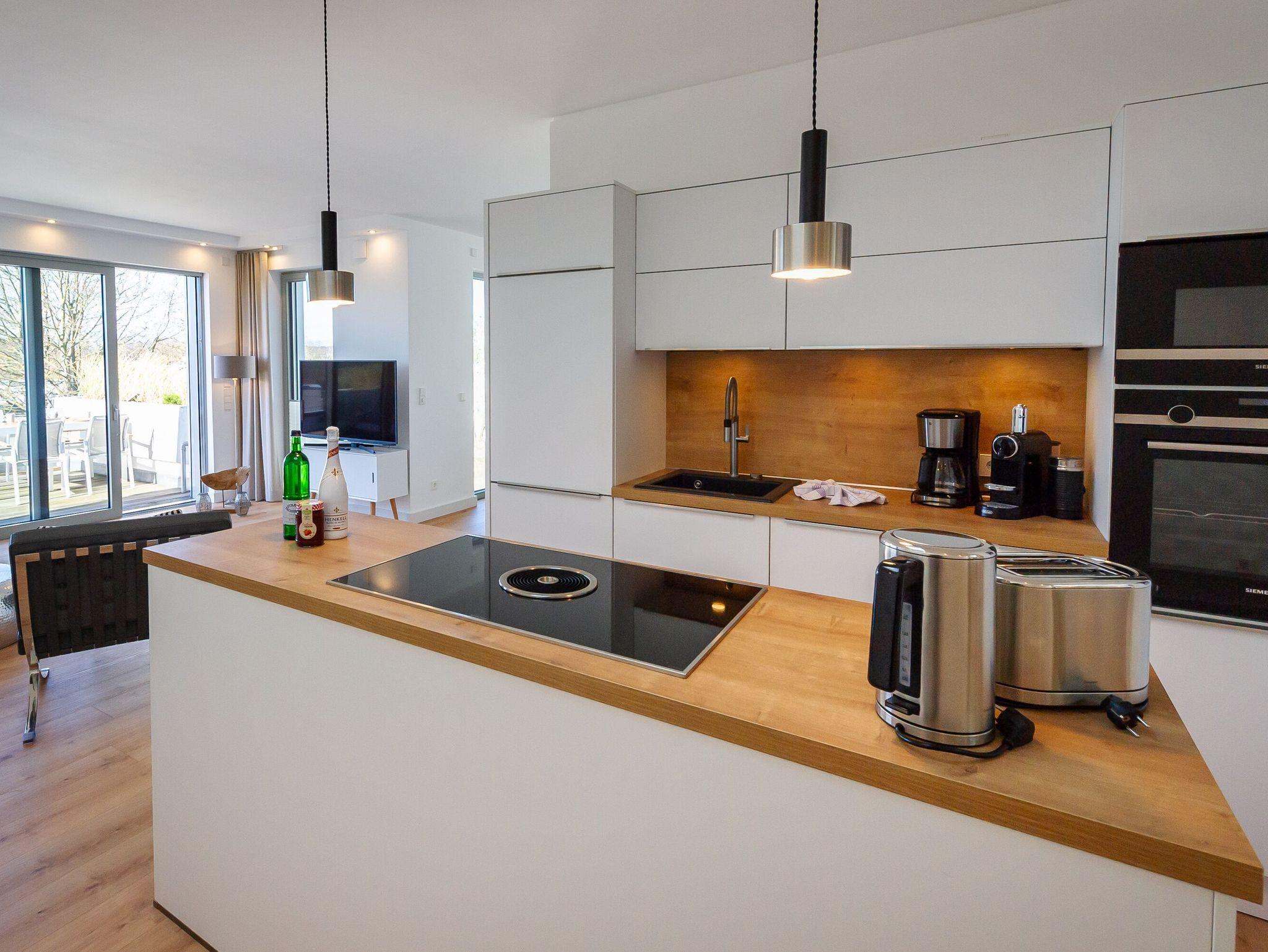 Am großen exklusiven Esstisch mit Holzplatte und Glasfüßen genießen Sie den Blick ins Grüne durch das bodentiefe Glaselement. Zusätzlich befindet sich im Bereich des Esszimmers ein gemütlicher „Window-Seat“ mit großzügig gepolsterter Sitzfläche und Kissen, der zum Verweilen und Lesen einlädt. Die Küche mit Kochinsel ist komplett ausgestattet, angefangen beim Kühlschrank, Geschirrspüler, Mikrowelle, Backofen, Bora Induktionskochfeld, Koch- und Essgeschirr bis hin zu einer Nespressomaschine, Kaffeemaschine, Saftpresse, Toaster und vieles mehr.