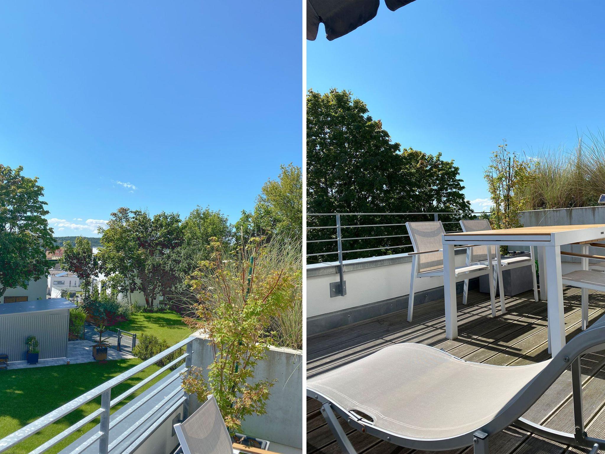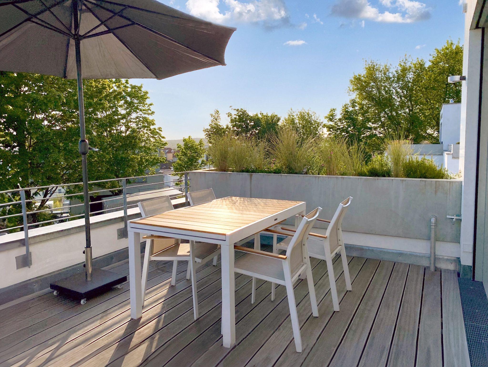 Dem Wohnbereich vorgelagert ist die große Dachterrasse, wo neben einem ausziehbaren Esstisch für vier Personen auch zwei bequeme Sonnenliegen zur Verfügung stehen. Die Terrasse ist außerdem mit einem großen Sonnenschirm ausgestattet.