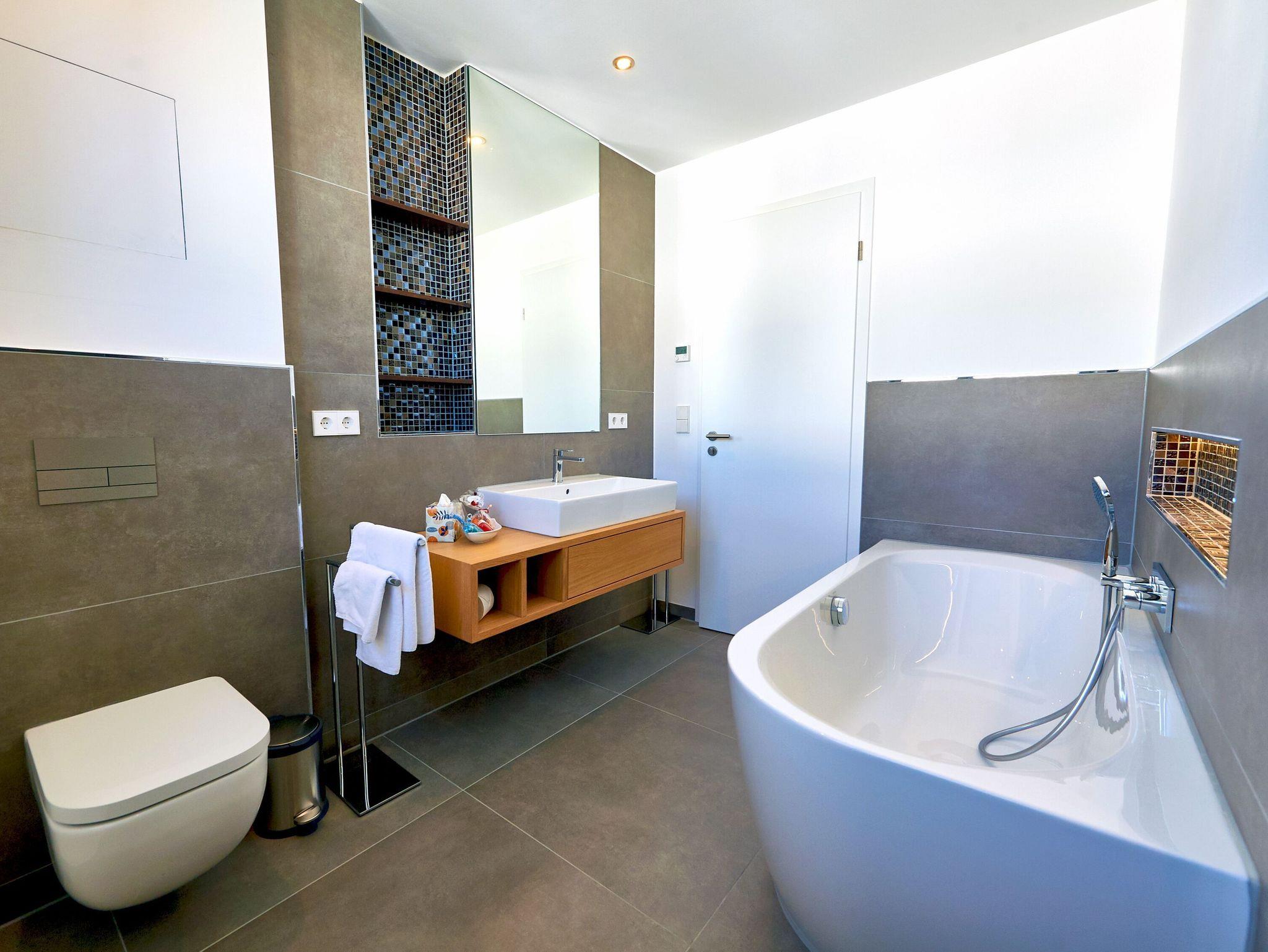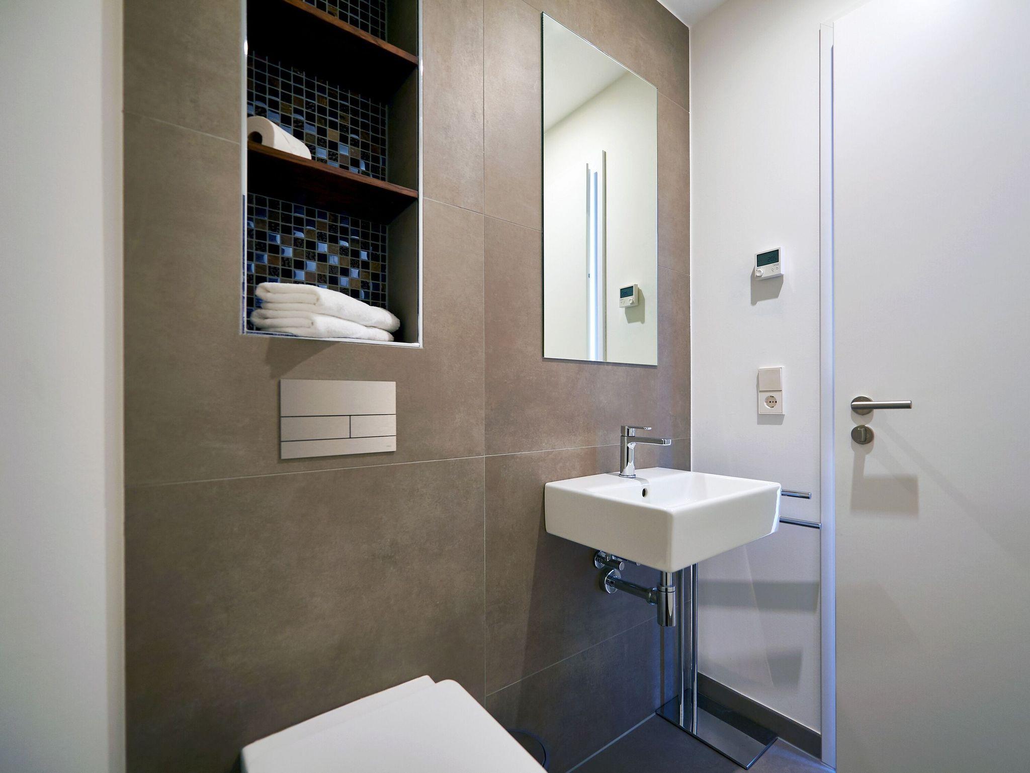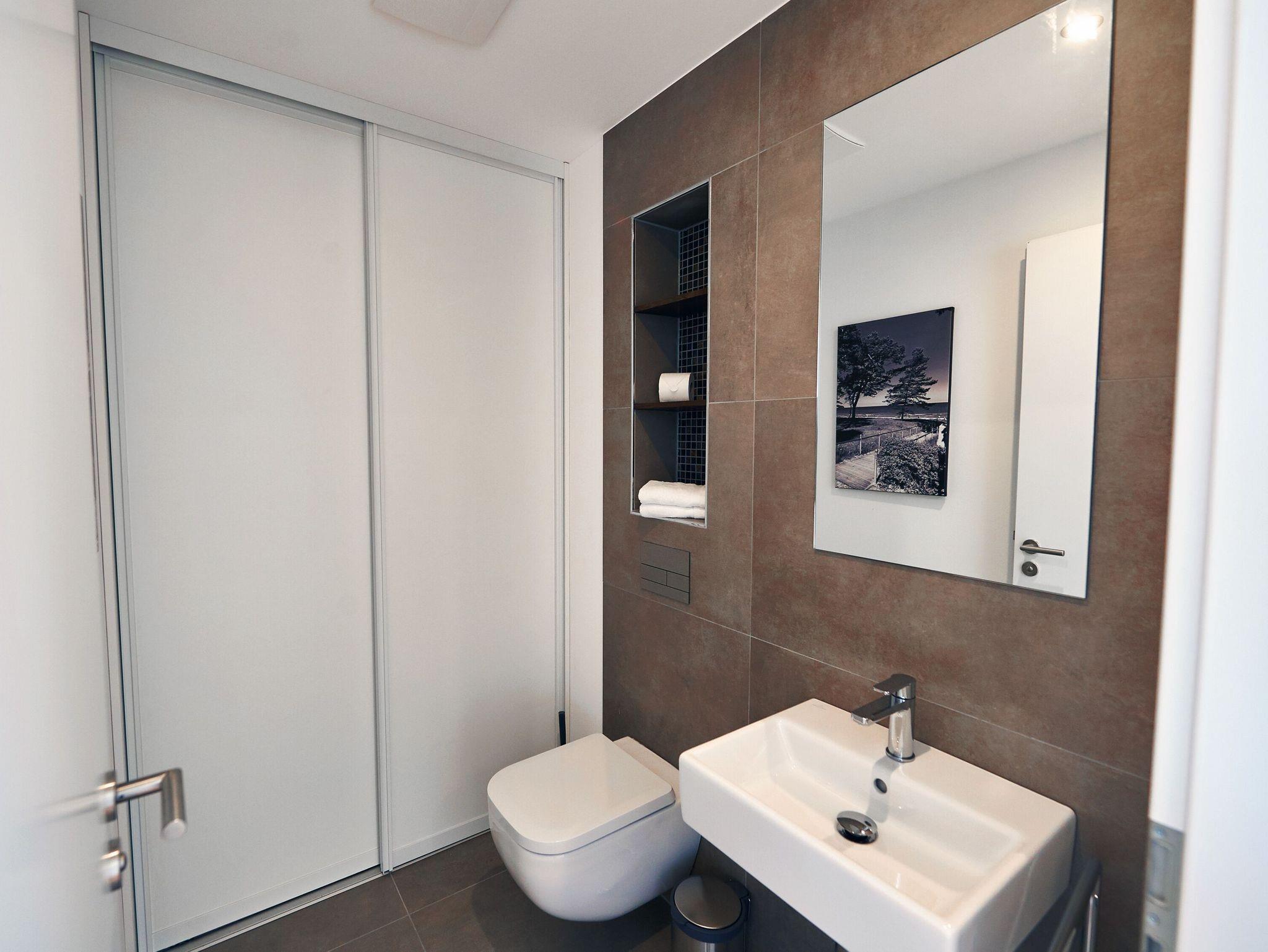 Auch das exklusive Badezimmer mit Badewanne und einer großzügigen, ebenerdigen Dusche mit Regenbrause, jeweils mit beleuchteten Ablageflächen, WC, Waschtisch mit genügend Ablageflächen sowie Kosmetikspiegel und Fön überzeugen rundum. Für den besonderen Komfort steht darüber hinaus ein zusätzliches Gäste-WC zur Verfügung. Hier finden Sie im Schiebetürenschrank einen Wäscheständer, Bügelbrett, Bügeleisen sowie einen Dyson-Staubsauger und diverse Haushaltsgeräte.