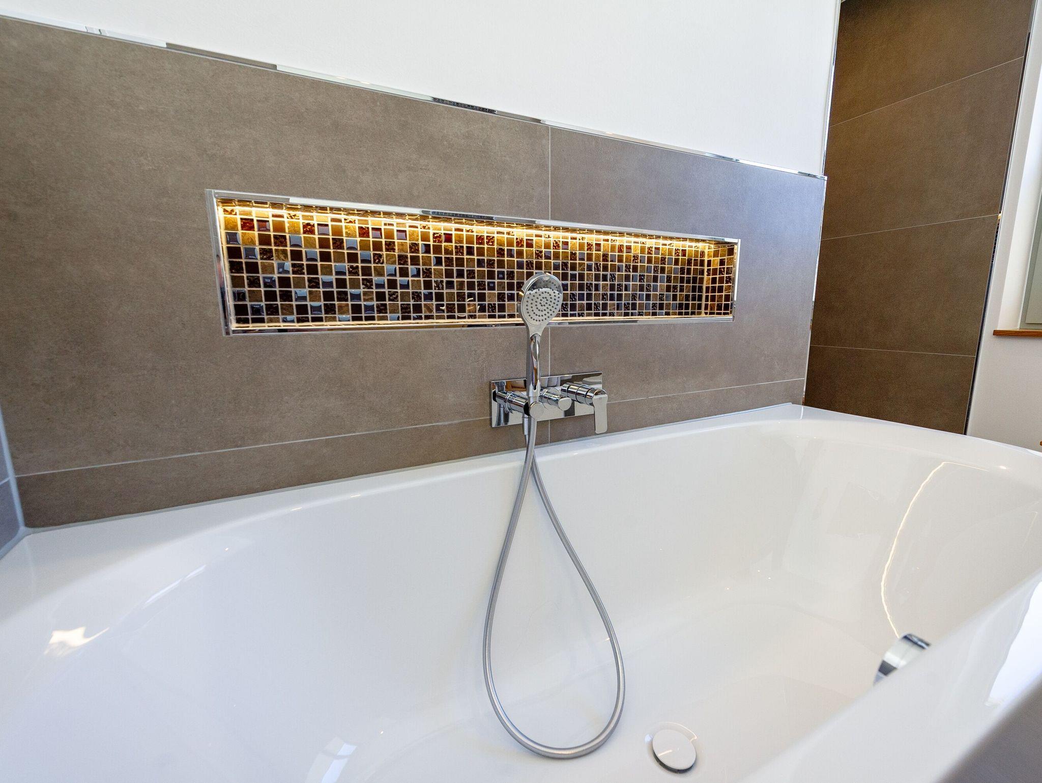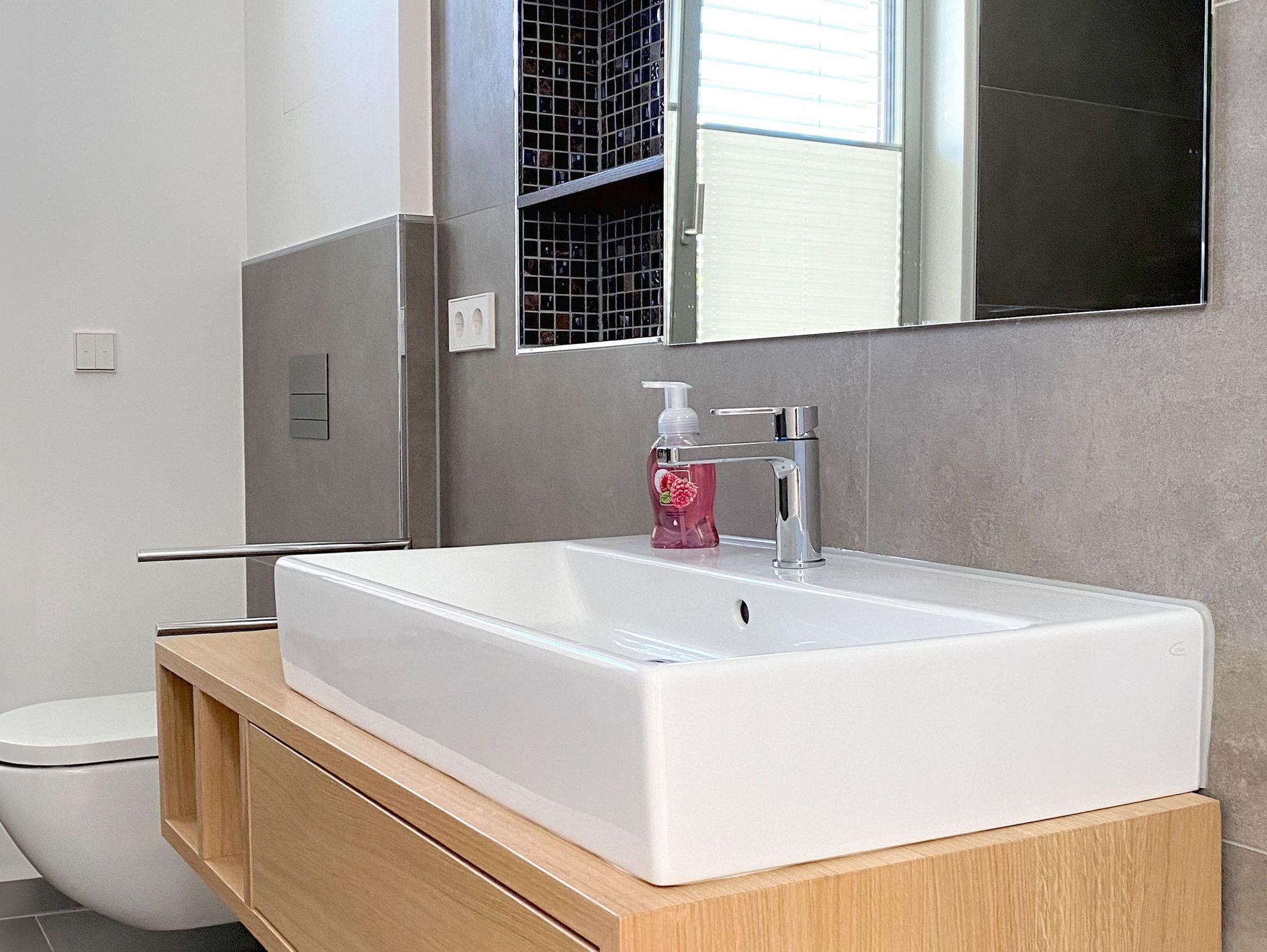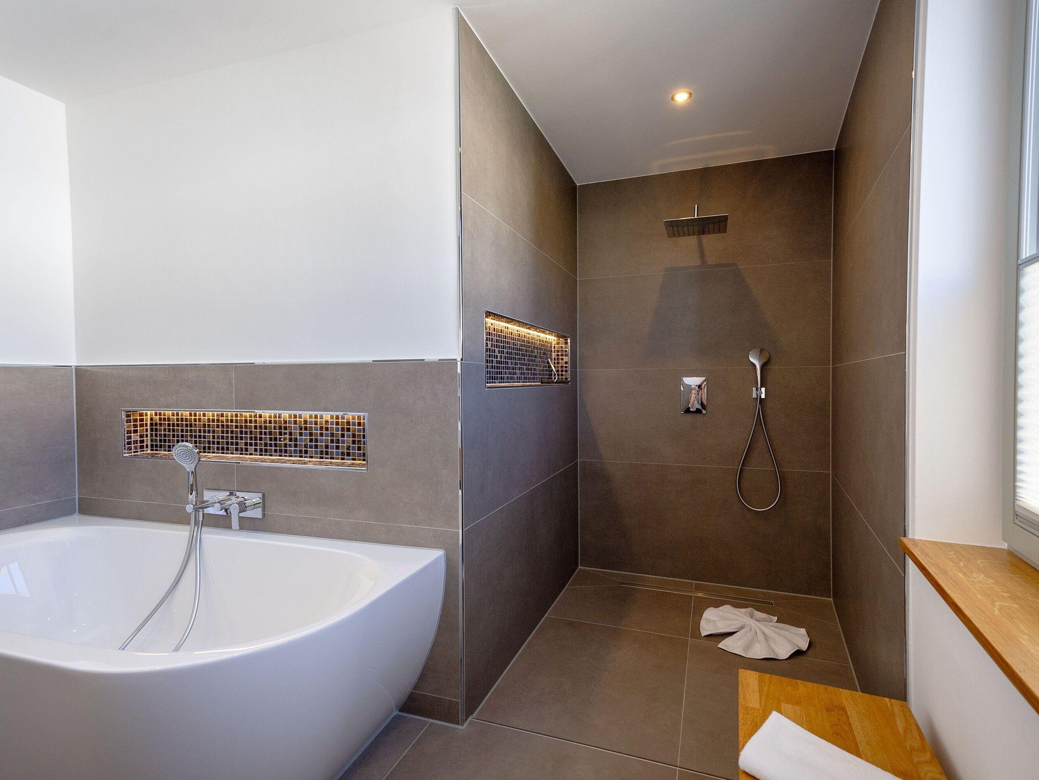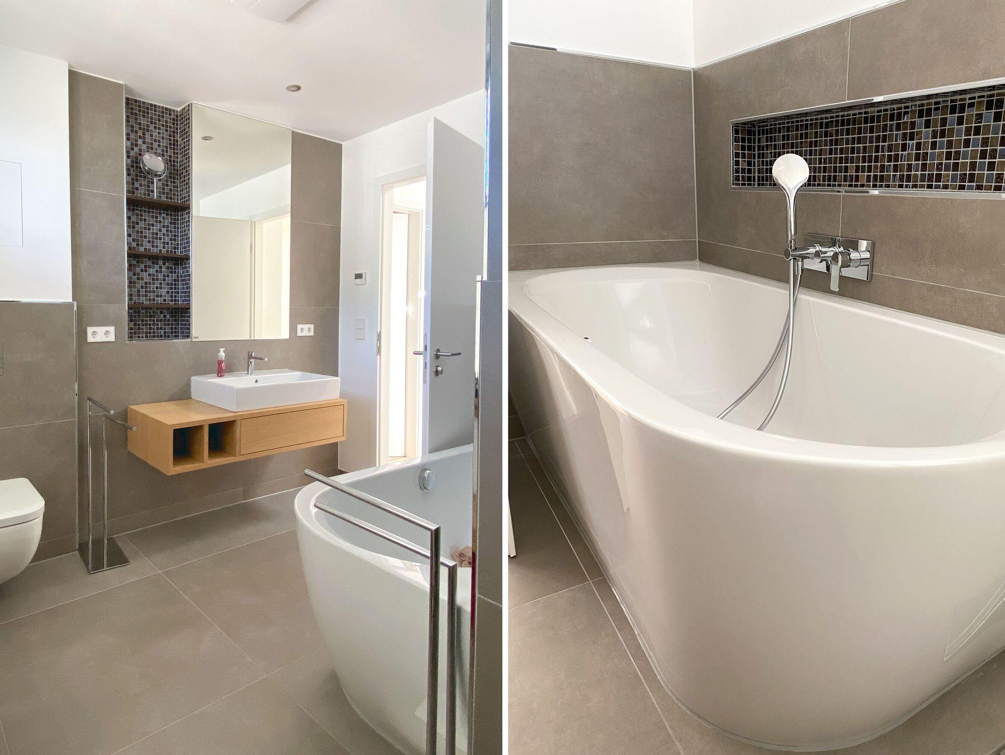 Auch das exklusive Badezimmer mit Badewanne und einer großzügigen, ebenerdigen Dusche mit Regenbrause, jeweils mit beleuchteten Ablageflächen, WC, Waschtisch mit genügend Ablageflächen sowie Kosmetikspiegel und Fön überzeugen rundum. Für den besonderen Komfort steht darüber hinaus ein zusätzliches Gäste-WC zur Verfügung. Hier finden Sie im Schiebetürenschrank einen Wäscheständer, Bügelbrett, Bügeleisen sowie einen Dyson-Staubsauger und diverse Haushaltsgeräte.