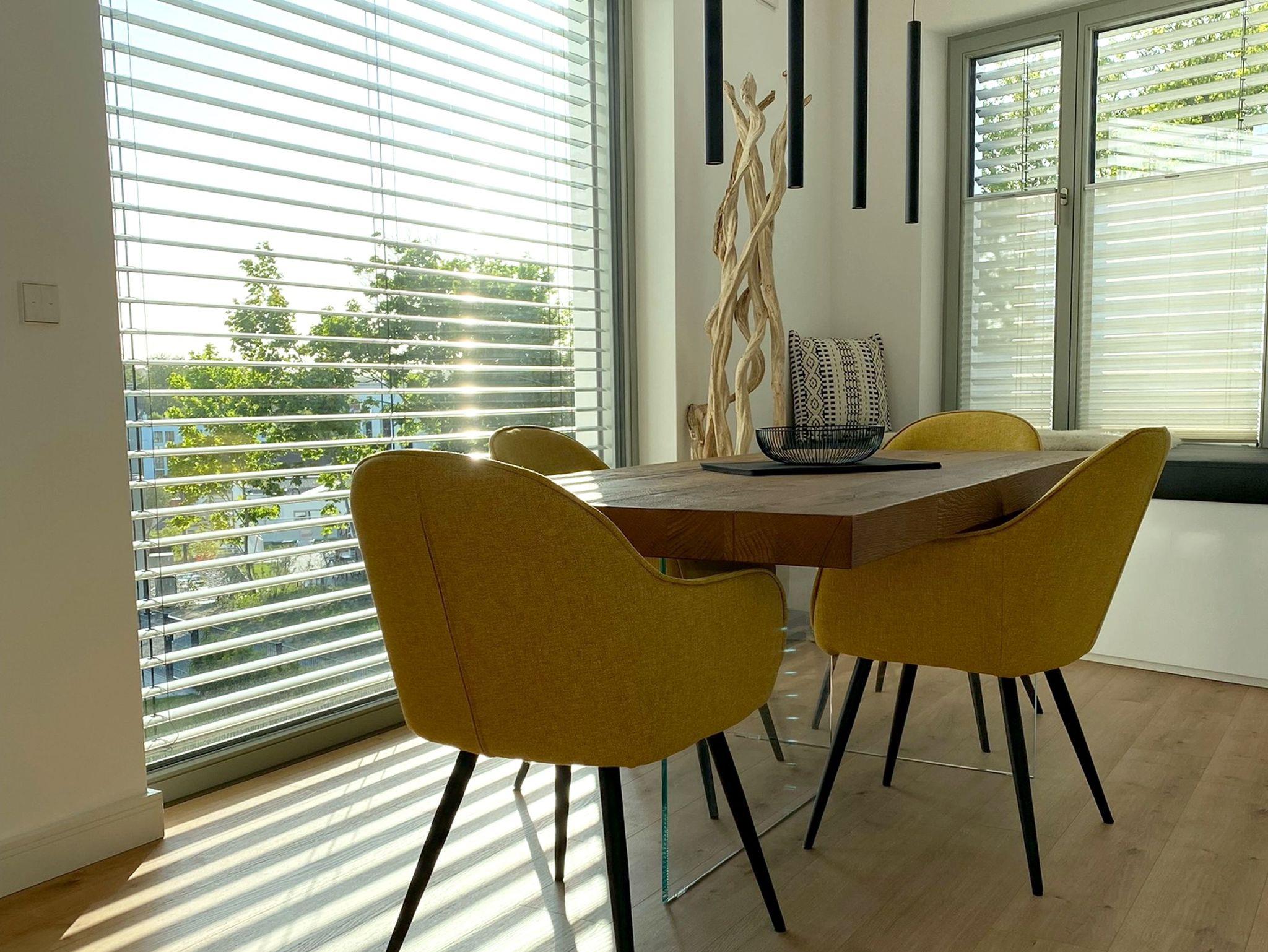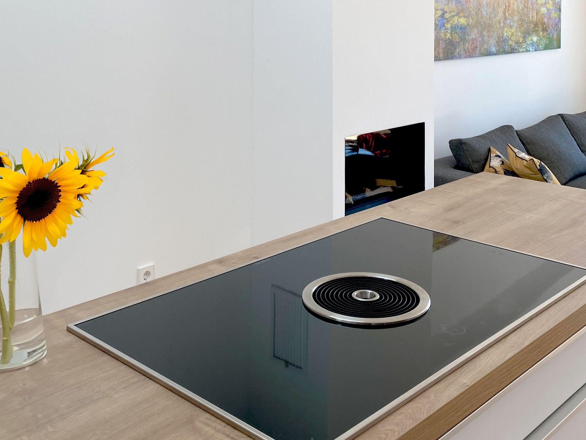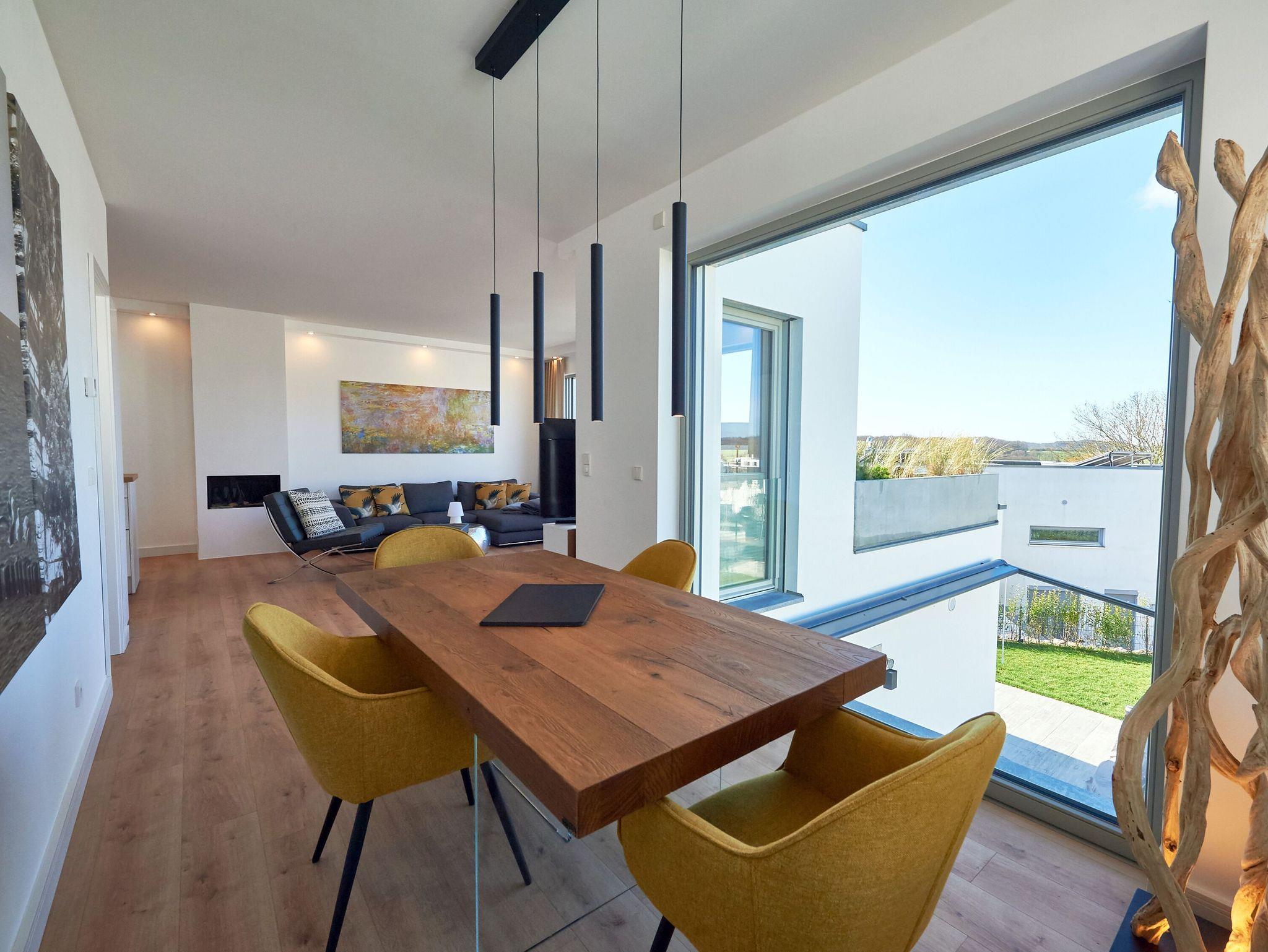 Am großen exklusiven Esstisch mit Holzplatte und Glasfüßen genießen Sie den Blick ins Grüne durch das bodentiefe Glaselement. Zusätzlich befindet sich im Bereich des Esszimmers ein gemütlicher Window-Seat mit großzügig gepolsterter Sitzfläche und Kissen, der zum Verweilen und Lesen einlädt. Die Küche mit Kochinsel ist komplett ausgestattet, angefangen beim Kühlschrank, Geschirrspüler, Mikrowelle, Backofen, Bora Induktionskochfeld, Koch- und Essgeschirr bis hin zu einer Nespressomaschine, Kaffeemaschine, Saftpresse, Toaster und vieles mehr.