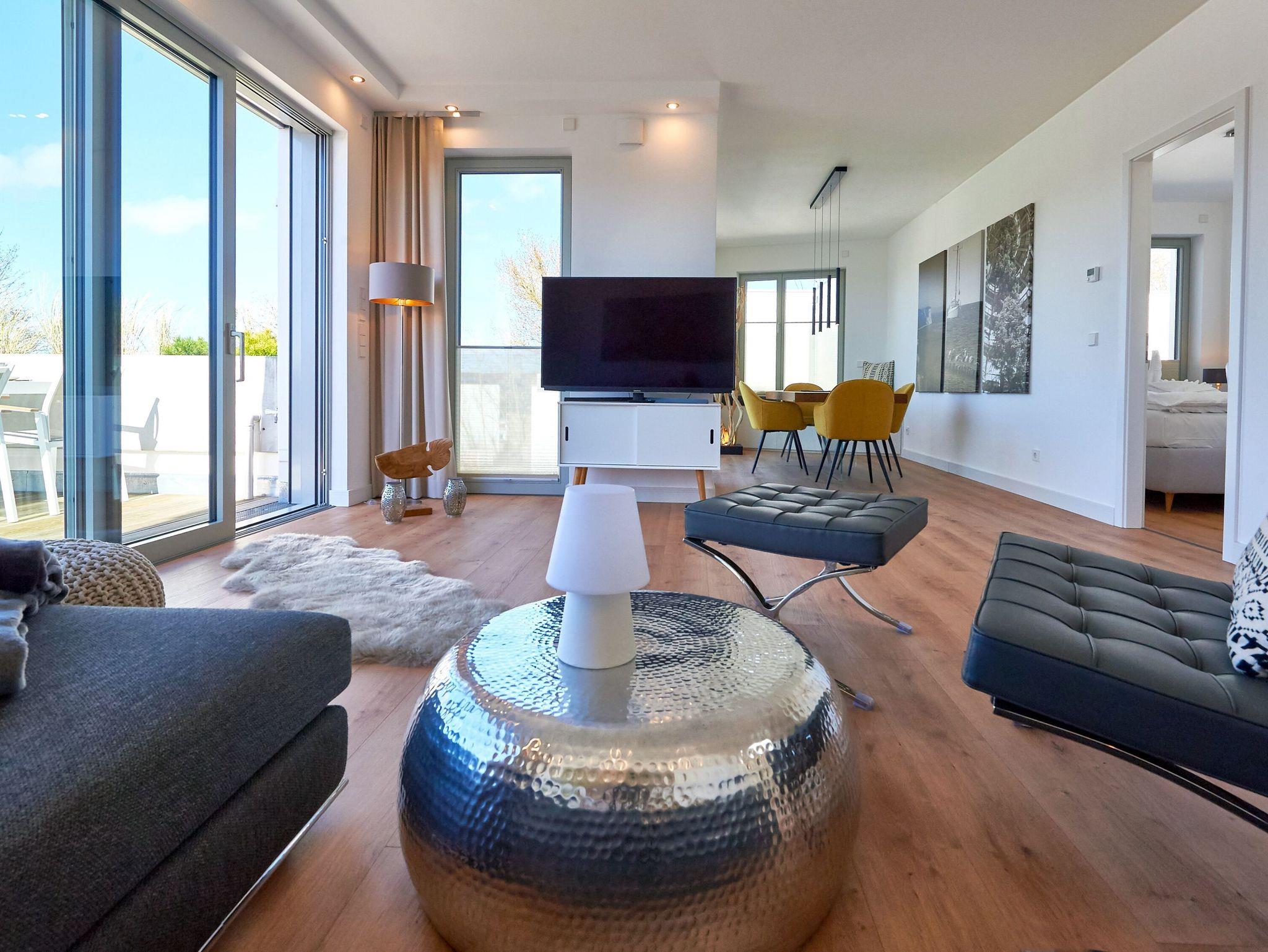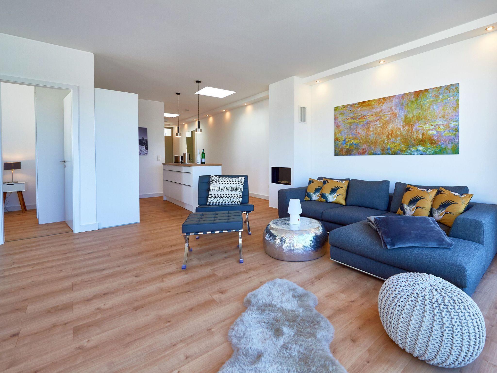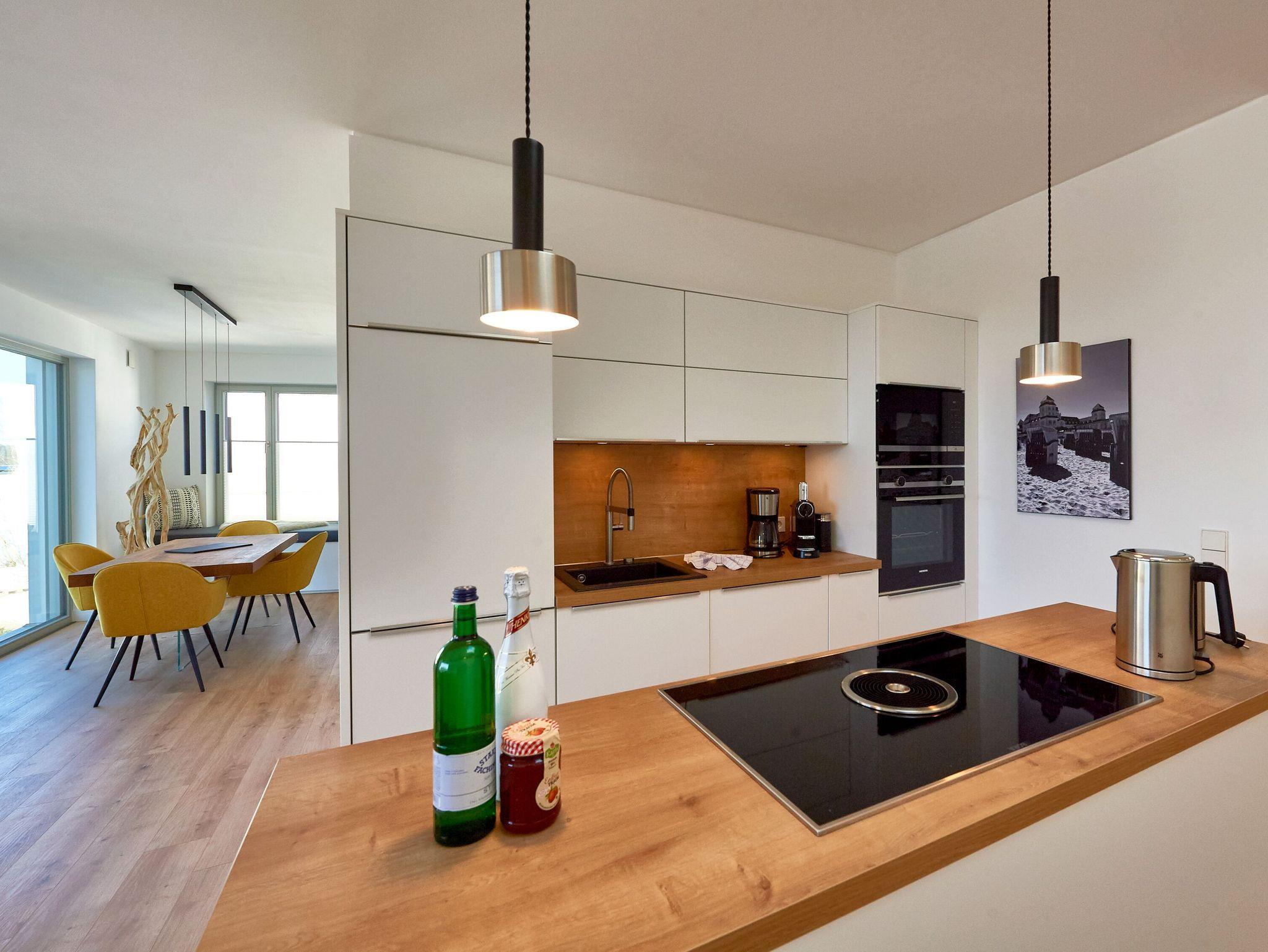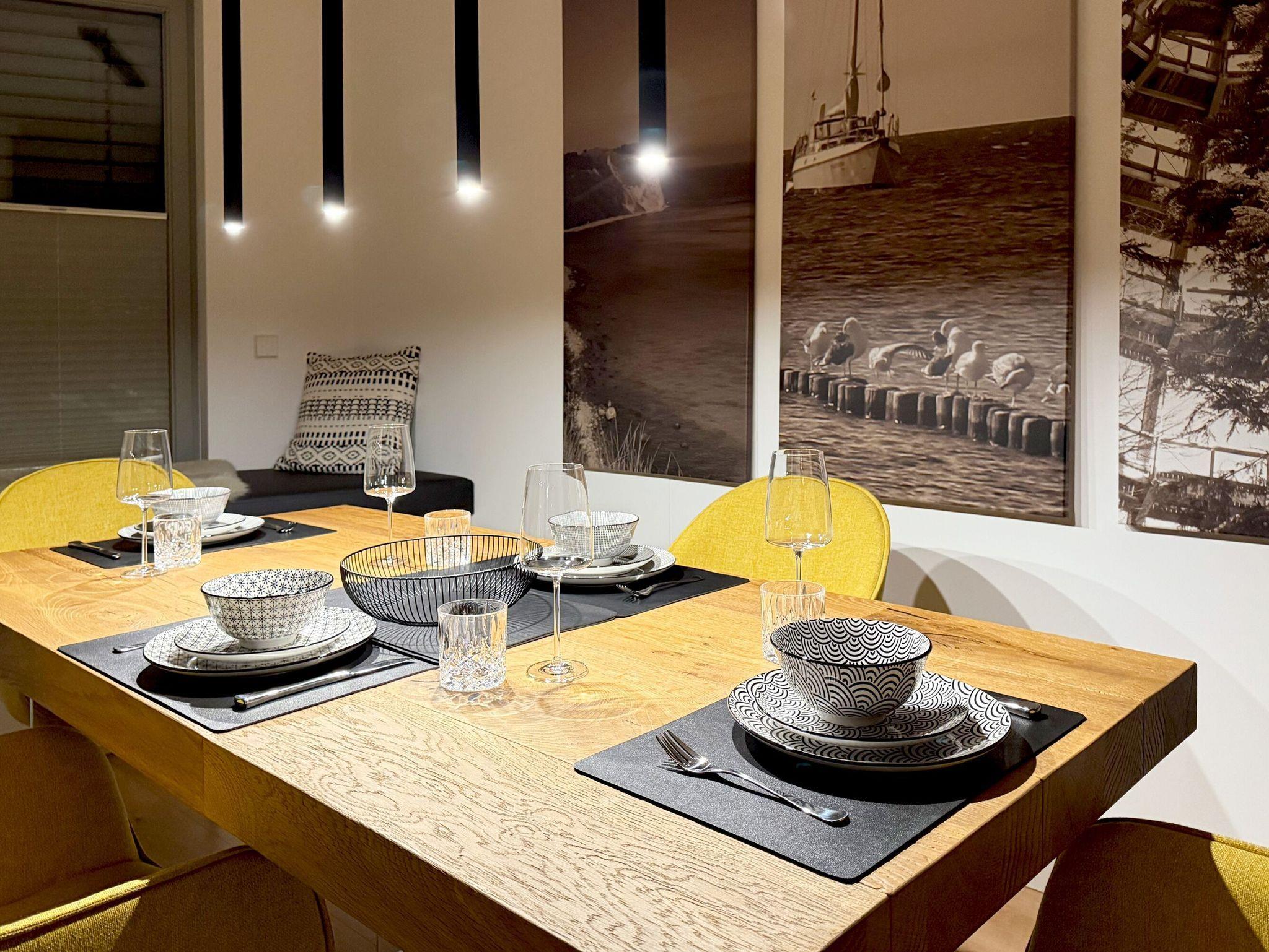 Das kombinierte Wohn- und Esszimmer mit offener Küche und geschmackvoll ausgesuchten Bildern und Dekorationen bildet das Herzstück der Wohnung. Ein großes, komfortables Sofa mit Recamiere, ein Barcelona-Chair aus Echtleder mit Hocker sowie moderne Unterhaltungstechnik inklusive kostenfreiem W-LAN versprechen angenehme Stunden und Tage.