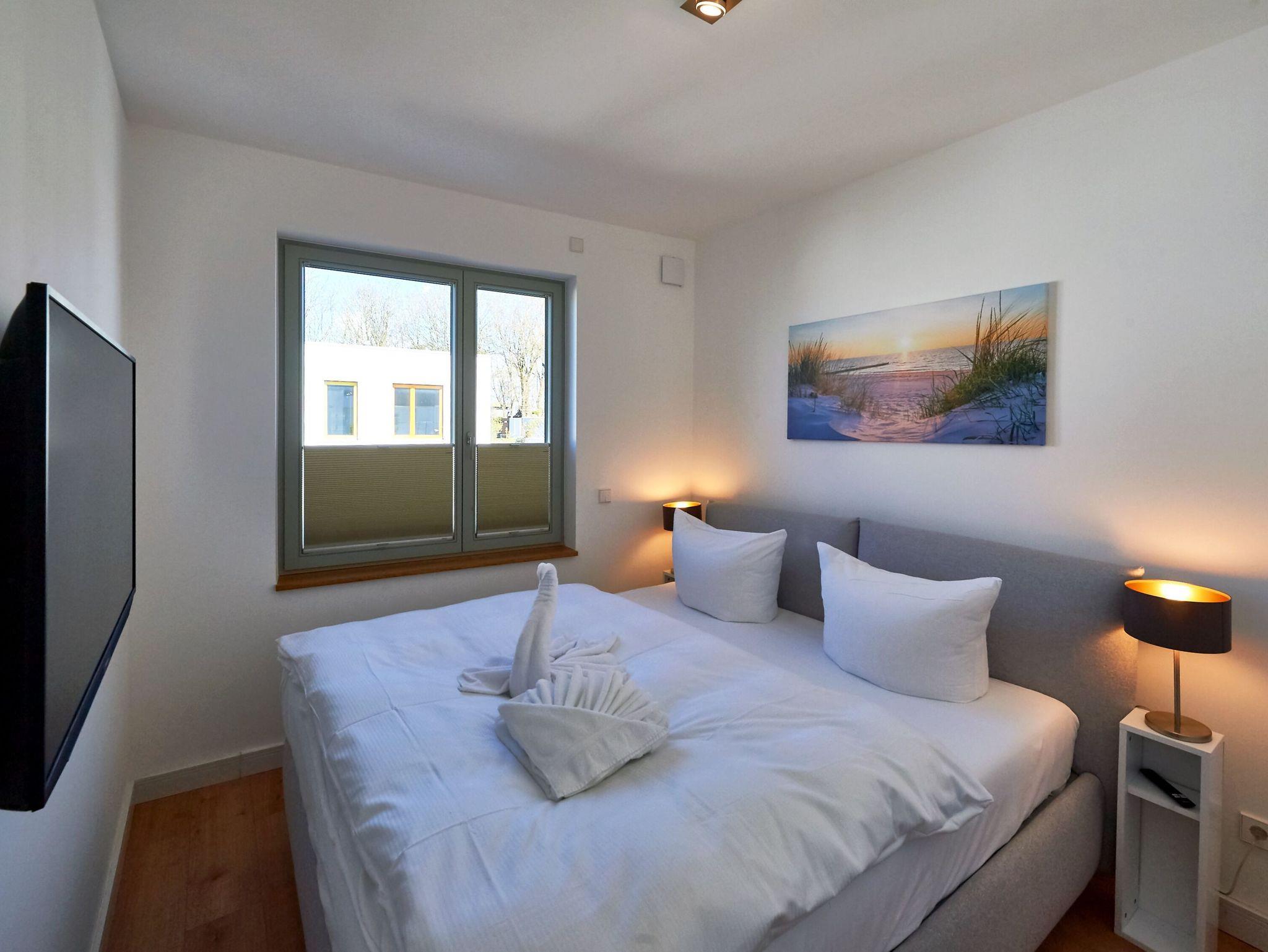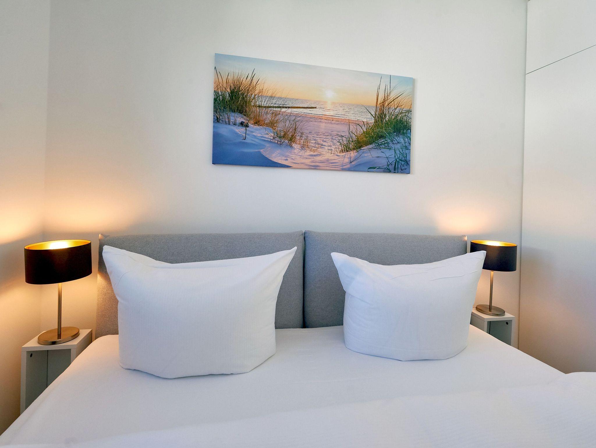 Die beiden separaten Schlafzimmer verfügen jeweils über ein herrlich bequemes Boxspring-Doppelbett (1,80 x 2,00 m), Nachttische mit Beleuchtung, einen großen Kleiderschrank für Ihre Urlaubsgarderobe sowie jeweils einen eigenen Fernseher. Ein Schlafzimmer verfügt darüber hinaus über eine kleine Loggia.