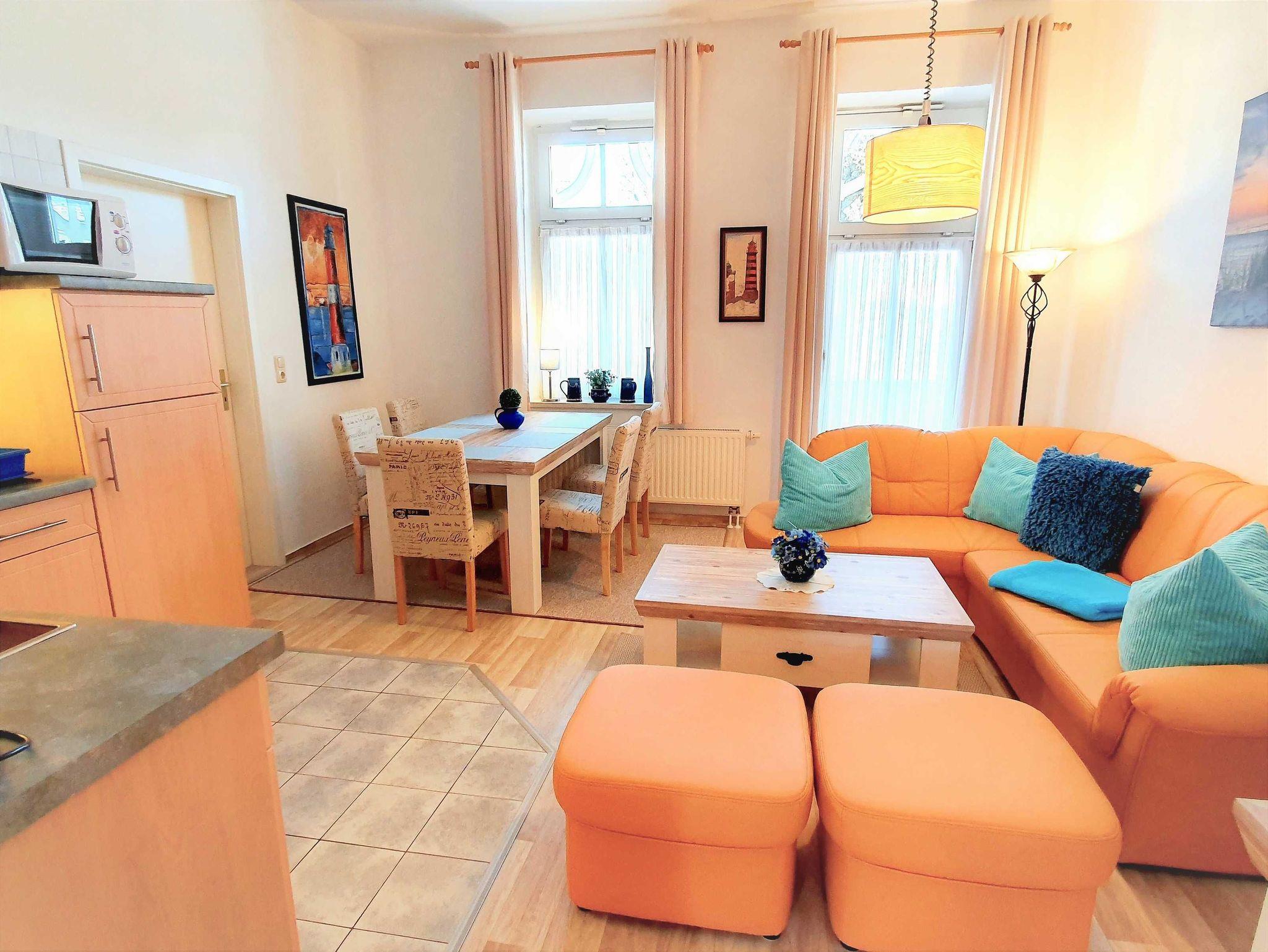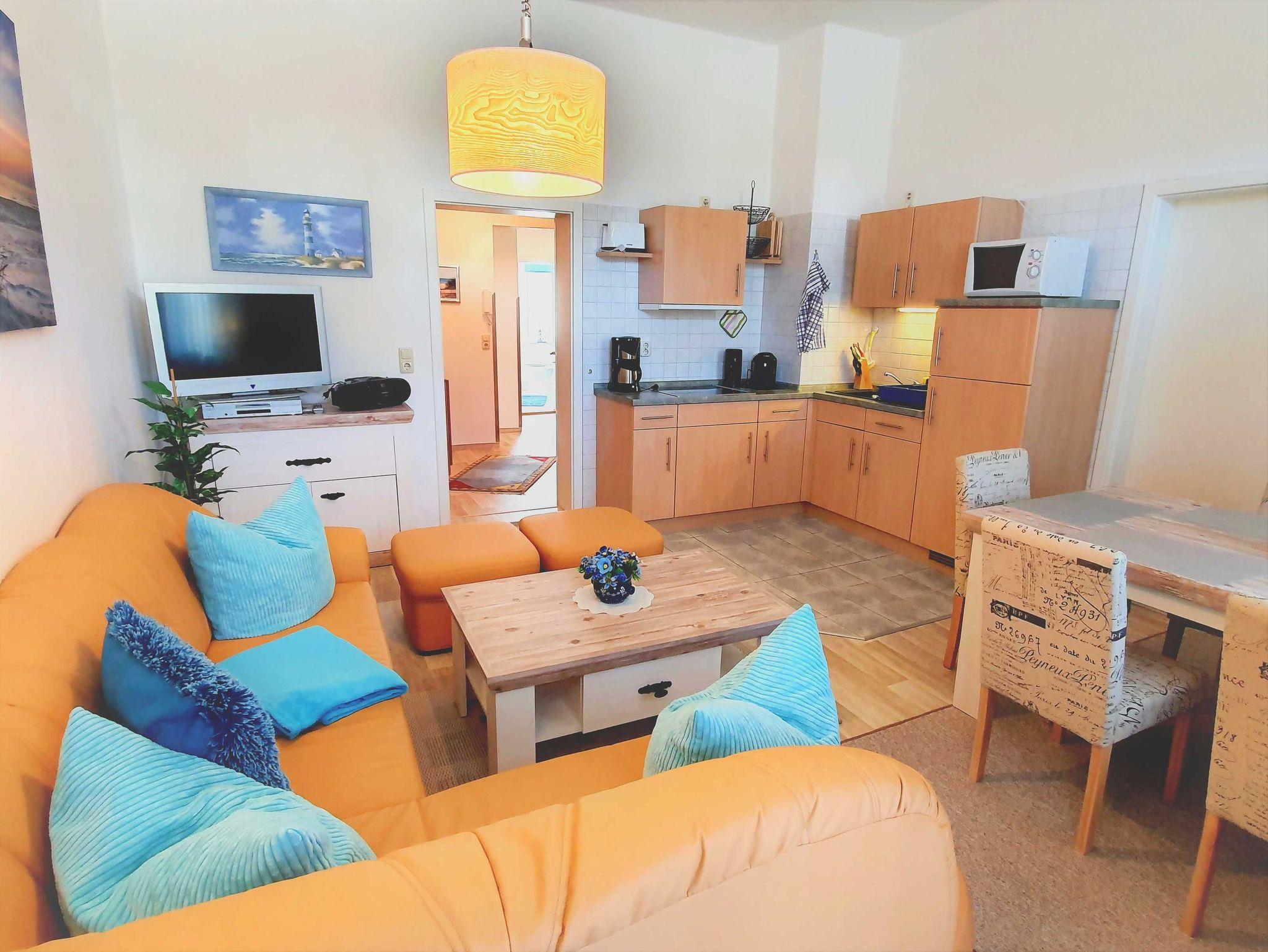 3-Raum-Ferienwohnung mit großem Balkon. 2 Schlafzimmer, ca. 88 qm, Du/WC, Nichtraucherwohnung, bis 4 Personen belegbar, Küchenecke, Essplatz, gemütliches Wohnzimmer. Das erste Schlafzimmer verfügt über ein Doppelbett und ein Einzelbett und das 2. Schlafzimmer über ein Doppelbett. Das Mitbringen von Haustieren ist nicht gestattet.