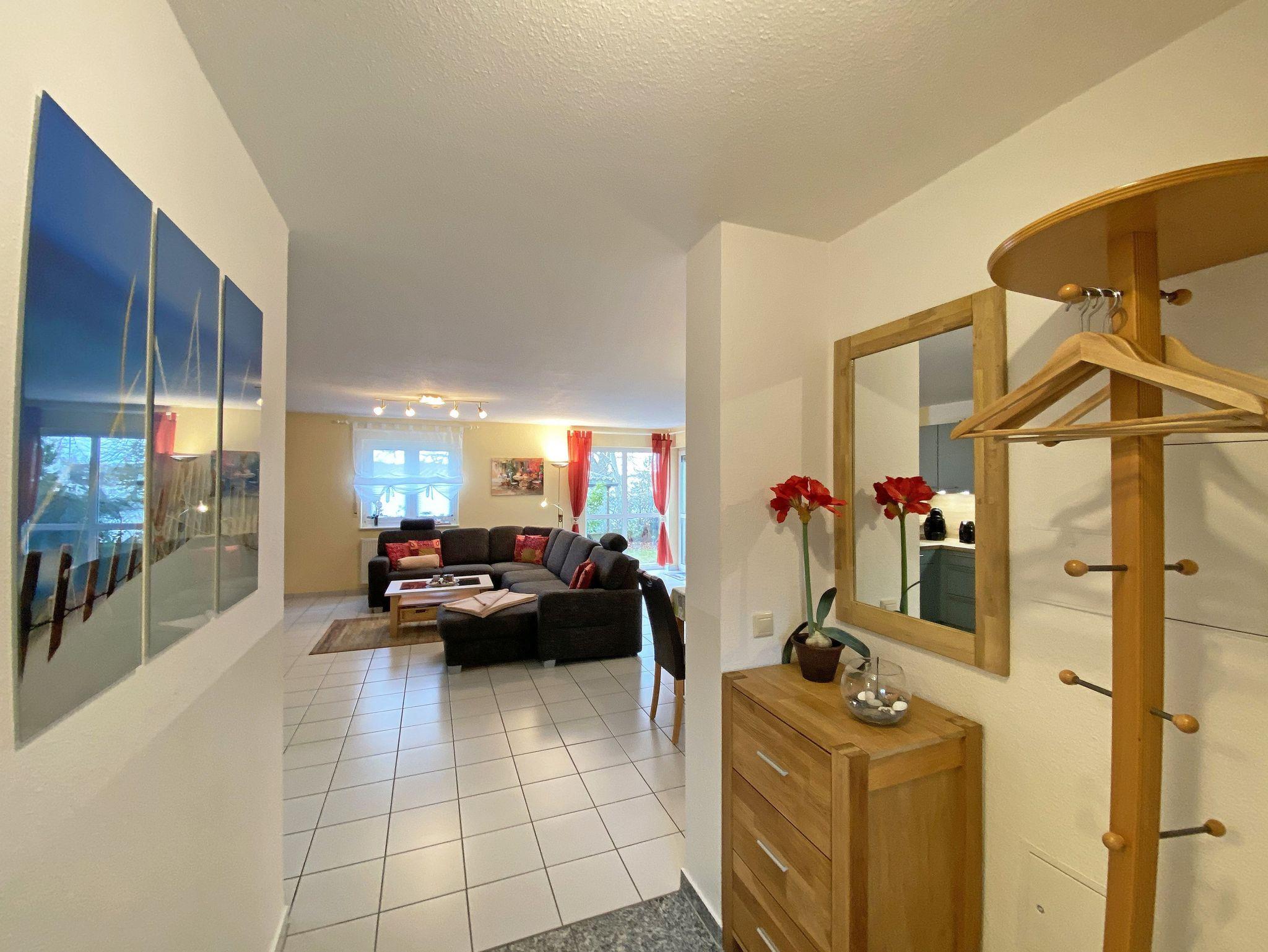 Die freundlich eingerichtete Nichtraucherwohnung umfasst ca. 68 qm und bietet Platz für 4 Erw. + 1 Kind bis 17 Jahre. Die 2 Raumwohnung im Erdgeschoss ist sehr großzügig geschnitten und verfügt über ein Schlafzimmer mit einem Doppelbett (á 0,90m x 1,90m), einem Einzelbett (0,90m x 1,90m), Nachttischkonsolen, Kleiderschrank sowie einen Zugang zur Terrasse. Im Wohn-/ Essbereich finden Sie eine Essecke mit zusätzlichen Stühlen sowie eine gemütliche Couchecke (mit Ausziehfunktion 1,40m x 2,10m), Tisch, Leselampe, Anrichte sowie Smart-TV und Blue- Ray-Player. Angrenzend haben Sie die komplett ausgestattete Küchenzeile mit Geschirrspüler, Kühlschrank + Eisfach, 4 Zonen-Ceranfeld mit Backofen, Kaffeemaschine, Tassimo Kapselmaschine, Toaster und Wasserkocher sowie diverse Küchenutensilien. Das Badezimmer mit Fenster ist komplett mit Marmorfliesen versehen und verfügt über eine Dusche mit flachem Einstieg, Waschtisch, Fön und WC. Die sonnige Terrasse, die Sie durch den Wohn- und Schlafbereich erreichen, lädt Sie ein Ihren Urlaubstag in Ruhe ausklingen zu lassen. Alle Räumlichkeiten sind gefliest und der Wohnbereich sowie das Schlafzimmer sind durch Außenrollos verdunkelbar. Ein kostenfreier WLAN- Zugang ist in der Wohnung vorhanden. Die Erstausstattung eines Wäschepaketes (komplette Bettwäsche, 1 Duschhandtuch, 1 kleines Handtuch) können Sie bis 14 Tage vor Anreise gegen einen Aufpreis dazu buchen oder durch eigene ergänzen. Ab 2 gebuchten Paketen erhalten Sie einmalig 1 Geschirrhandtuch und 1 Duschvorleger hinzu. Ein PKW-Stellplatz gehört zu Ihrer Wohnung dazu. Die Nutzung einer Wallbox mit 11KW Ladeleistung ist nach Verfügbarkeit und Voranmeldung vor Ort möglich. Bedingungen und FAQ`s sind vor Ort einsehbar. In einem Gemeinschaftsraum können Sie gegen eine Gebühr Waschmaschine und Trockner nutzen. Für unsere kleinen Gäste steht ein Kinderhochstuhl sowie ein Kinderreisebett (ohne Matratze und Bett Inlett) inklusive zur Verfügung. Für Ihre mitgebrachten oder geliehenen Fahrräder steht ein kleiner Fahrradkeller zur Verfügung sowie zusätzlich teilweise überdachte Fahrradständer.