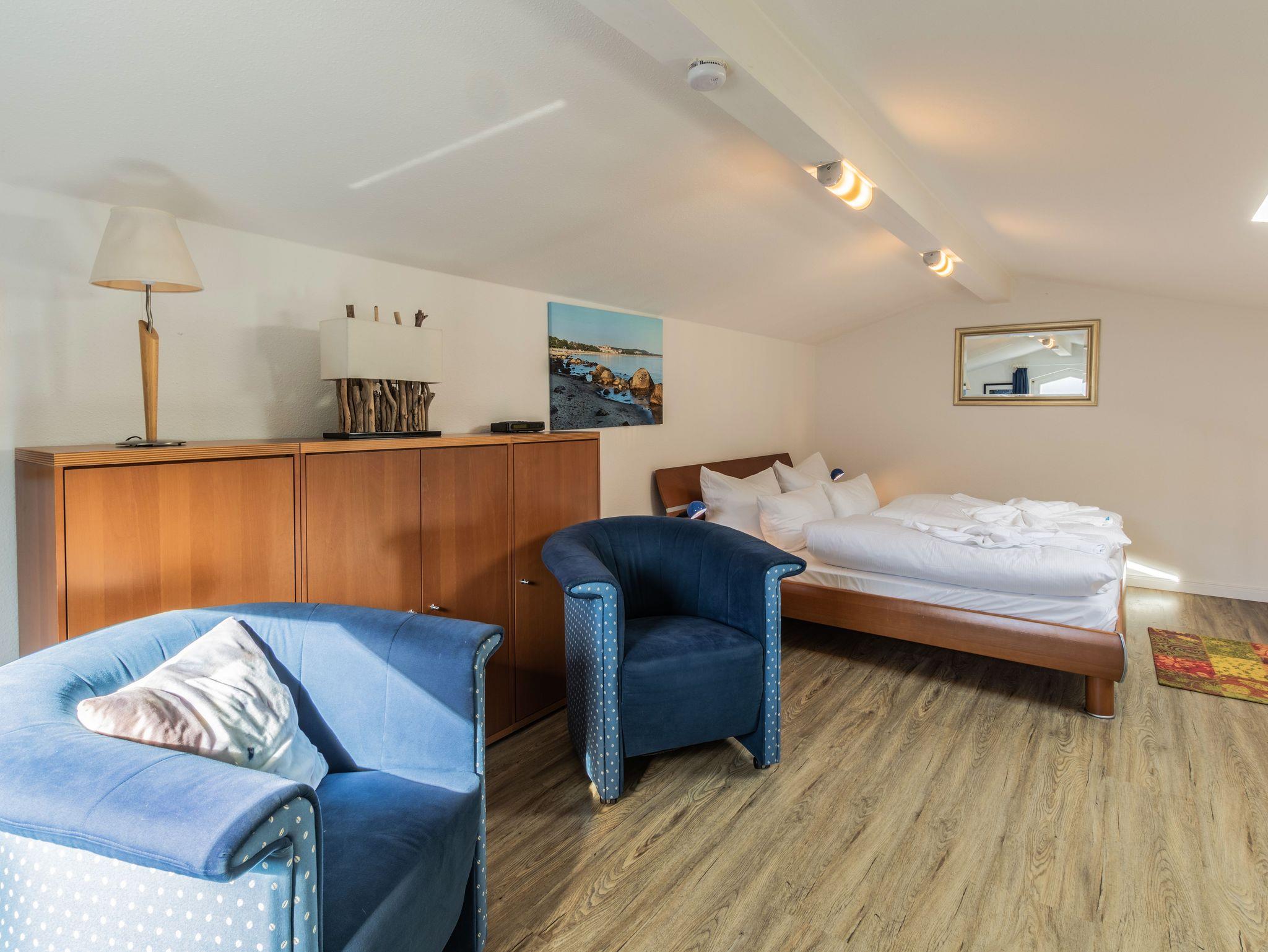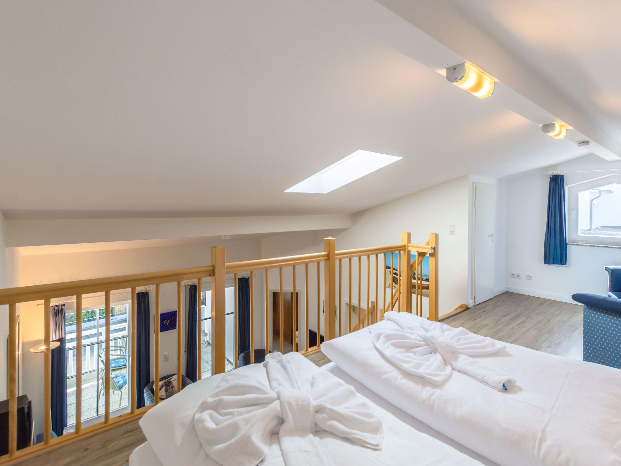 Ein Schlafzimmer ist mit einem Doppelbett und einem kleinen Kleiderschrank eingerichtet. In der Galerie befindet sich ein weiterer Schlafbereich mit Doppelbett sowie einem Kleiderschrank, der ausreichend Platz für Ihre Urlaubsgarderobe bietet.