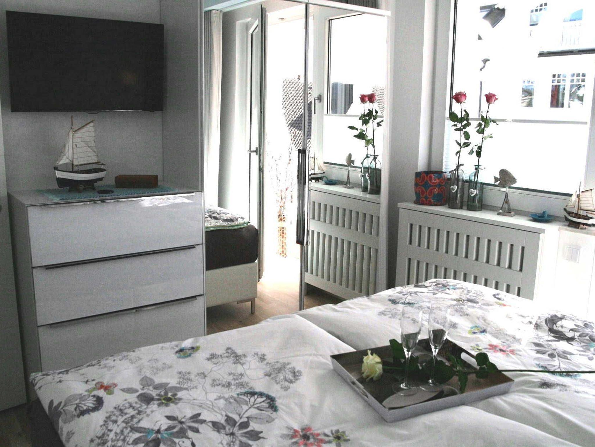 In dem modern, in Wohlfühlatmosphäre eingerichteten Schlafzimmer mit LED-TV befinden sich ein Boxspringbett (2x 90 cm x 200 cm) mit bequemen Matratzen der Härtegrade 3 und 2 sowie ein Kleiderspiegelschrank mit passender Kommode für Ihre Kleidungsstücke. Vom Schlafzimmer aus gelangen Sie ebenfalls auf den großen Süd-Balkon. Das Bad ist elegant und mit hochwertigem, beigefarbenem Marmor, einer Fußbodenheizung und einem Sprossenheizkörper und einer großzügig gestalteten, ebenerdigen Dusche mit Glaswand ausgestattet.