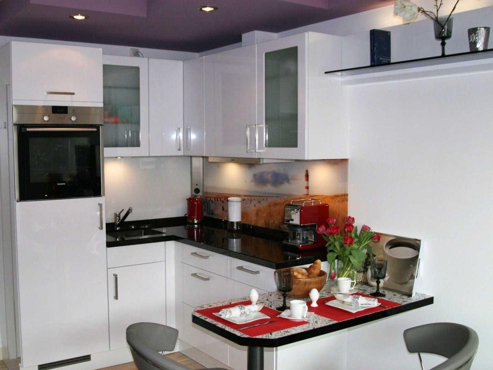 Ein heller Wohnraum mit offener Küche, einem Esstisch und einem hellgrauen, italienischen Echtledersofa lädt zum Verweilen und Relaxen ein. Es besteht eine kostenfreie Internet-WLAN-Verbindung. Folgende technische Ausstattung finden Sie vor: LG-Sound-System mit CD- und Smartphonefunktion, 3D-LED-TV, DVD-3D-Blue-Ray-Player. Der vorgelagerte, großzügige Süd-Balkon mit einer Fläche von 10 qm und Sitzgelegenheiten in anthrazitfarbener Rattanoptik dient zum Entspannen und Sonnen. Die moderne, weiße Küche in Hochglanz mit einer Granitarbeitsplatte ist mit einem Backofen, Cerankochfeld, Geschirrspüler, Kühlschrank inkl. Gefrierfach der Marke AEG ausgestattet.
