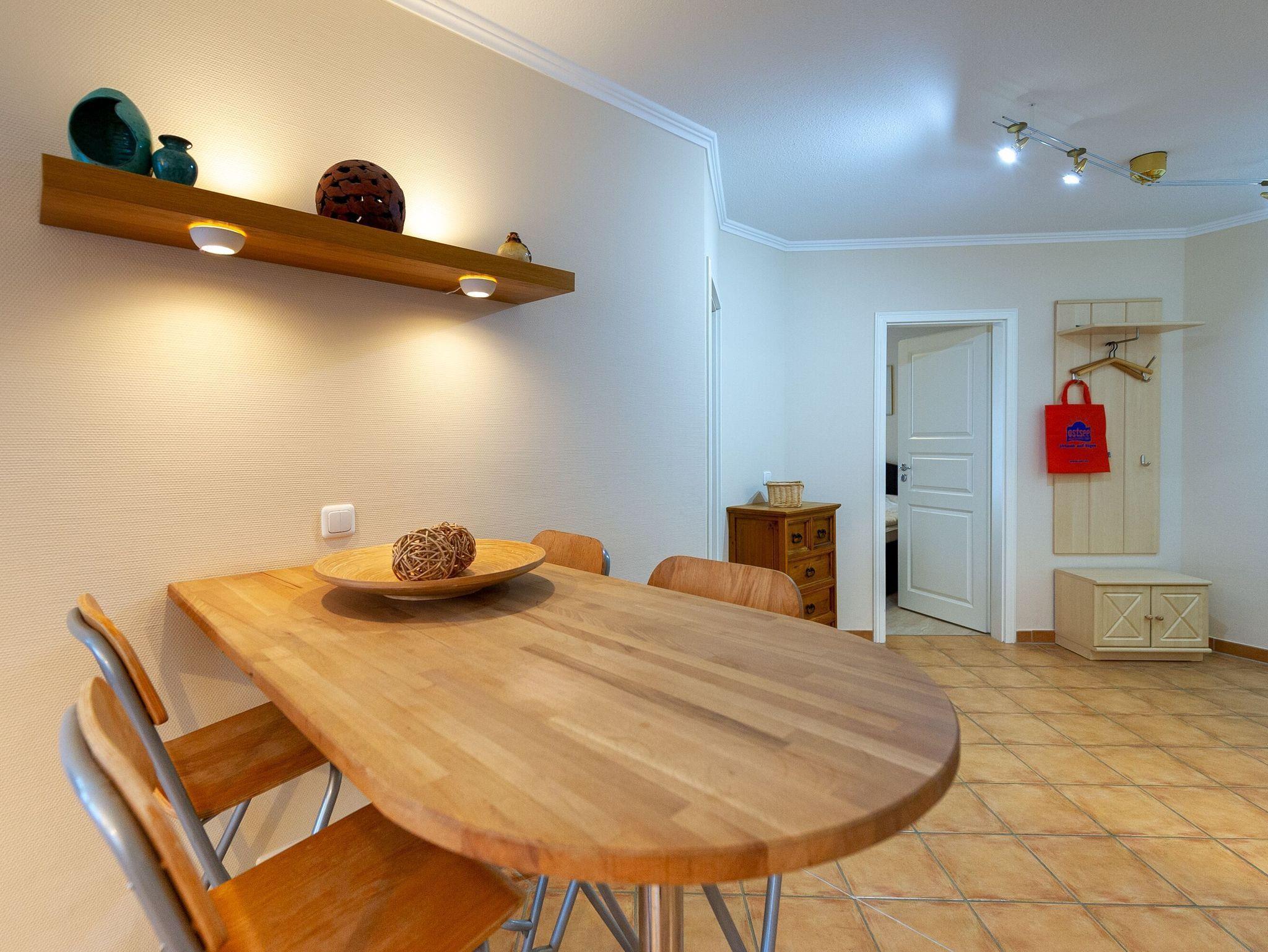 Der großzügige Wohnbereich mit bodentiefen Fenstern im Essbereich ist der ideale Ort, um nach einem erlebnisreichen Tag am Strand zu entspannen. Hier können Sie gemütlich entspannen, fernsehen, schmökern oder den Blick auf die Flaniermeile und den Buchenwald der Granitz genießen. Neben dem HD-TV stehen Ihnen zur medialen Unterhaltung eine Stereoanlage und kostenfreies W-LAN zur Verfügung.