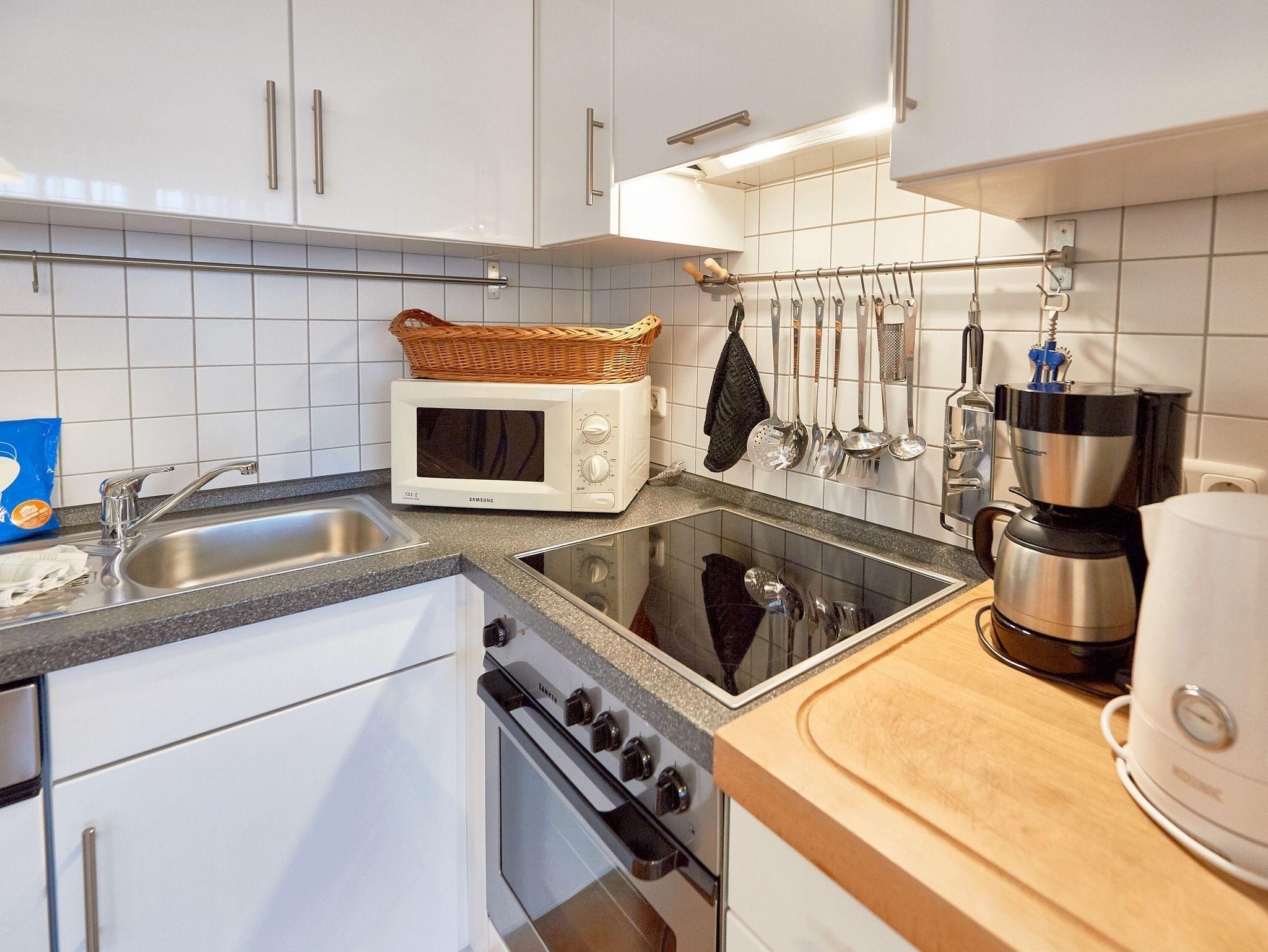 Die Küche ist umfangreich ausgestattet und verfügt u.a. über einen Geschirrspüler, eine Mikrowelle, ein Ceranfeld mit Backofen und Dunstabzug, einen Kühlschrank sowie natürlich eine Kaffeemaschine, einen Wasserkocher und einen Toaster. Bis zum nächsten Bäcker für die frischen Frühstücksbrötchen sind es übrigens nur wenige Gehminuten. Speisen können Sie wahlweise an einem runden Esstisch mit gemütlichen Korbmöbeln oder am Hochtisch vis-à-vis der Küche.
