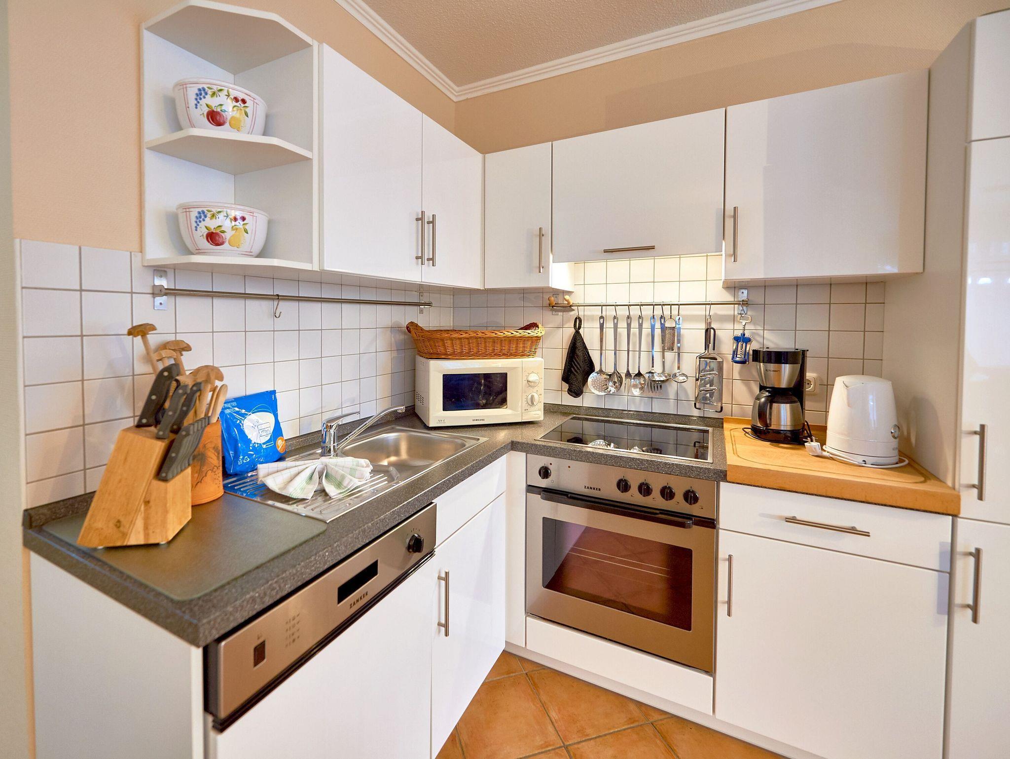 Die Küche ist modern und gut ausgestattet und verfügt u.a. über einen Geschirrspüler, eine Mikrowelle, ein Ceranfeld mit Backofen, einen Kühlschrank sowie natürlich Kaffeemaschine, Wasserkocher und Toaster. Bis zum nächsten Bäcker für die frischen Frühstücksbrötchen sind es nur wenige Gehminuten. Speisen können Sie wahlweise an einem runden Esstisch mit gemütlichen Korbmöbeln oder am Hochtisch vis-à-vis der Küche.