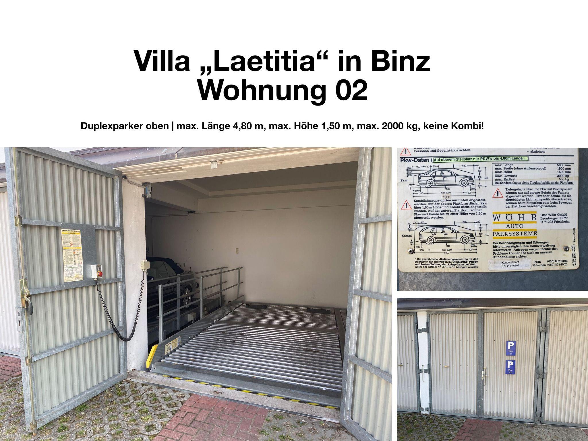 • 1 PKW-Stellplatz direkt am Haus (Duplexparker oben mit max. Höhe 1,50m, max. Länge 4,80m, max. Gewicht 2000kg, keine Kombis!)
