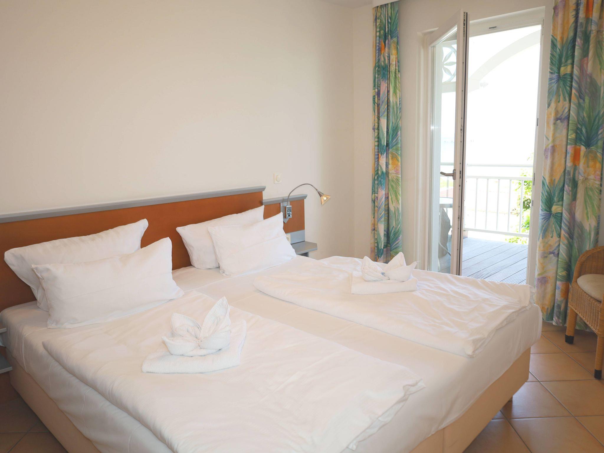 Das Schlafzimmer verfügt über ein komfortables Doppelbett, einen großen Kleiderschrank mit Safe und ebenfalls direkten Zugang zum Balkon ? ideal, um schon am Morgen die frische Meeresluft zu genießen. Das Badezimmer ist mit einer Eckdusche, WC und Fön ausgestattet.