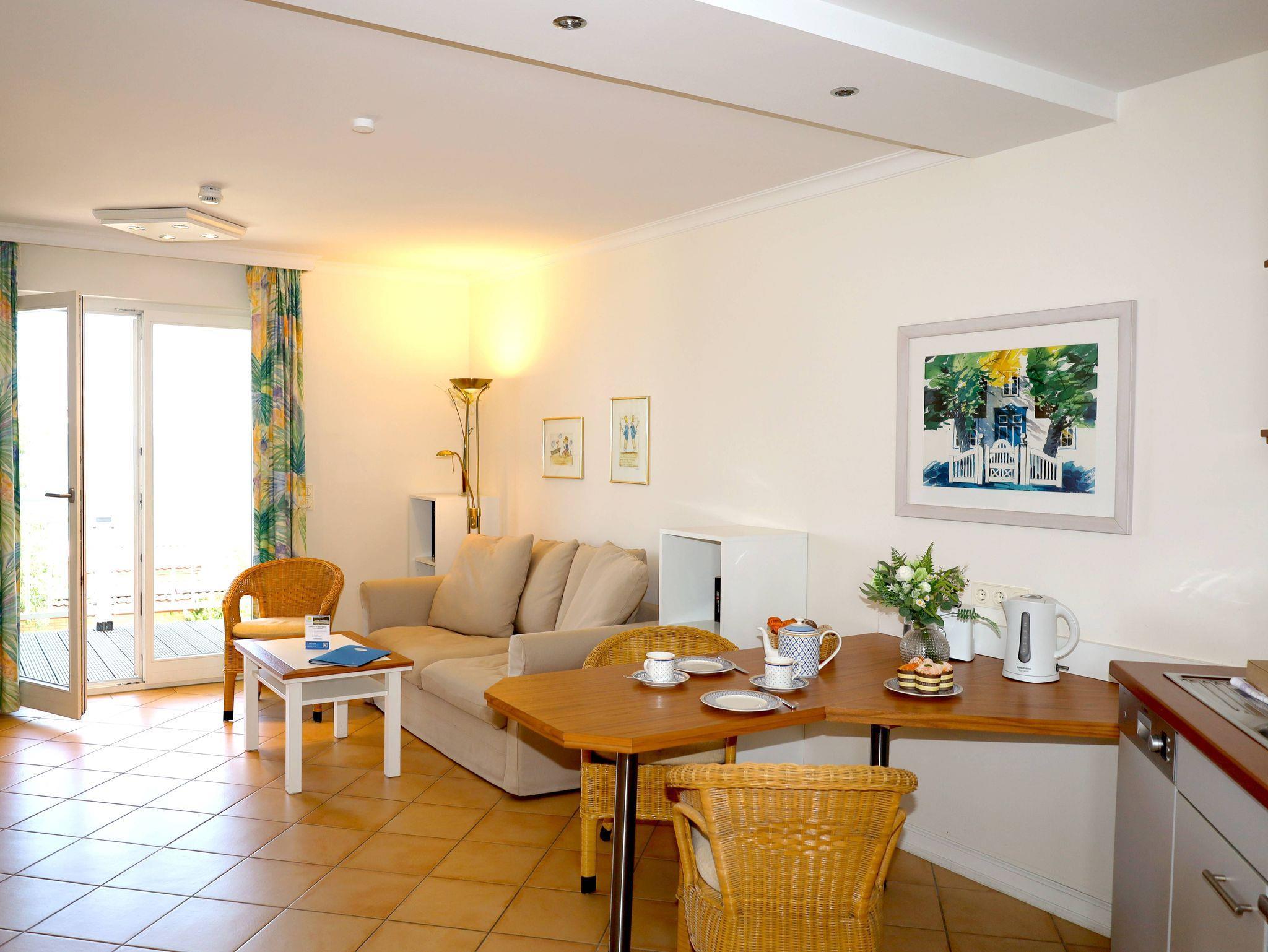 Dieses stilvoll eingerichtete 2-Raum-Appartement im 1. Obergeschoss der Villa bietet auf ca. 47 m² den perfekten Rückzugsort für erholsame Urlaubstage. Die Nichtraucher- und haustierfreie Wohnung besticht durch ihren großen, möblierten Balkon mit frontalem Ostseeblick, den Sie sowohl vom Wohnzimmer als auch vom Schlafzimmer aus betreten können.