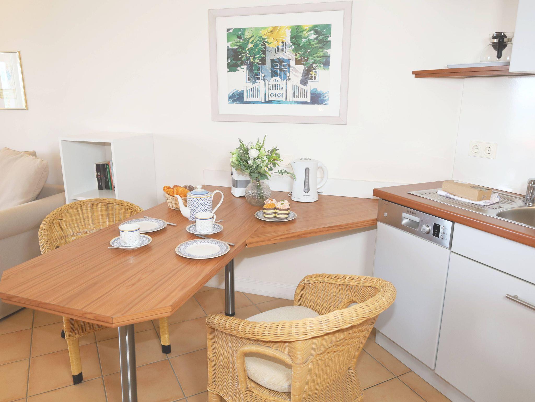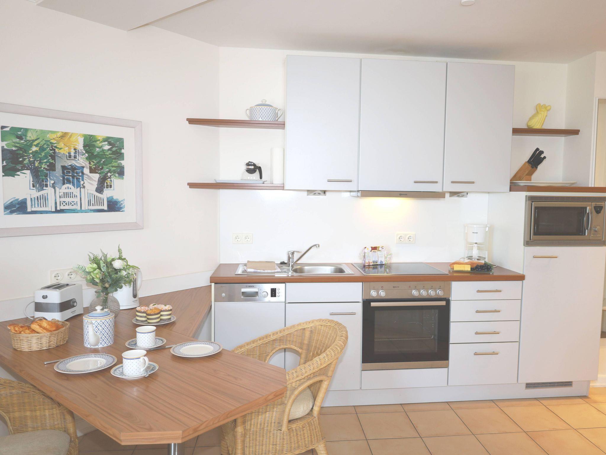 Im hellen Wohnzimmer erwarten Sie ein Flachbild-TV, eine Stereoanlage mit CD-Player und eine gemütliche Sitzlandschaft, die zu entspannten Stunden einlädt. Die moderne Küchenzeile ist vollständig ausgestattet mit Geschirrspüler, Ceran-Back-Herd, Mikrowelle sowie praktischen Extras wie Kaffeemaschine, Toaster und Wasserkocher.