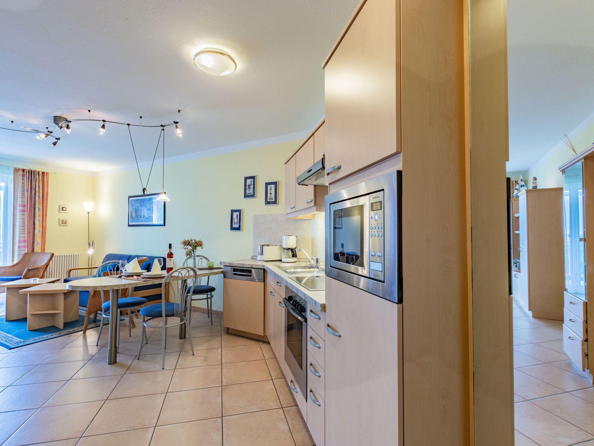 Die Wohnung verfügt über einen möbilierten Balkon mit frontalem Ostseeblick. Der grosse offene Wohnraum verfügt über einen Flachbildschirm-TV von der Firma „Loewe“, Stereoanlage mit CD-Player, sowie einer bequemen Sitzlandschaft mit Schlaffunktion. Die Küchenzeile ist komplett ausgestattet mit Geschirrspüler, Ceran-Back-Herd, Mikrowelle und weiteren nützlichen Geräten wie Kaffeemaschine, Toaster, Wasserkocher etc. Das Schlafzimmer mit komfortablem Doppelbett und Kleiderschlank mit Safe verfügt über einen direkten Zugang zum grossen Balkon. Badezimmer mit Eckdusche, WC und Fön.