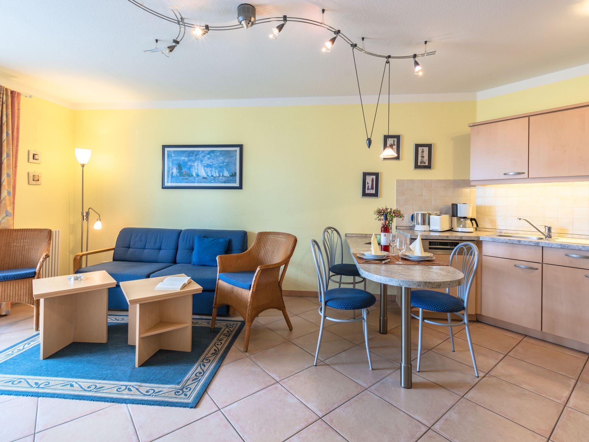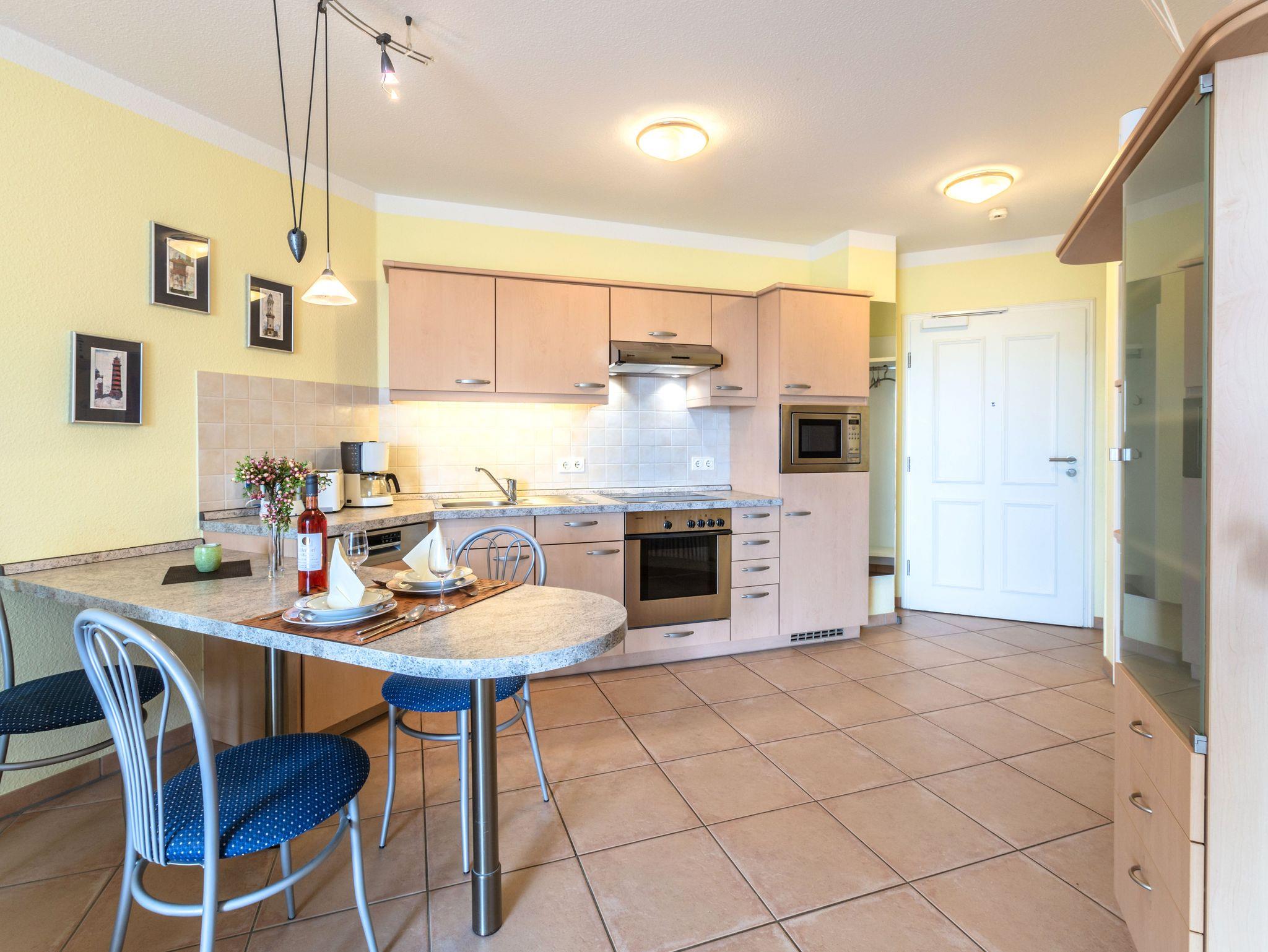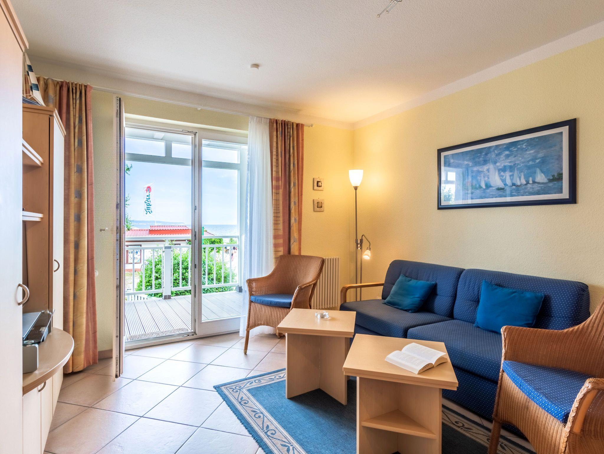 Das 2-Raum-Apartment befindet sich in der Hochpaterre und ist für bis zu 4 Personen geeignet. Das Apartment verfügt über einen Balkon mit frontalen Meerblick.